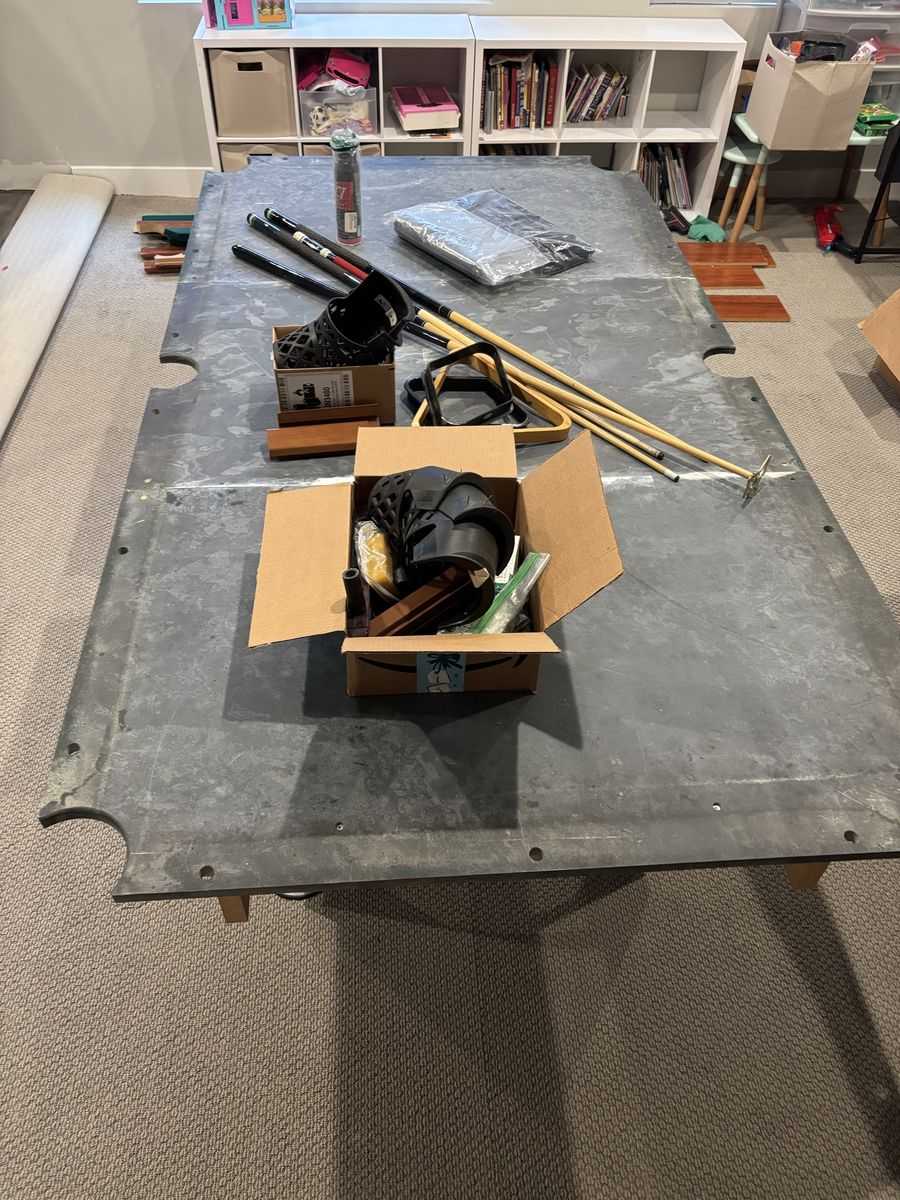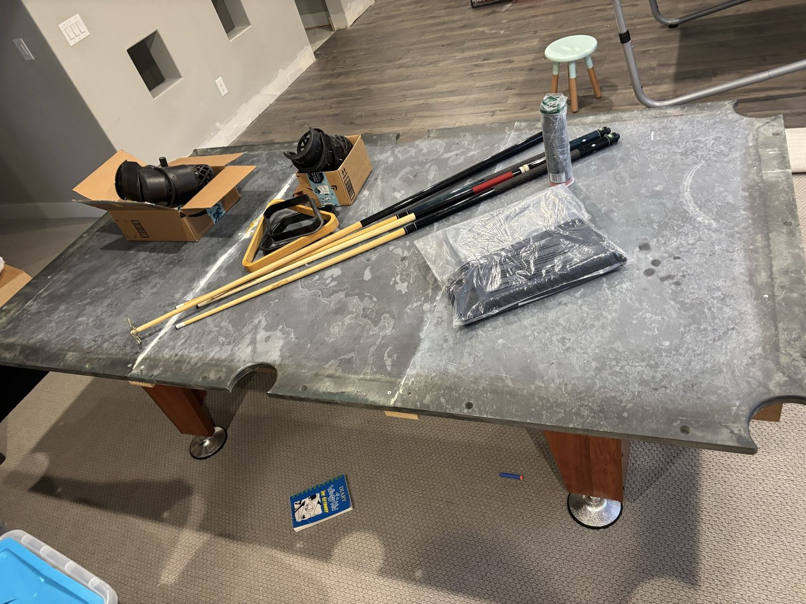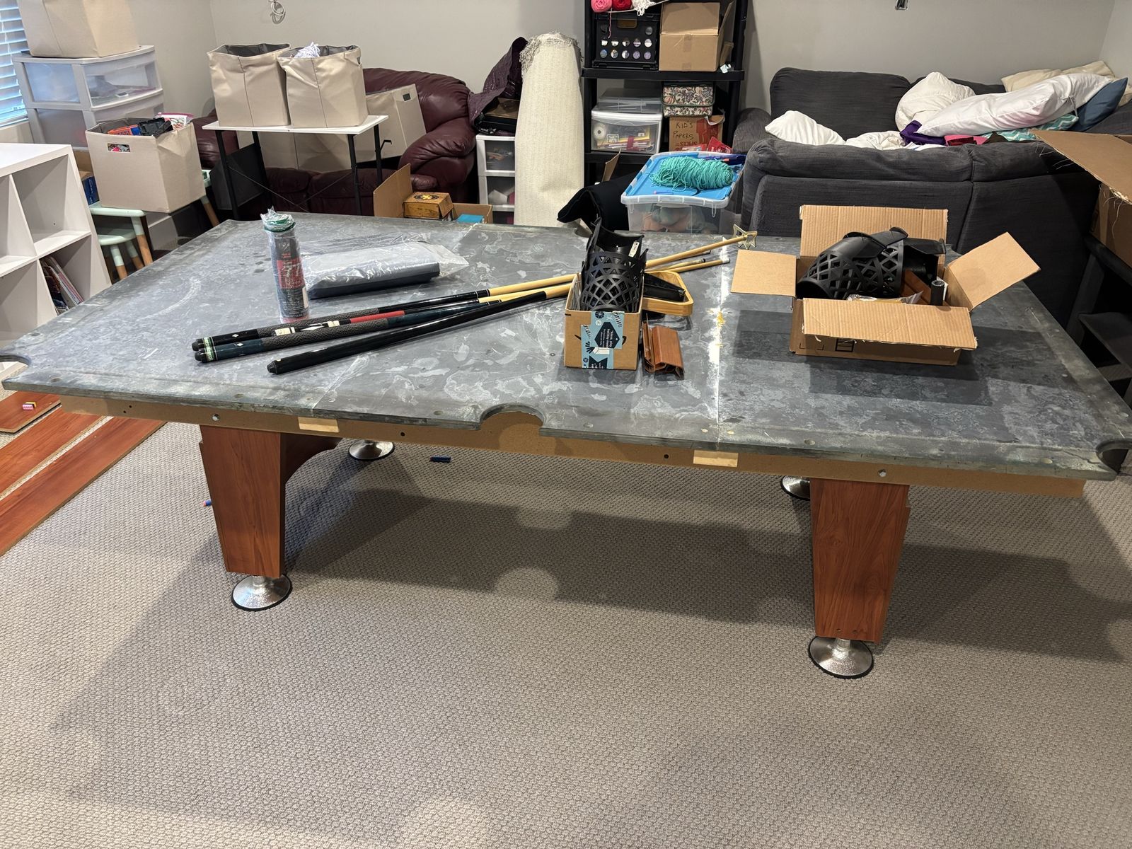 Full size, pool table with bumpers, pool, cues, and full set of balls. Comes with a ping pong net and table cover also (not shown). COMES WITH DARK BLUE NEW FELT ANS ADHESIVE, AND BEESWAX for slate leveling.
