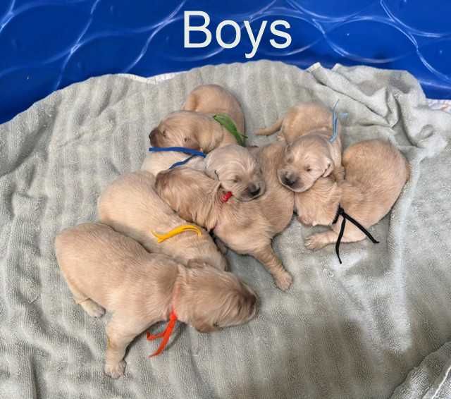 GooglePayBorn on April 1st. They will be 8 weeks old on May 27. We have 4 female pups and 7 male pups. The first two photos are of the parents. Mom is red, and Dad is cream. Some of the puppies will be cream-colored, and some will be golden-colored. Both parents are athletic, intelligent, and super sweet-natured. These beautiful puppies will be perfect as family companions or field dogs. We start potty training for you! First vaccinations, worming, health check, socialization, and full AKC papers included in price. Pick up in Pocatello, or we will deliver within 3 hours for a $100 puppy nanny fee. Reserve your pick for a $250 deposit today! Stay tuned for updated photos and videos.