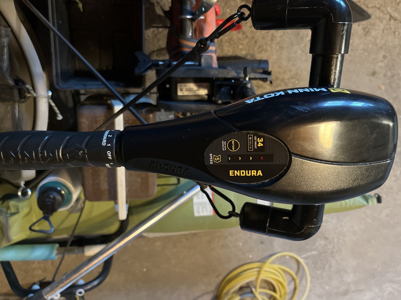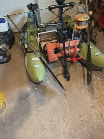 Fishing kick boat with new electric minkota trolling motor only used 2 times. Runs great. Seat connects to motor for steering just turn the seat and the motor turns in the direction you want to go. Has three rod holders two for fly rods.. has anchor and hand crank that works great! Has Fishing net holder. Also has Fishing accessory tray that turns and locks in front of you for unhooking fish and putting accessories. Must see!