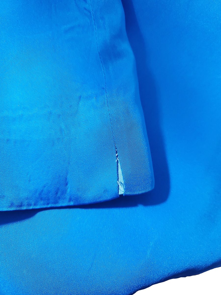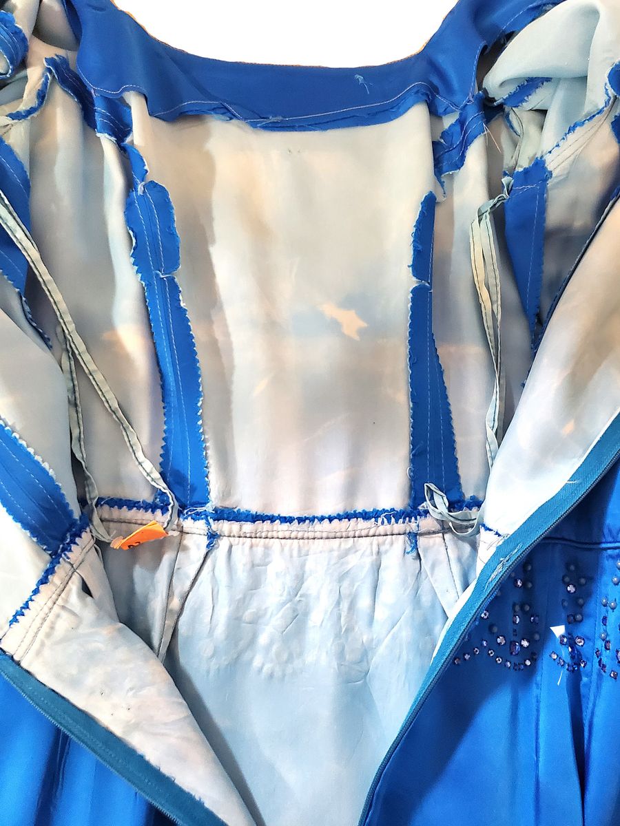 Small seam split on bottom of right side. Should be easy to repair. Dry cleaned then stored. SEE ALL PHOTOS.