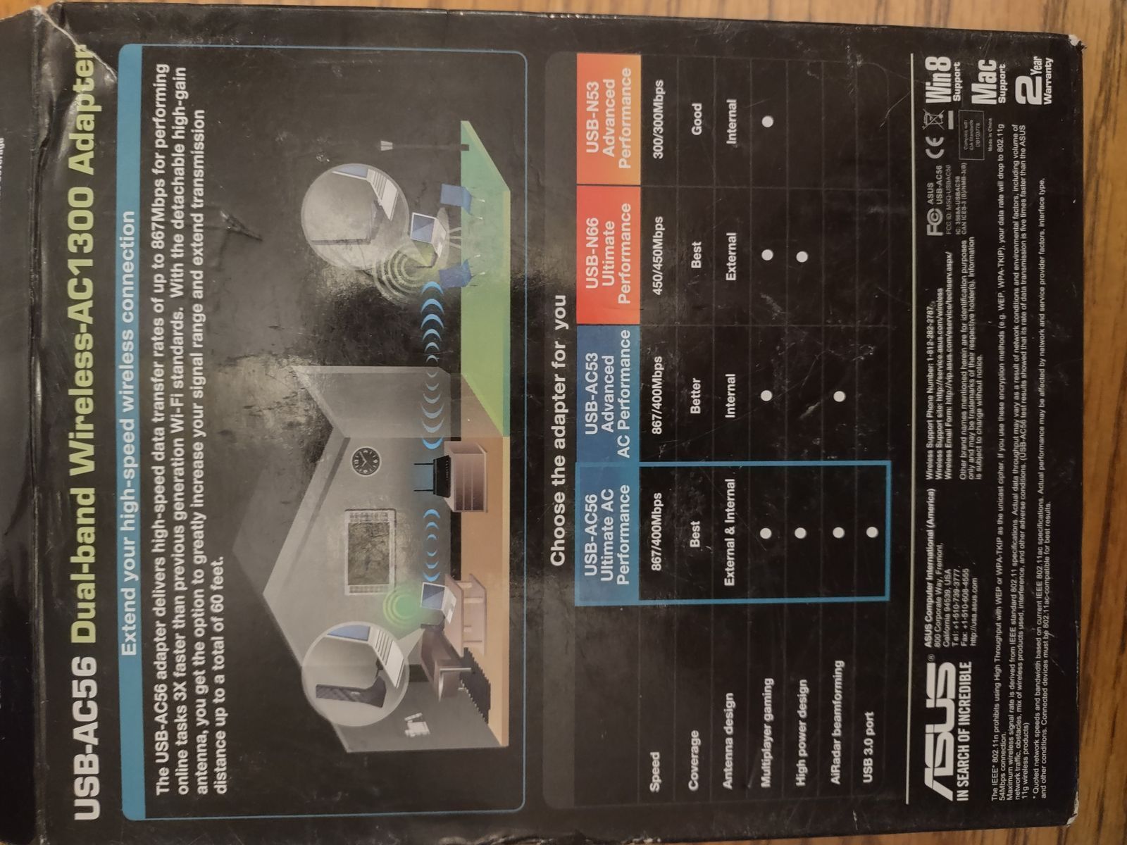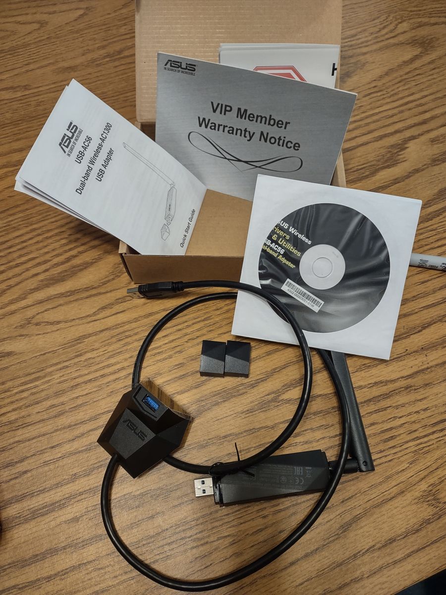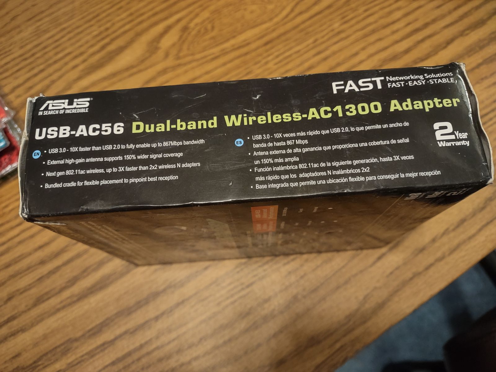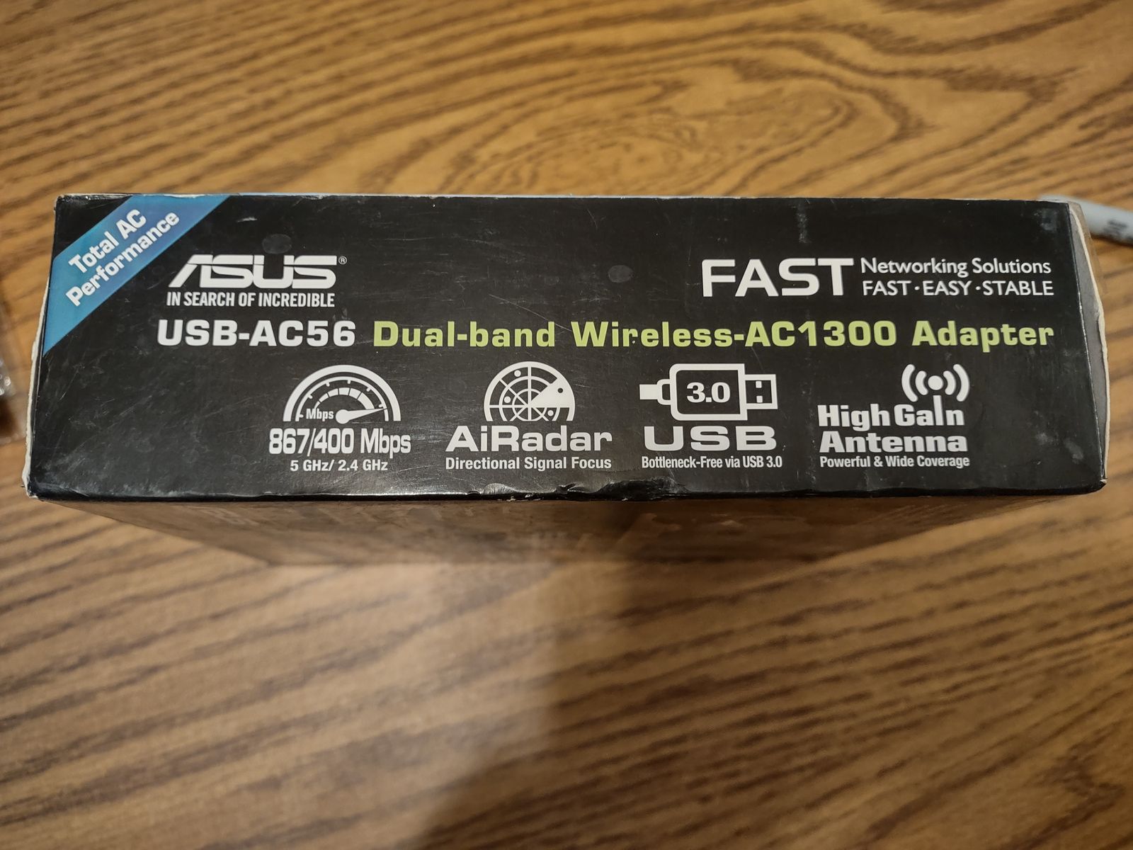 VenmoASUS BRAND, DUAL-BAND WIRELESS-AC1300 USB-AC56 WIRELESS ADAPTER. NEW. STILL IN BOX. See all 5 photos of every side of the box to answer all your questions about this item. Currently retailing on eBay for $40 and $80 used. ONLY $25 Cash/Venmo. In Sandy. 801-201-5350.