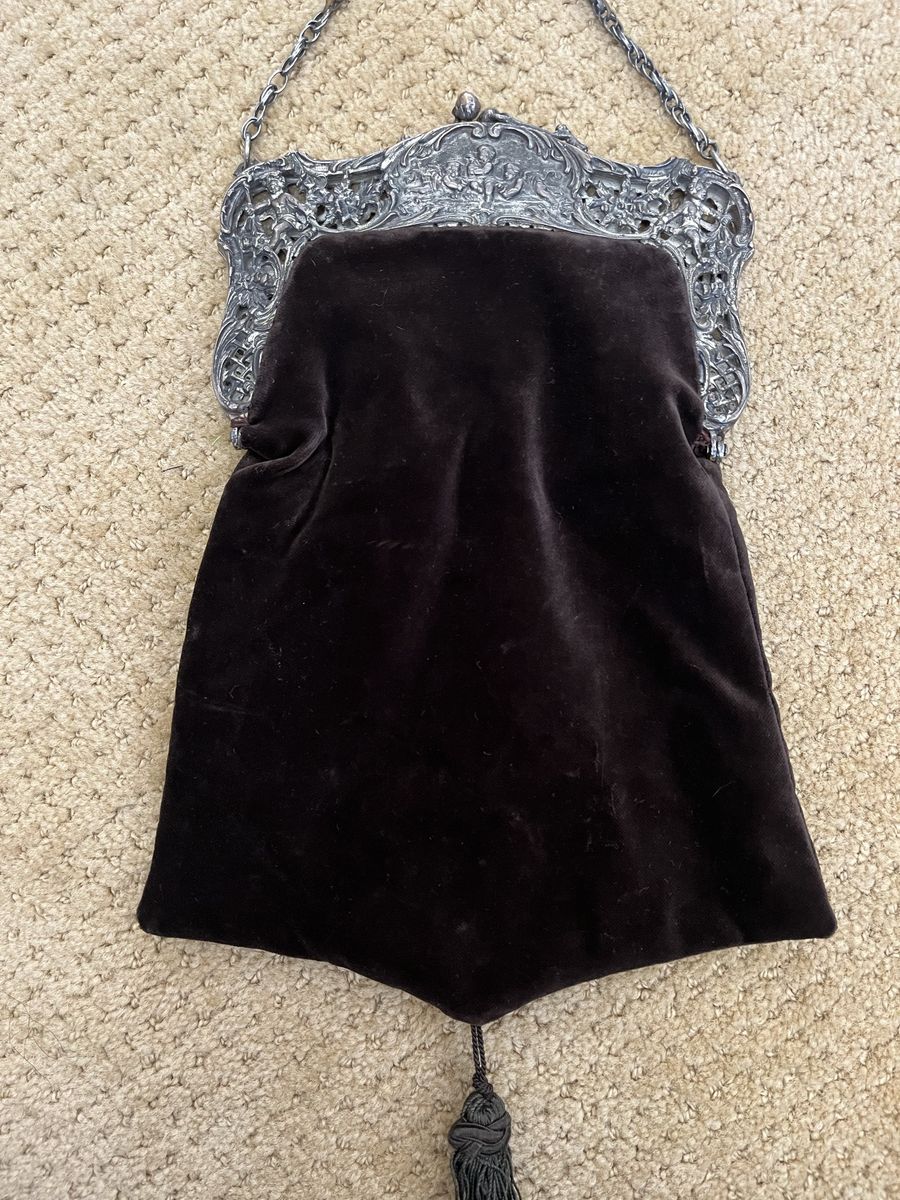 VenmoThis is a stunning and beautiful one of a kind find. It has a lovely pattern on the metal silver frame. It is embossed and has a cut out style. There are five cherubs on each side of the purse frame. By the clasp at the top of the purse are three cherubs. There are also cherubs on each edge of the purse frame. The frame has the same wonderful detail on each side, cherubs, leaves, and flowers. It is a heavy frame. This has a interlocking silver chain for the handle. The dark brown velvet and fun tassel at the bottom of the purse are in excellent condition. The inside of the purse is lined with a lighter brown satin/silk material. It shows some wear, which is very common for something this old. This is a large purse. I believe this is from the 1800's to very early 1900's. It has a Edwardian and a Art Nouveau feel to it. Overall the purse measures 20 inches long. From the top of the chain handle to the bottom of the tassel. From the bottom of the purse to the bottom of the tassel is 5 inches. Serious inquiries only. Helping a parent to sell. This is a must see piece!