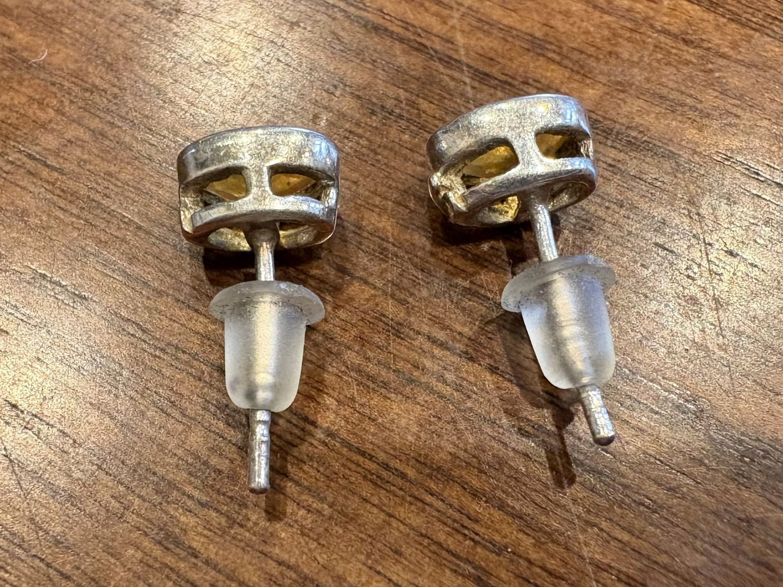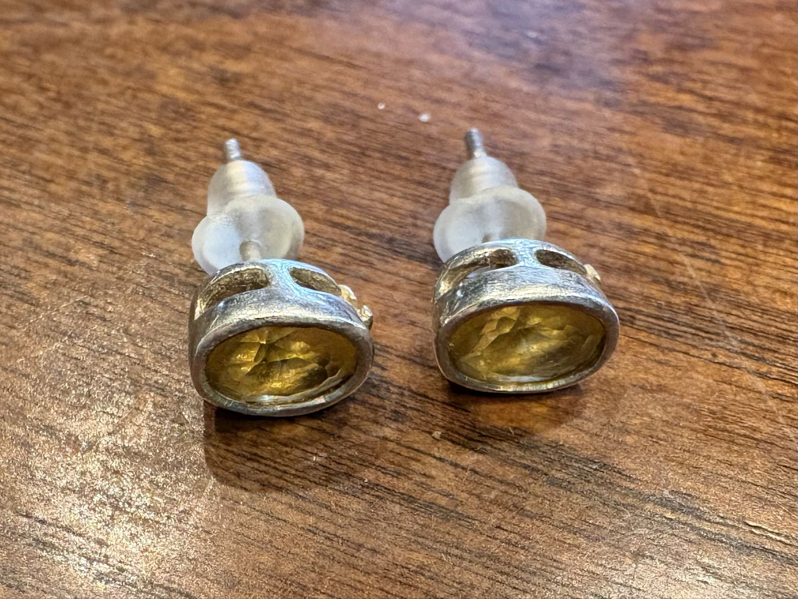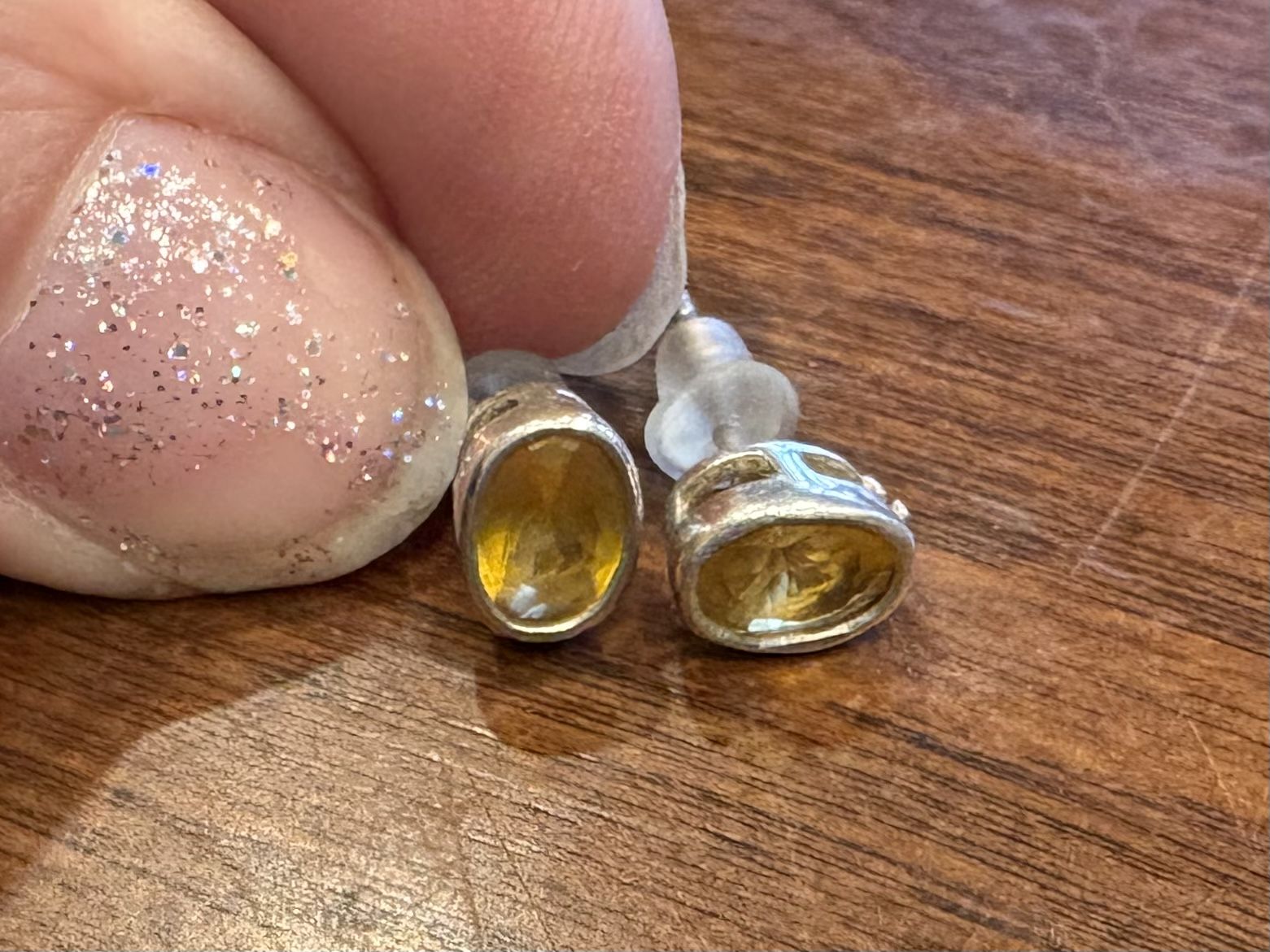 I have a pair of yellow oval stud earrings. They are sterling silver with citrine stones. The backs are soft rubber or silicone. The oval is 7 mm long (about 5/16 inch). See my other ads for jewelry, artwork, home decor and more.