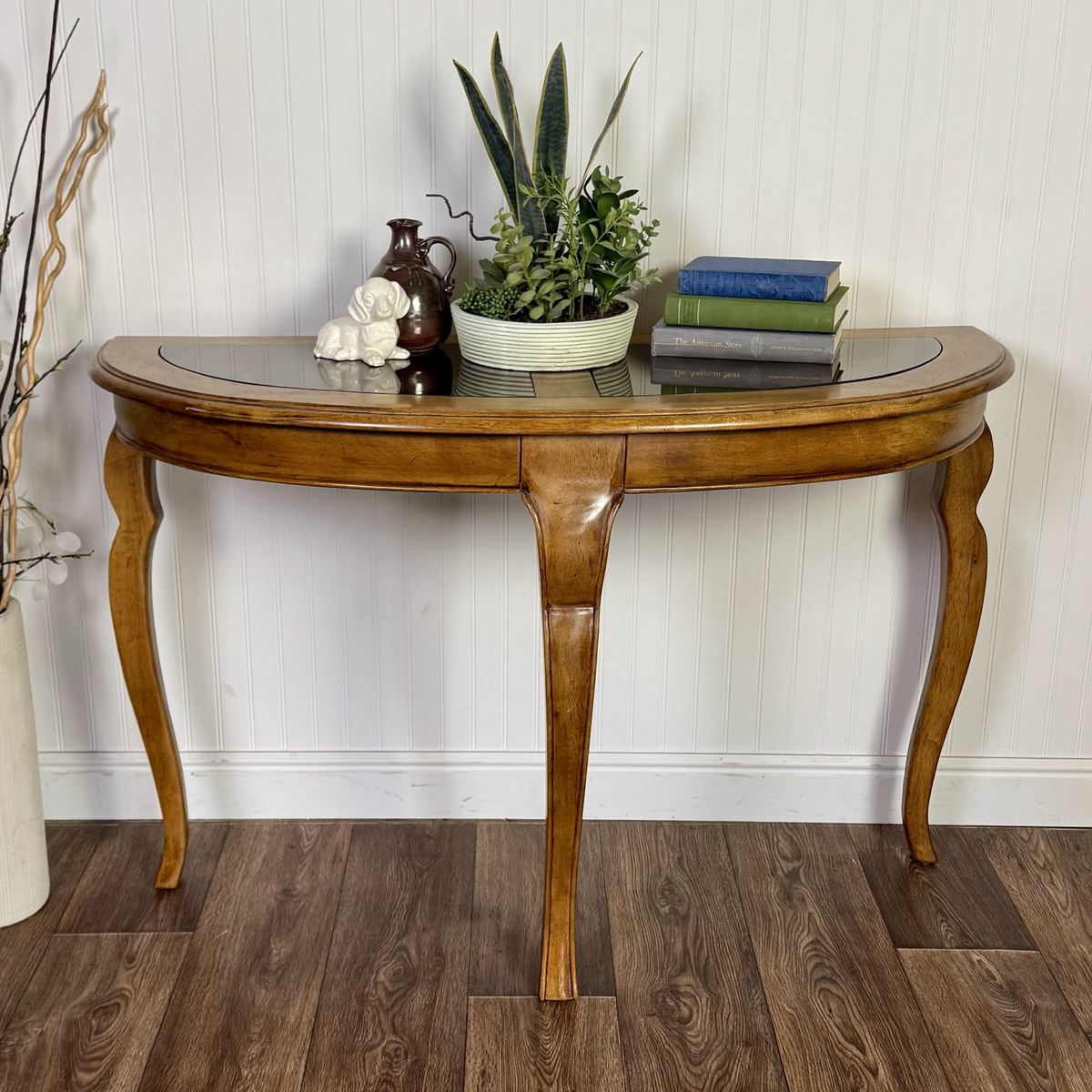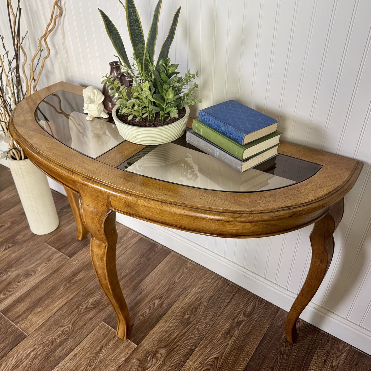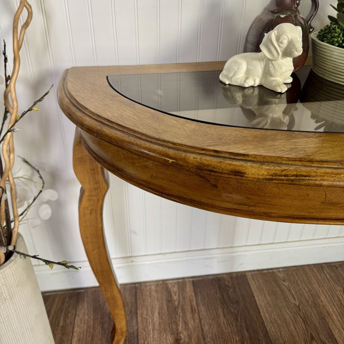 VenmoLovely vintage half-moon (demi-lune) console table with a warm wood tone, curved silhouette, and two-piece glass inset top. The narrow width makes it perfect for an entryway, hallway, or behind a sofa where you want something functional but not bulky. The glass panels add visual lightness and are great for displaying books, decor, or a statement lamp.