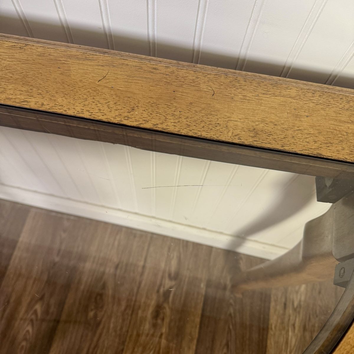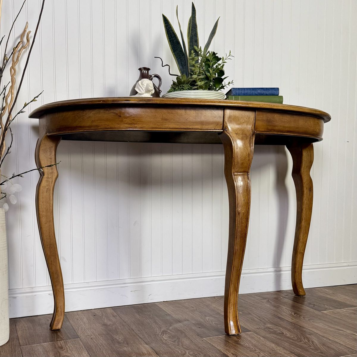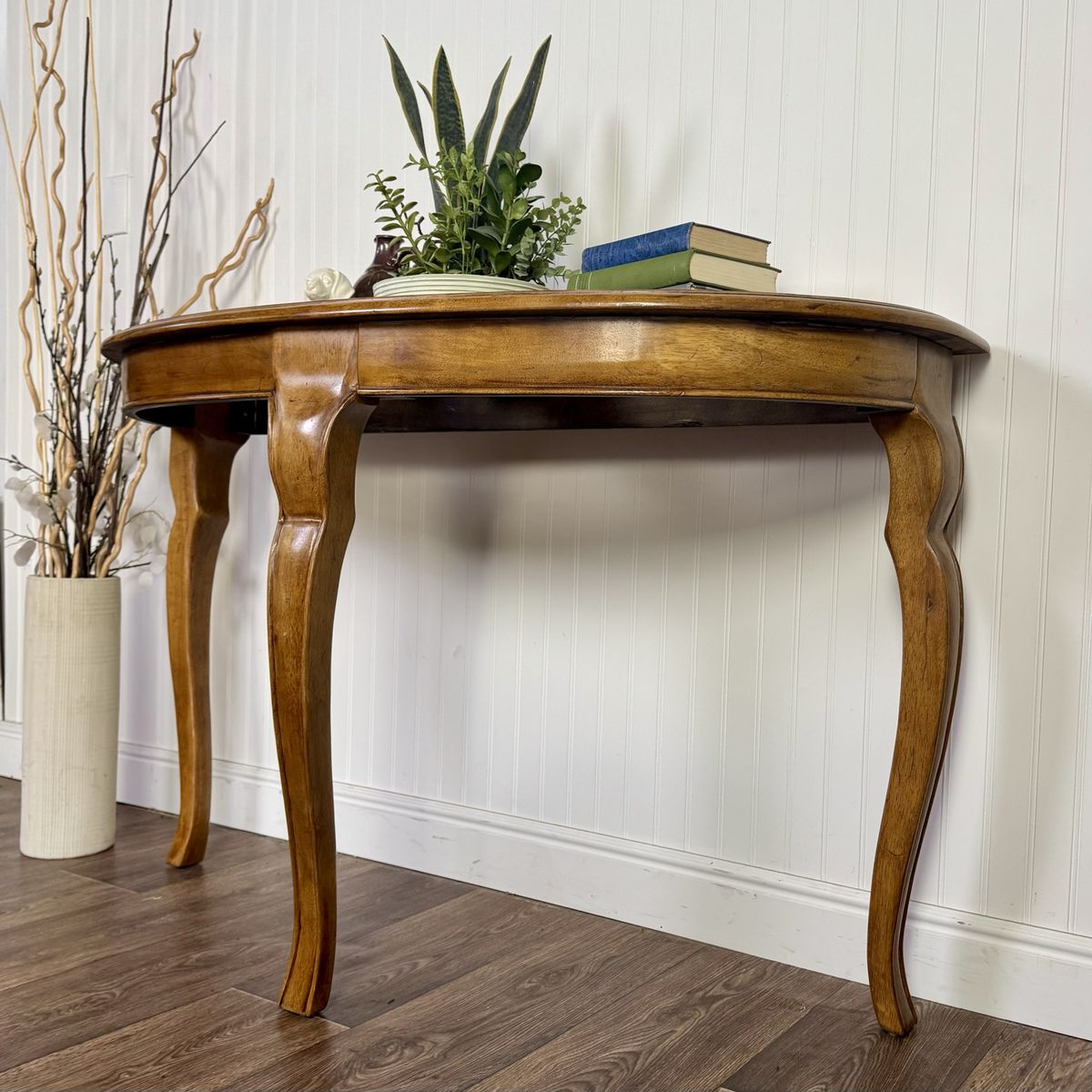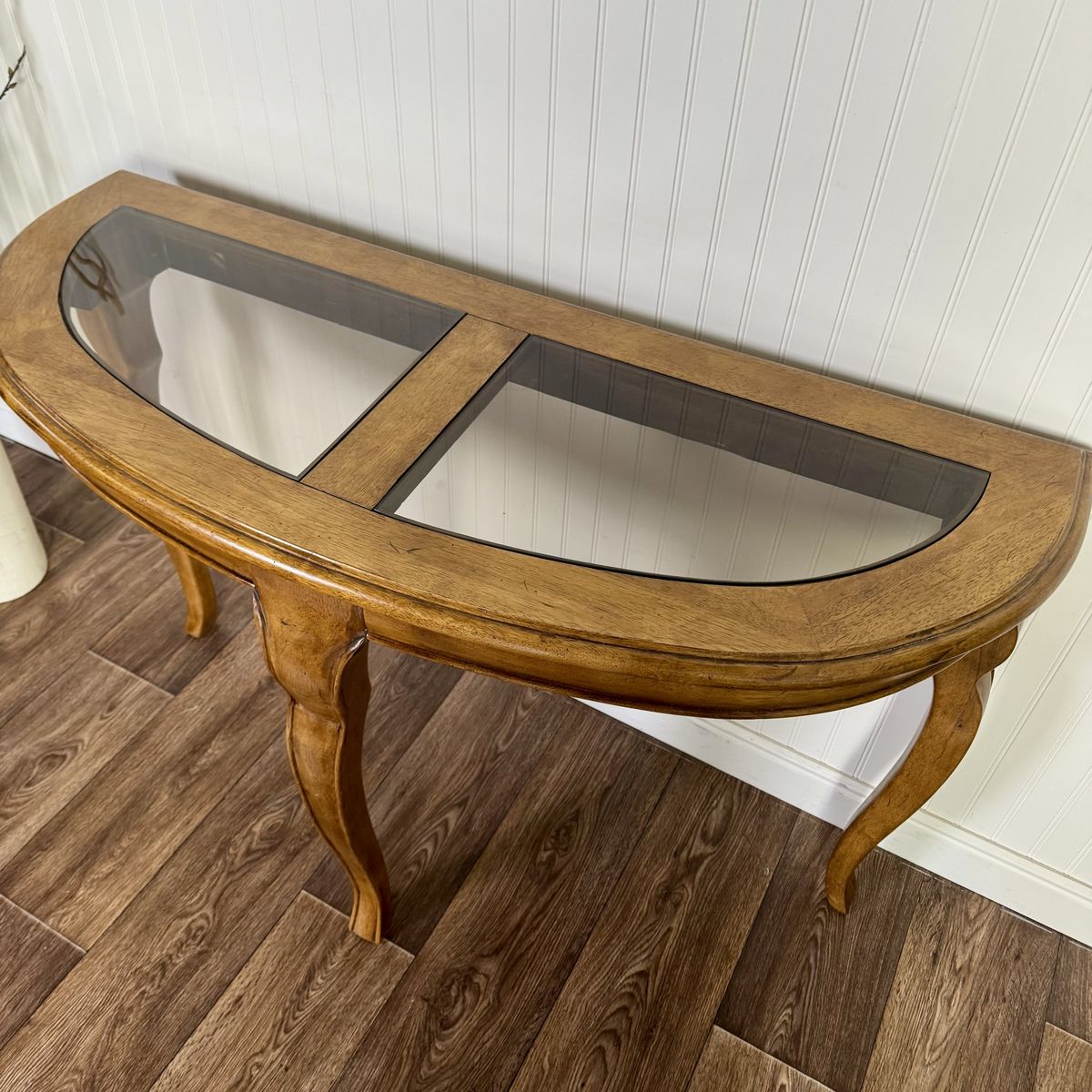 VenmoLovely vintage half-moon (demi-lune) console table with a warm wood tone, curved silhouette, and two-piece glass inset top. The narrow width makes it perfect for an entryway, hallway, or behind a sofa where you want something functional but not bulky. The glass panels add visual lightness and are great for displaying books, decor, or a statement lamp.