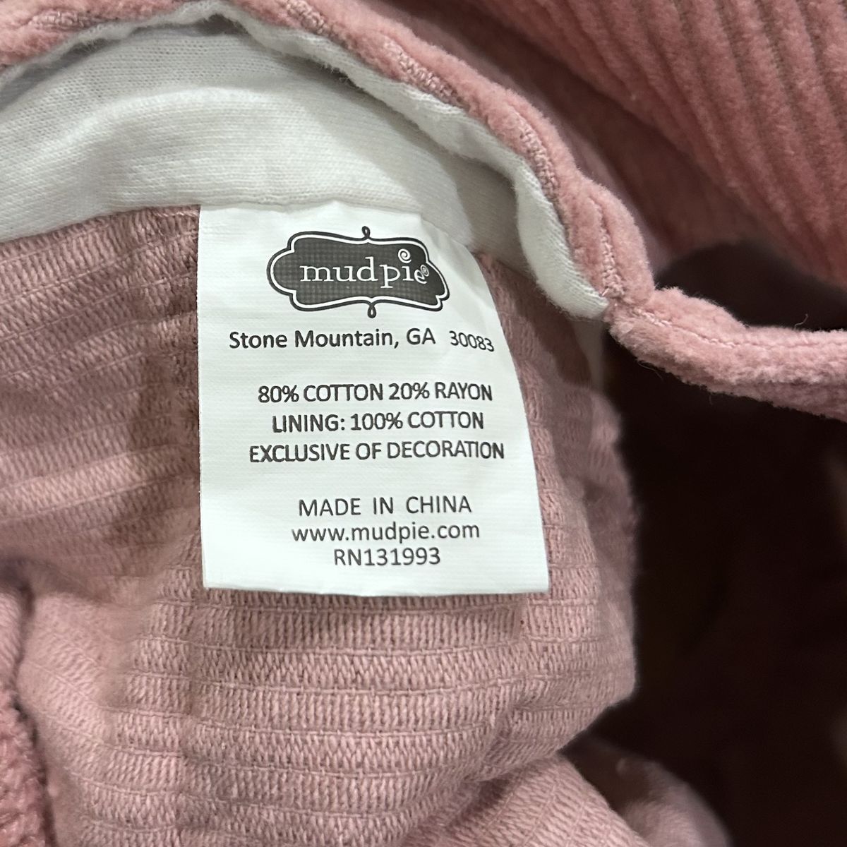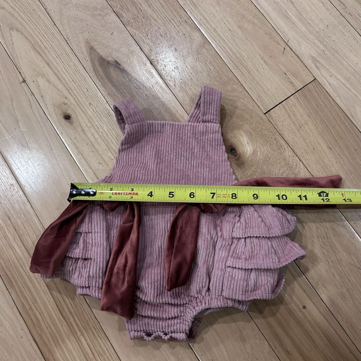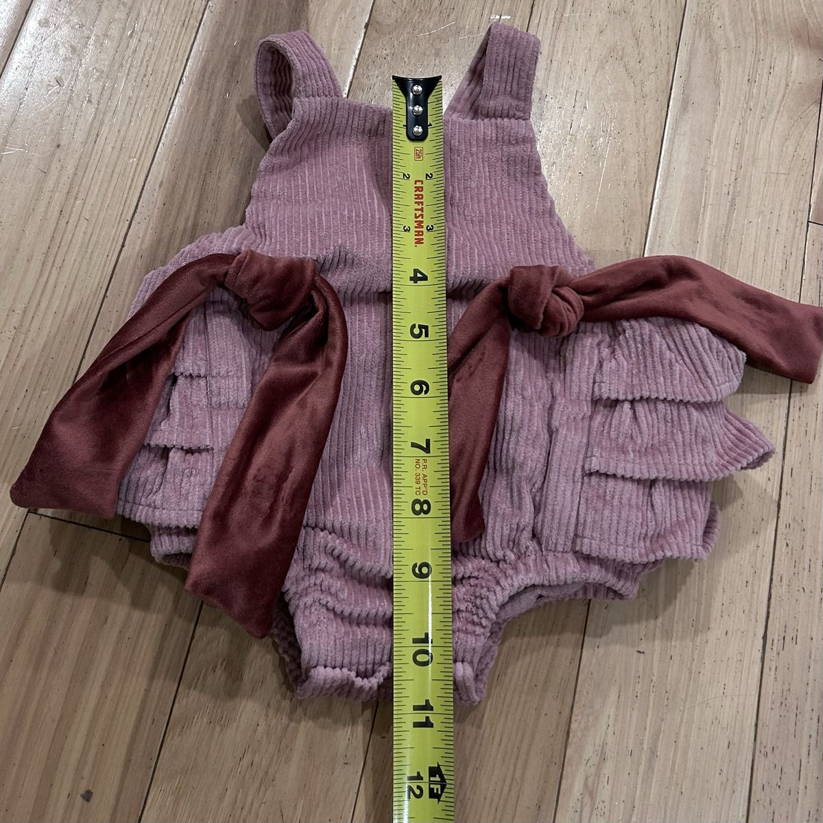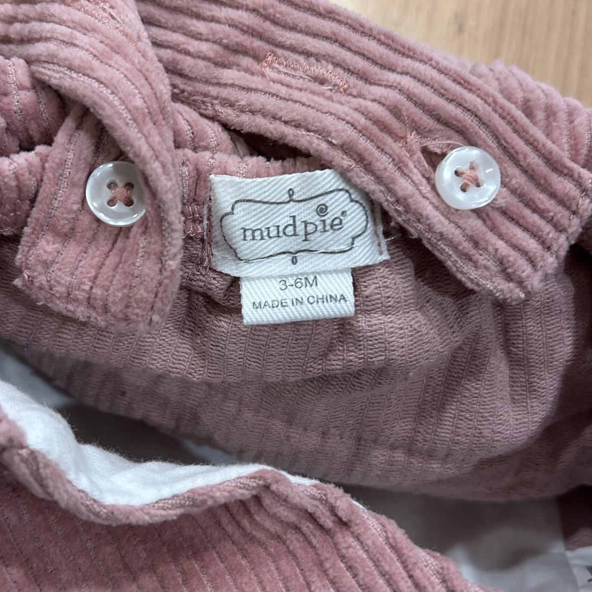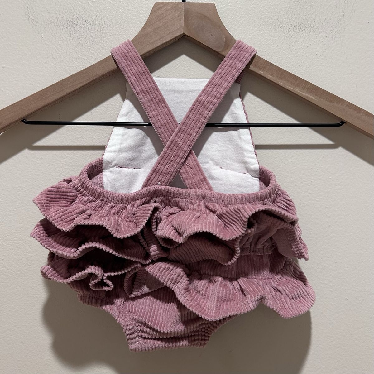 Mud Pie Pink Corduroy Ruffle Bum Bubble Romper - Baby Girl Size 3-6 Months - with velvet front bows, crossing back straps and inner leg snap closure - great condition - pre-owned.