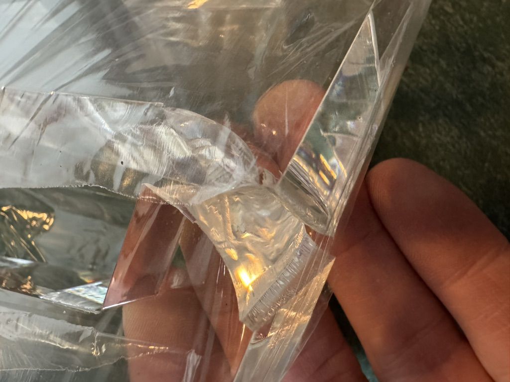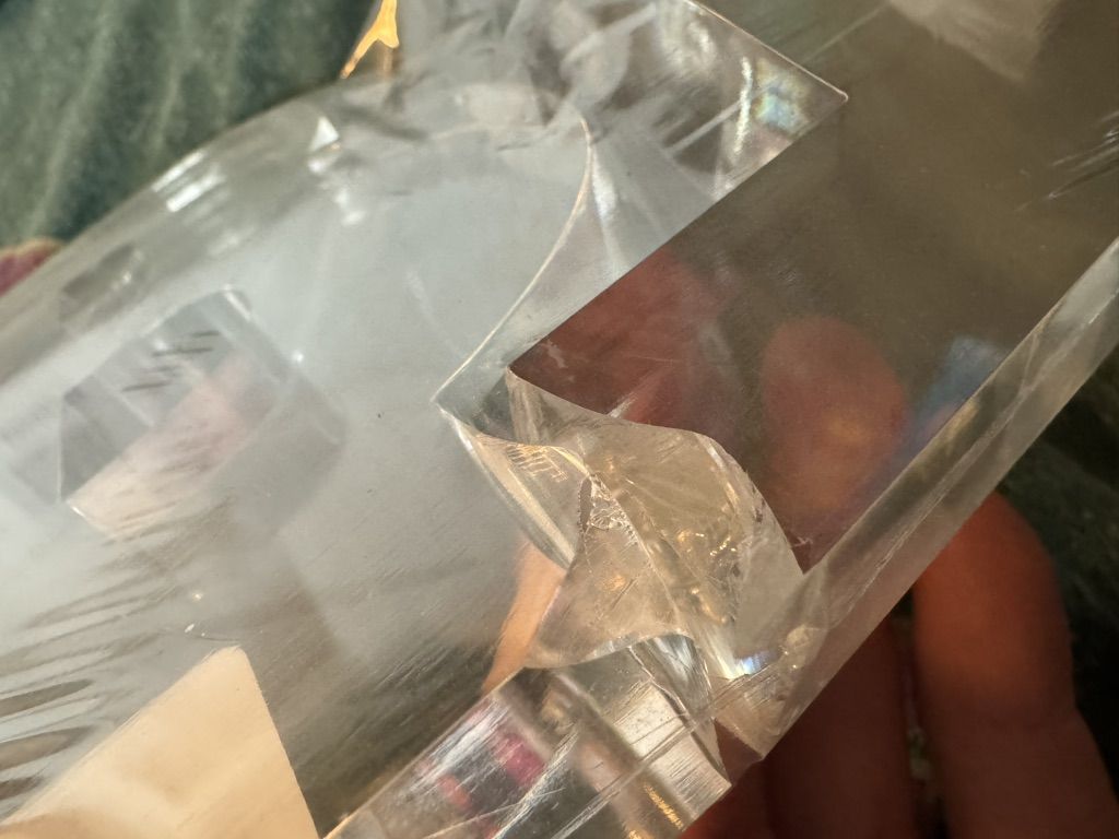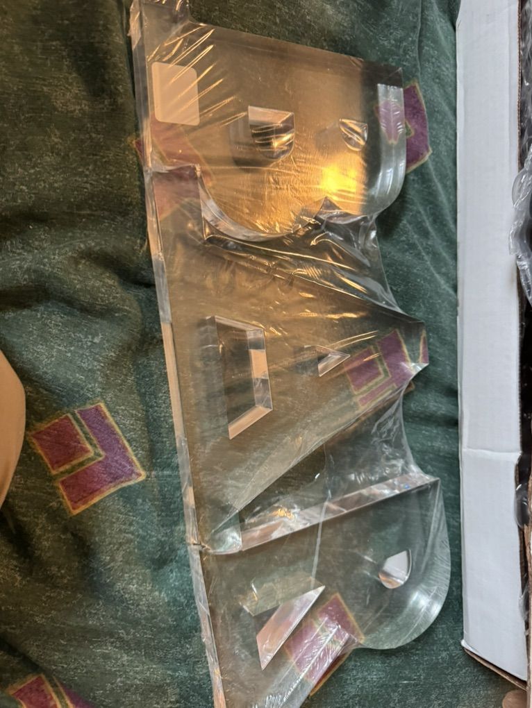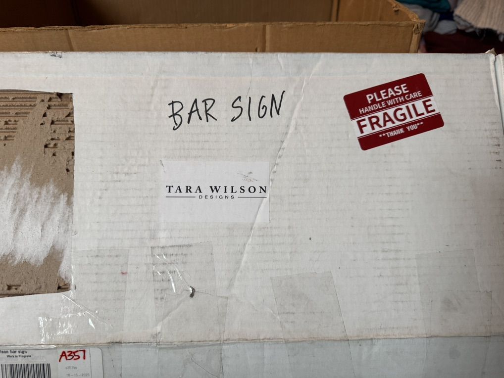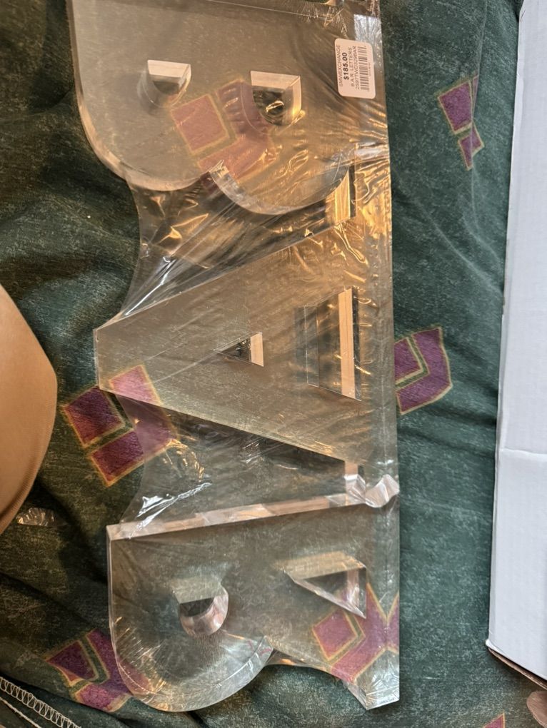 This is an acrylic (might be crystal, hard to tell through the sealed bag) bar sign from the designer Tara Wilson. It costs $175 on her site, but despite the “Fragile Handle with Care” sticker on the box it appears the shipper managed to crack the bar underneath the word “BAR” in not one but two places. Looks pretty simple to glue it back together, but I will leave that to the new owner.