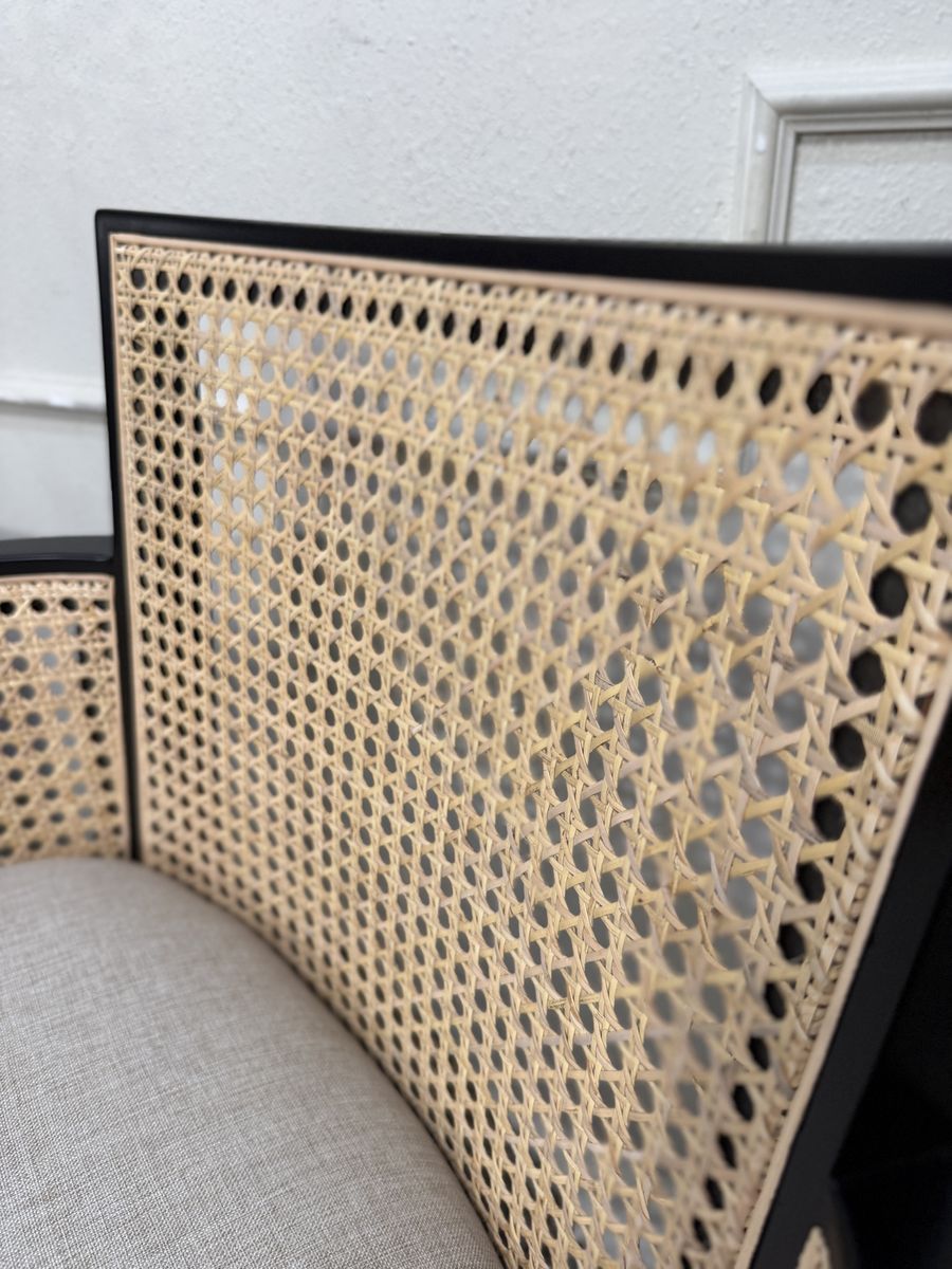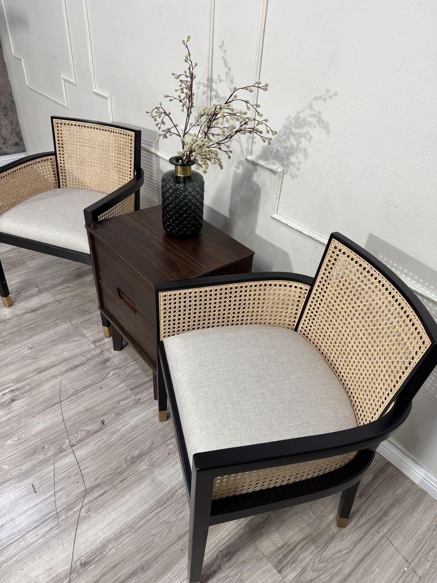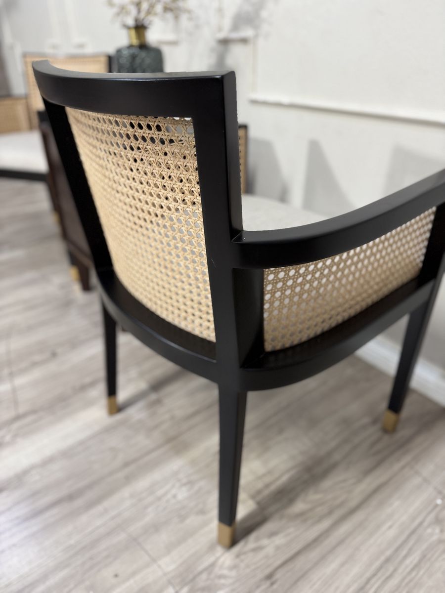 Featuring a natural cane seat back, gold-tipped legs and your choice of black or natural wood frames, our exclusive Fynn dining chair exudes bold style. Its square-back design complements its modern appeal. With a cushioned seat and armchair silhouette, Fynn was built for lingering meals and enjoyable feasting.
