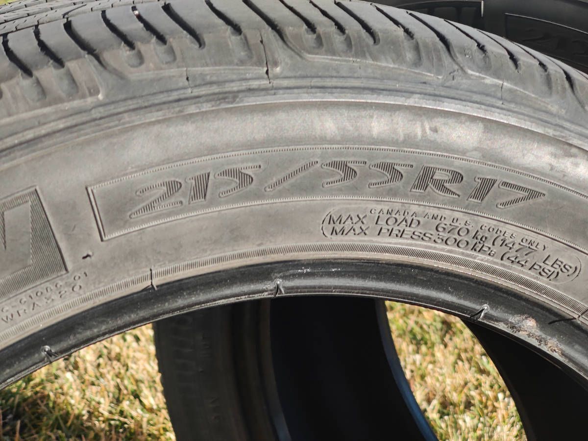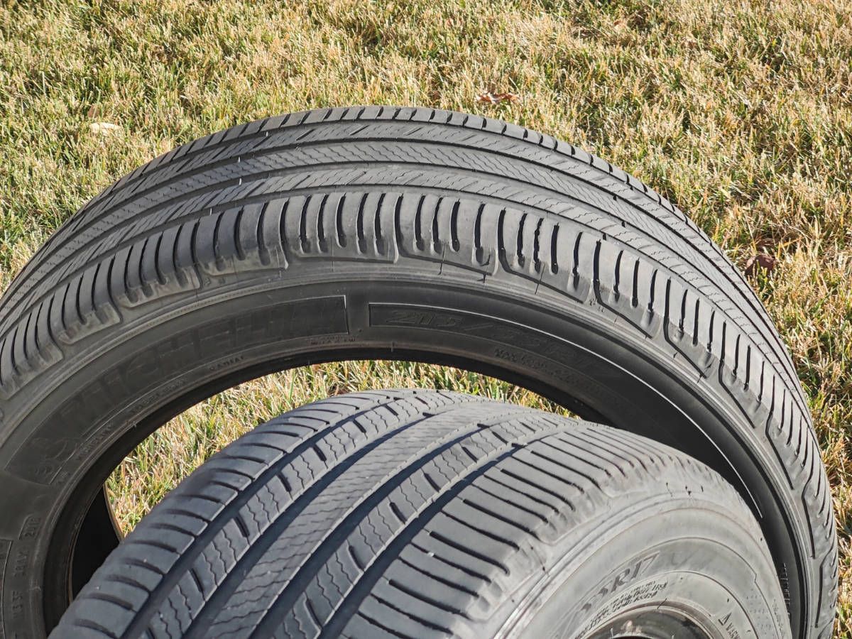 These are still in good shape. I wanted to get a new pair before last winter and the tire dealer said they still are good for about 10,000 to 12,000 miles. This would be the perfect used tires for the coming summer months. $50 total for both.