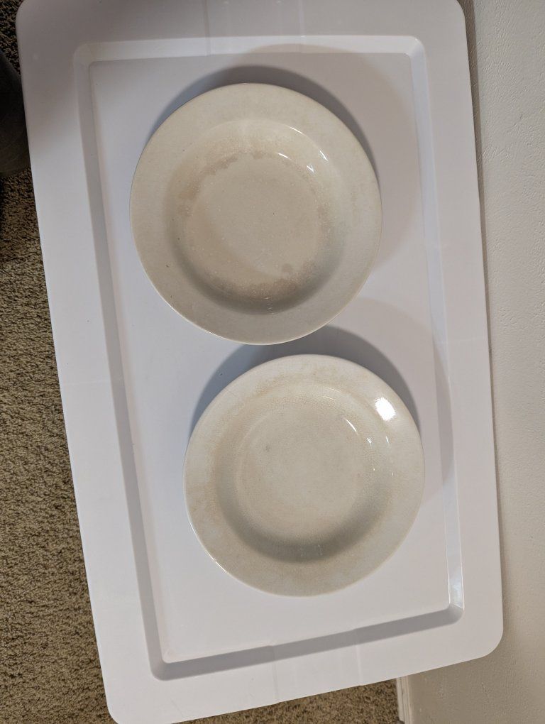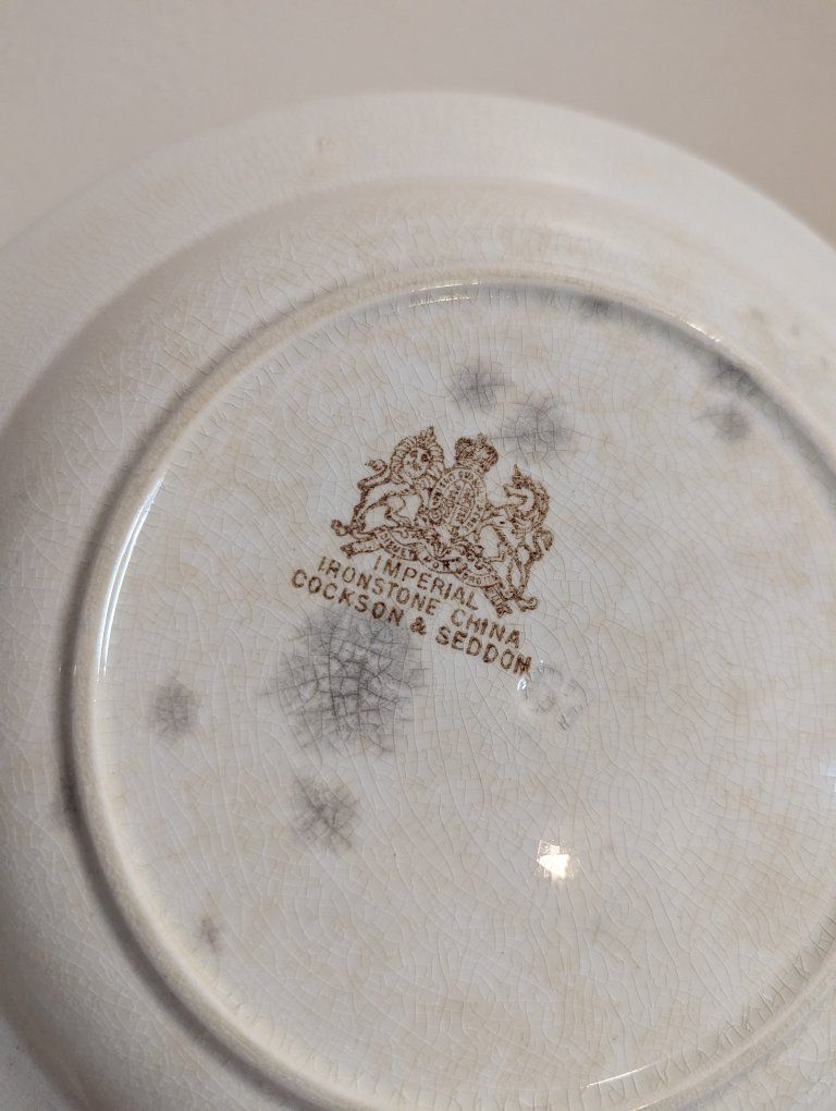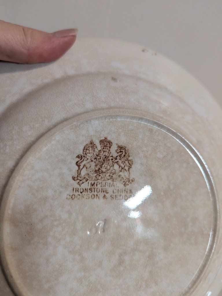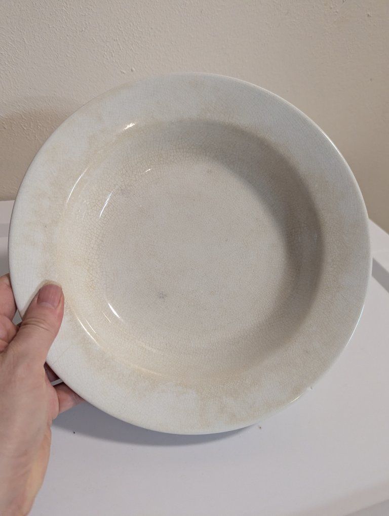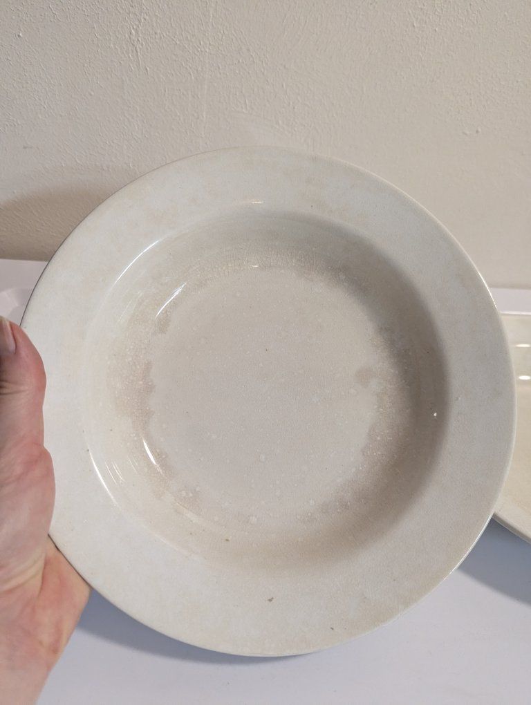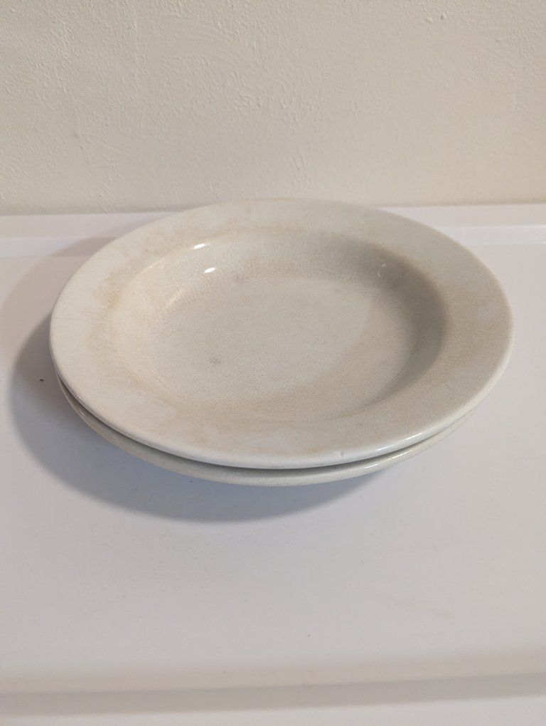 Venmoset of two vintage cream colored imperial ironstone China crazing and patina on each bowl two shallow bowls measuring 10 1/2 in across. No chips sold as set