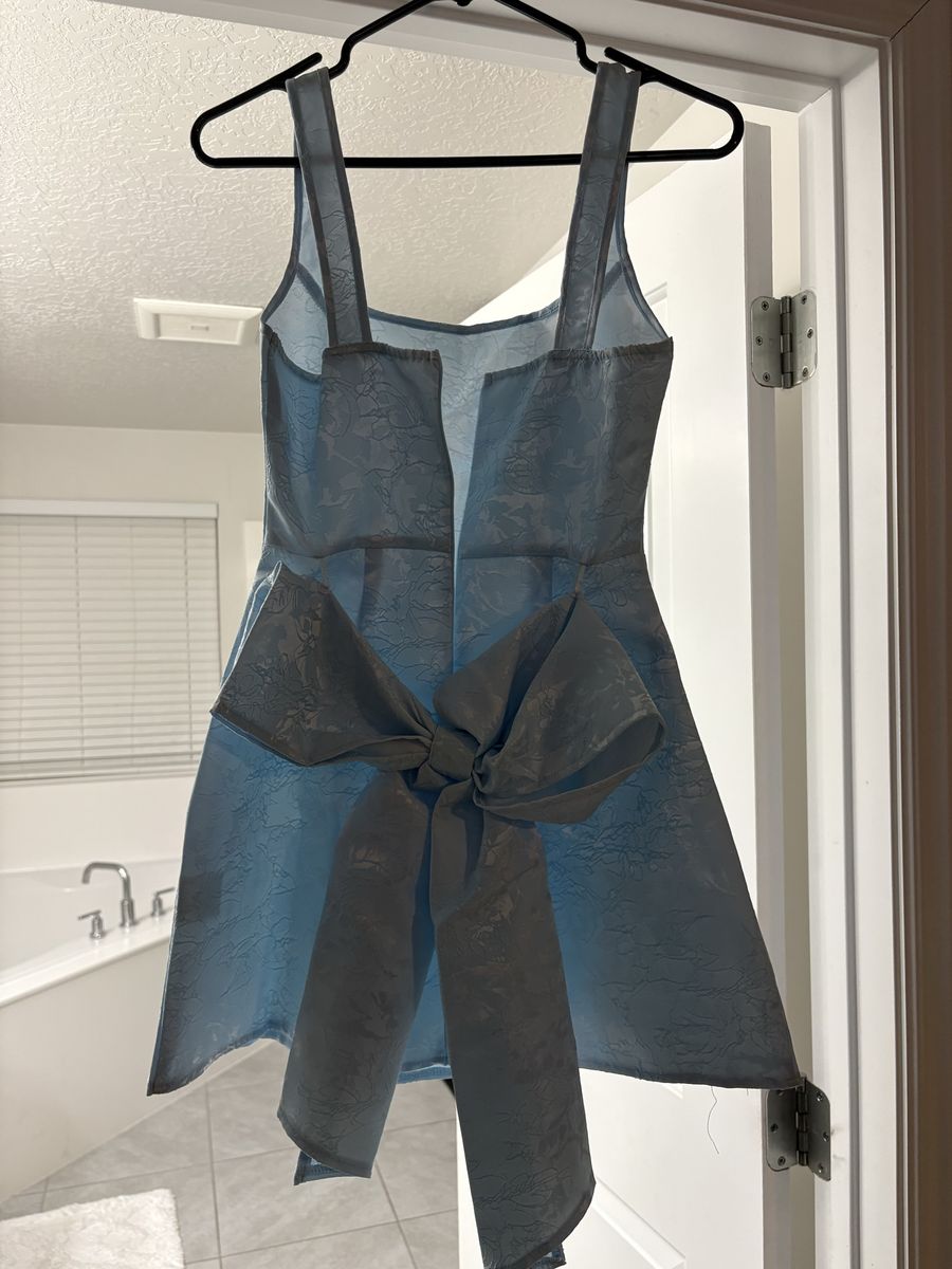 VenmoBeautiful blue formal dress in size small, brand new and never worn. The dress has a flattering structured top with wide straps, a fitted waist, and a large elegant bow detail on the back that makes it really stand out.