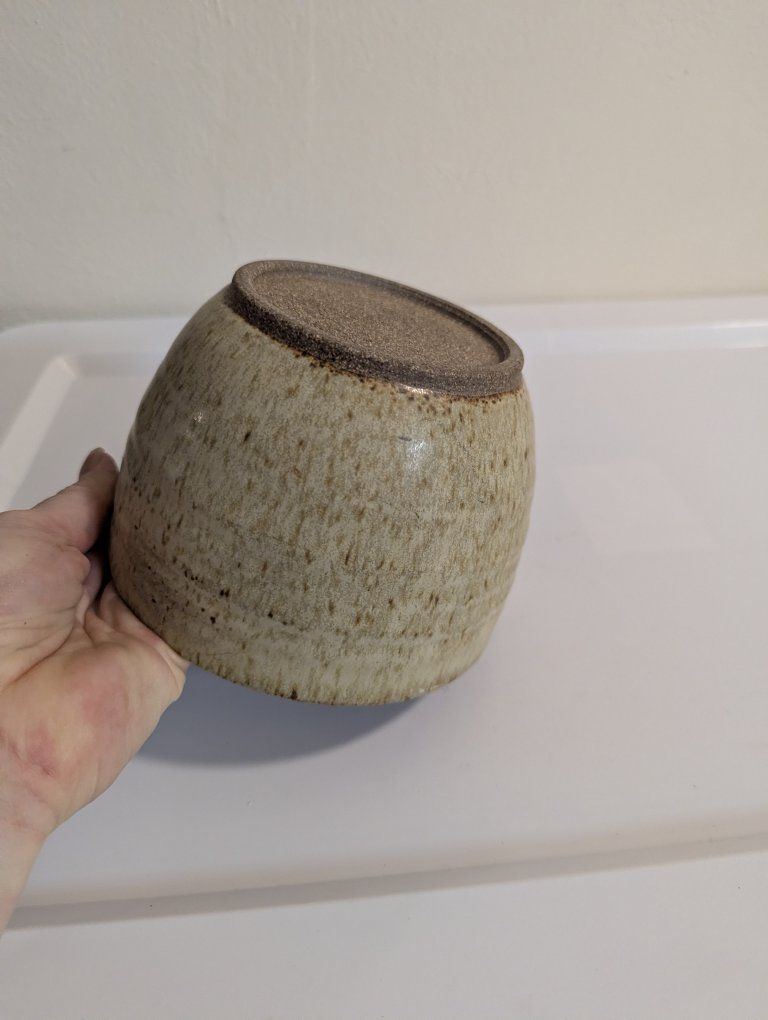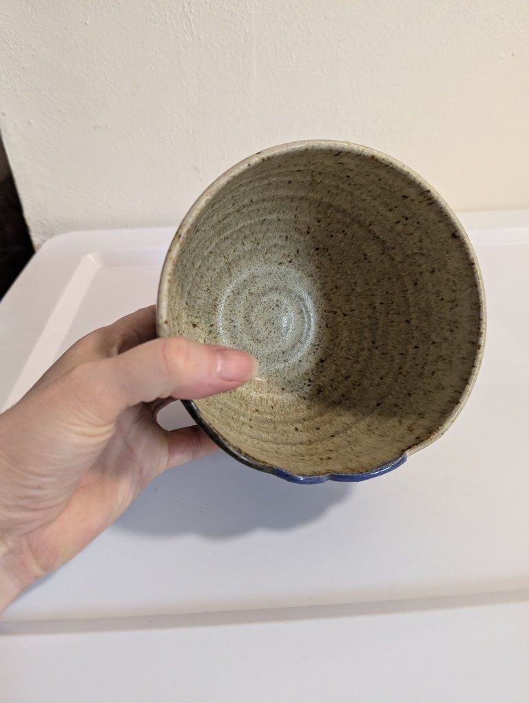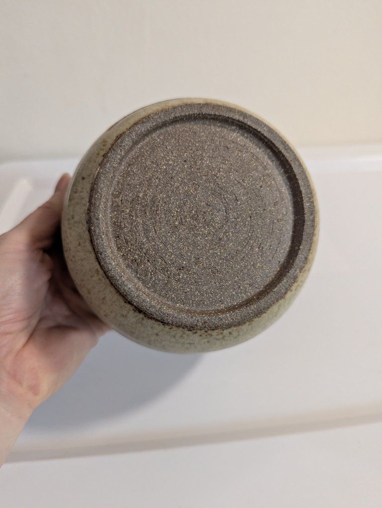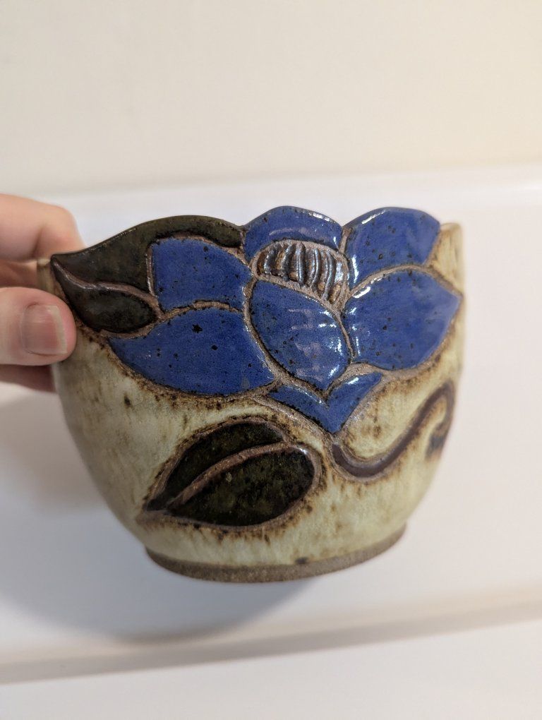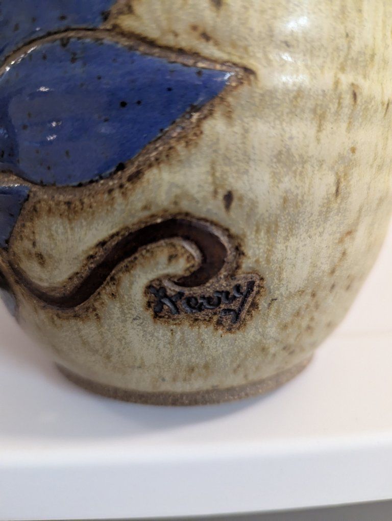 Venmothis hand thrown ball is 6 in across 4 in tall no chips pretty blue and green glaze on the flower vintage signed by Kerry