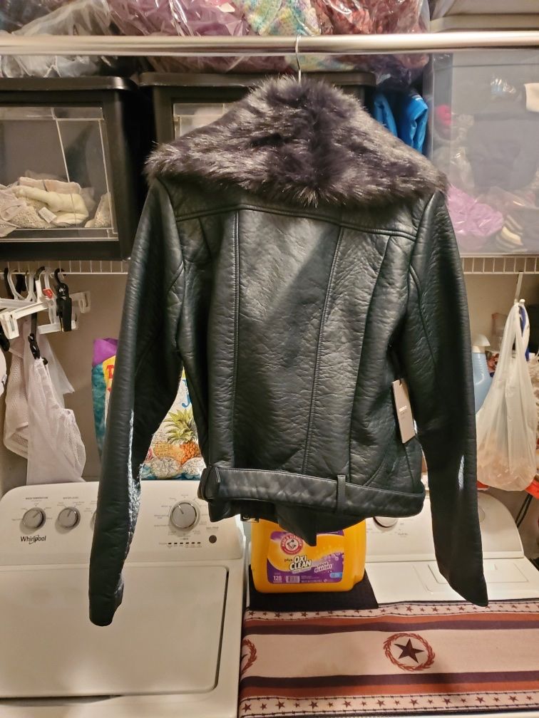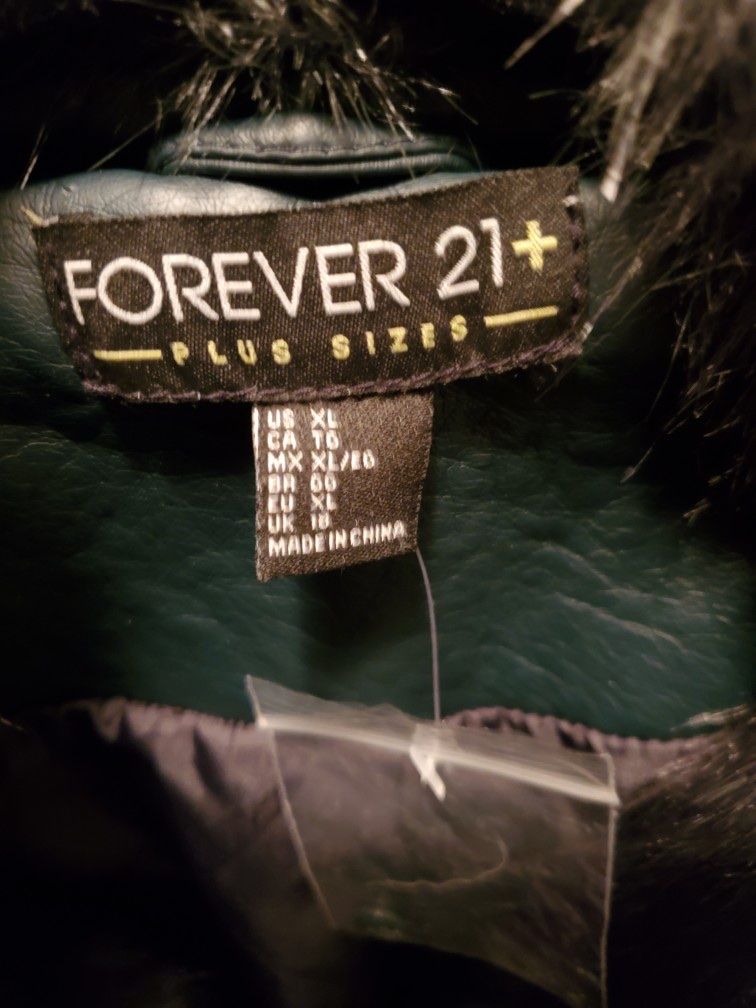 New, Never worn green leather jacket. Has removable fur. Size XL. Brand name is Forever 21. Please text Jeff at 385-242-5984.