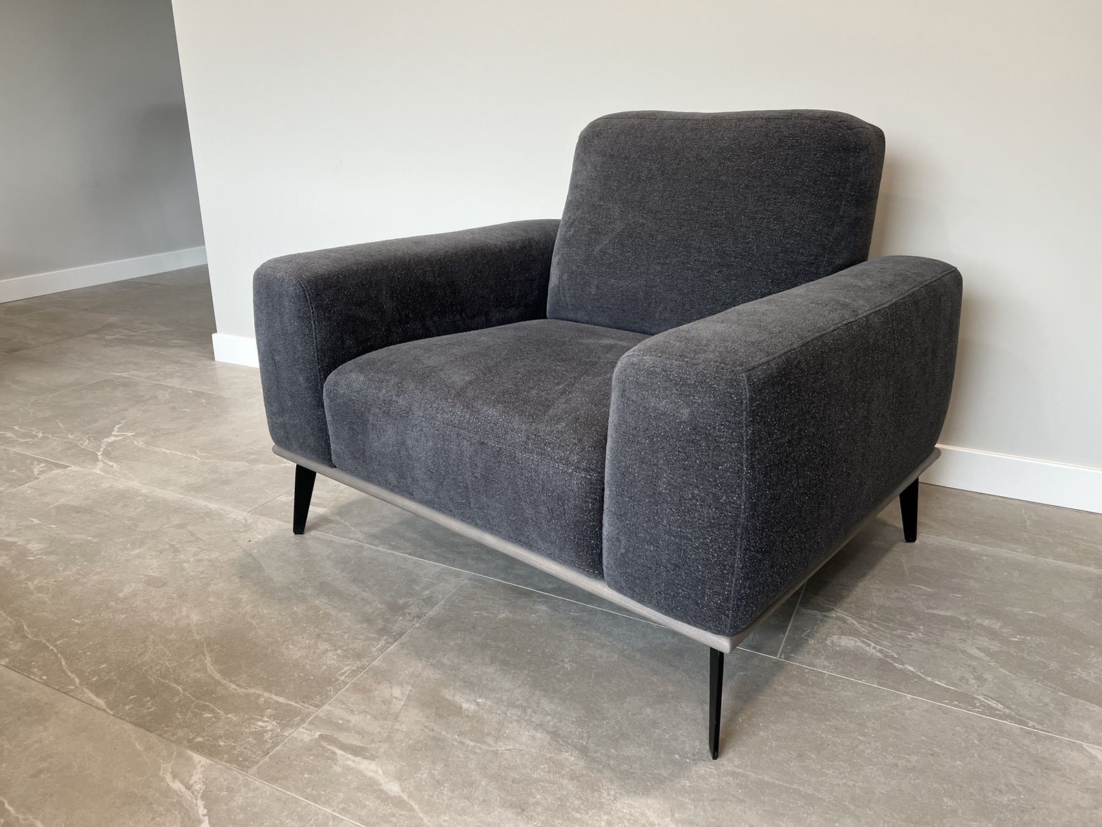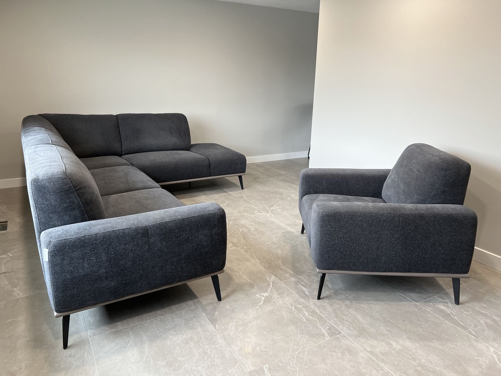 Custom order dark gray boucle fabric Made in Italy Retail for sofa and chair $6,604 + tax Don’t wait months for a custom order Only in home since August 2025 Sectional just wasn’t right for the space Sofa is two pieces Clips on each end hold sectional together Cushions are fixed (cannot be removed) Black metal legs (can be removed) Chair dimensions w 41” d 36” h 34” Sofa dimensions l x w 118” x 89” d 36” h 34”