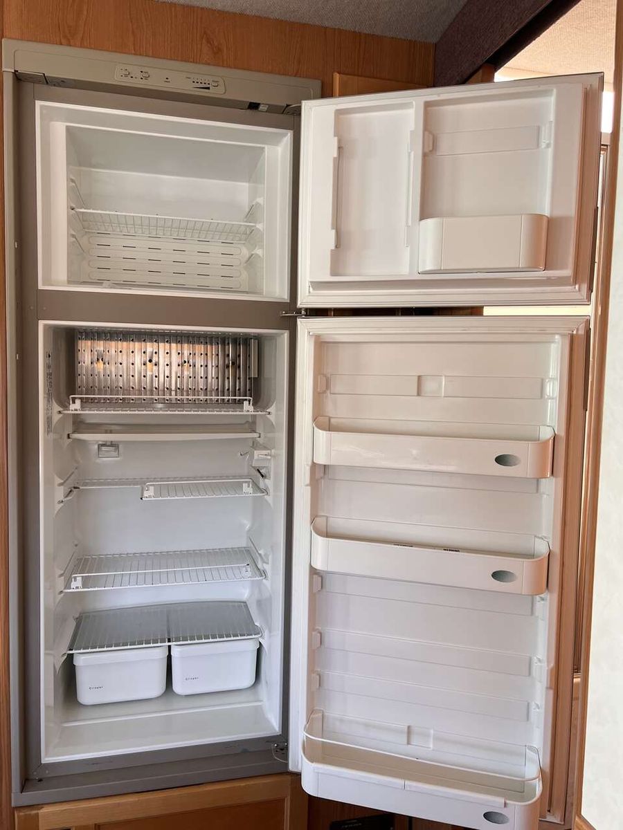 Kitchen Amenities The kitchen area is equipped with a large double bowl stainless steel sink, solid surface Corian countertops, and a beveled mirror backsplash. Cabinets feature Alder-stained cherry doors, with select units offering adjustable shelves for flexible storage. Cooking options include a 22-inch, three-burner high output cooktop with oven and a 1-cubic foot microwave, complemented by an 8-cubic foot Dometic double door refrigerator powered by either electricity or propane. Storage is plentiful, with two slide-out locking dinette bins and a slide-out pantry for dry and canned goods.