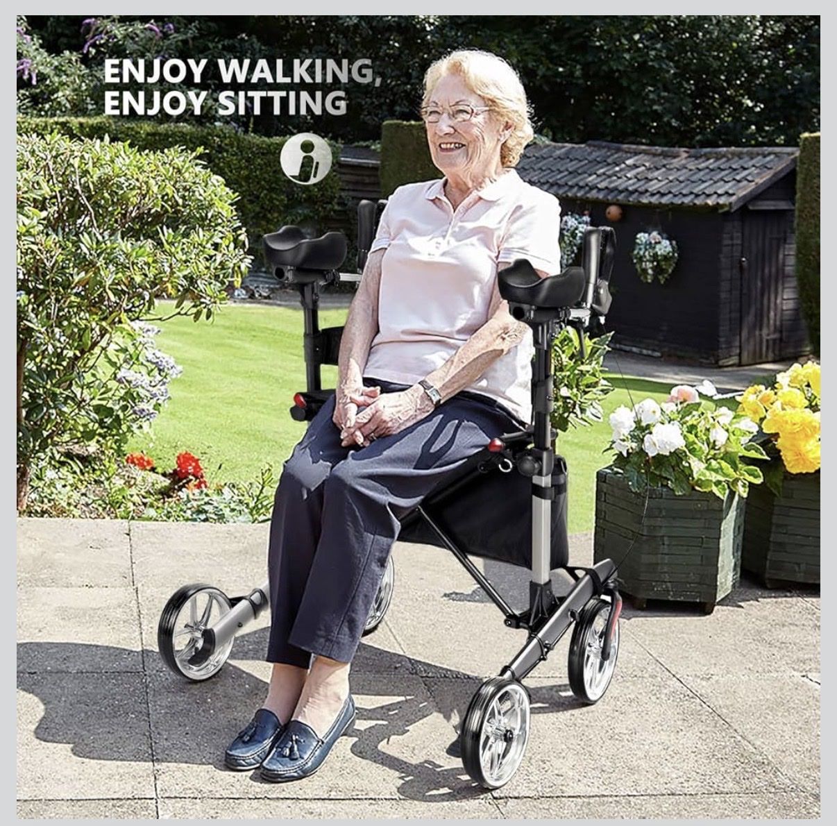 Soft padded armrests keep your forearms at a natural level, preventing painful stress on shoulders and back. Stability and Security: Upright walker with seat with solid PVC material 10" wheels, 360° swivel front wheels for easy maneuvering, sturdy enough for indoor and outdoor smooth, controlled ride. Ergonomic hand brakes, push forward to slow or stop. Foldable and Convenient: Assembled and ready to go with you! Compact size for storage and transporting. Detachable polyester storage bag that doubles as a takeaway tote and cane holder to leave your hands free. Comfortable Seat with Backrest: 18(L) x 10(D) x 21(H) Inches; breathable mesh seat, durable backrest support, push hand brake ahead to lock rear wheels when sitting down. Compact Design:The unique folding design allows you to adjust the width of the rollator. It permits you to navigate narrow spaces. The front wheels can be easily folded, and the rear legs can be removed, allowing you put your rollator in a travel case, a car trunk or cabinet or closet.