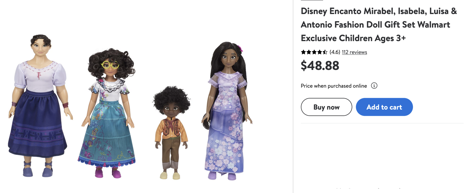 Includes: 1 Mirabel Doll, 1 Isabela Doll, 1 Luisa Doll, 1 Antonio Doll, 4 Doll Outfits, 4 Pairs of Doll Shoes, 1 Pair of Doll Glasses, and 1 Doll Hair Clip