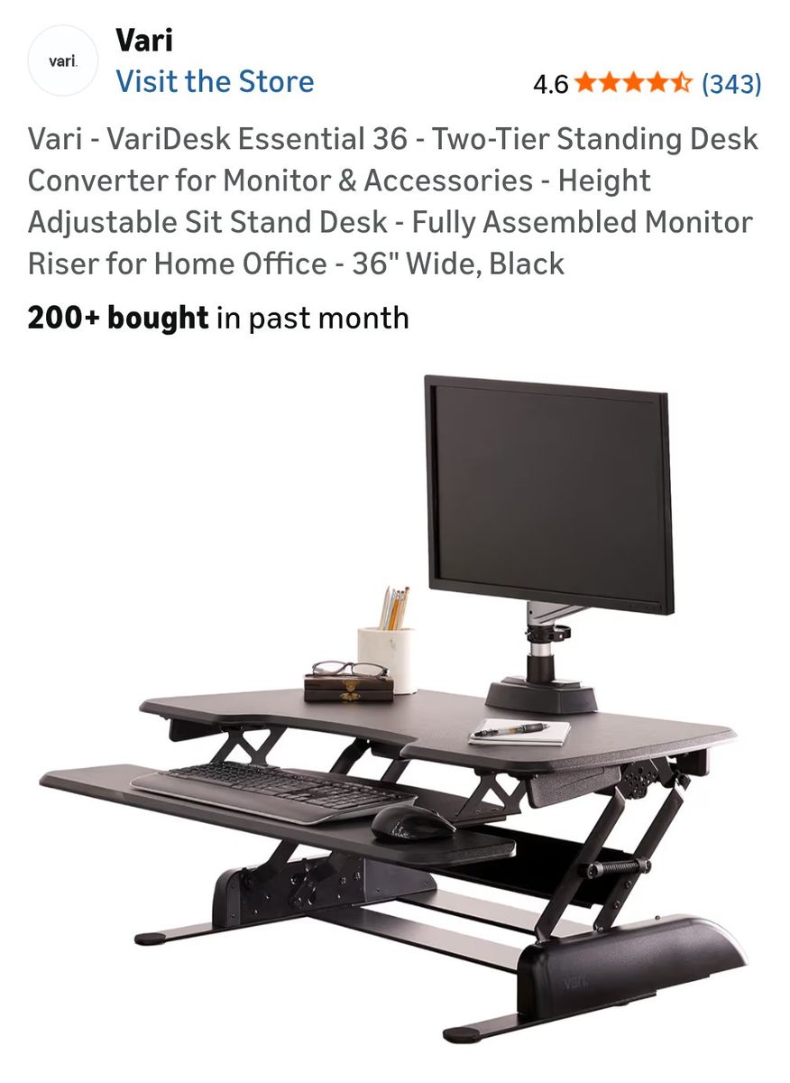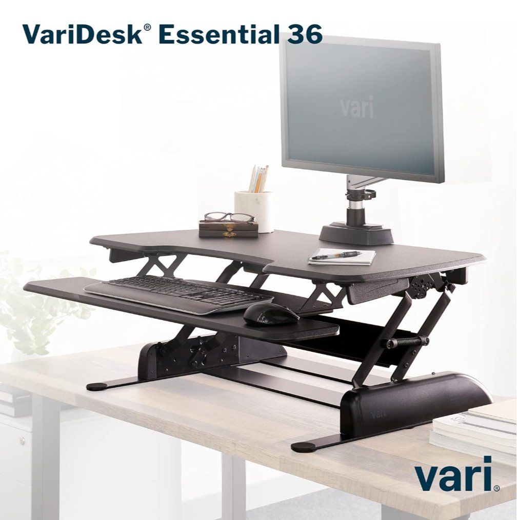 VenmoBrand New VariDesk Essentials 36 inch two tier standing conversion desk. Meant to sit on top of any existing desk to convert any desk into a standing desk. Details are in the pictures. Retails for anywhere from $280-$350. Asking $190. Text if interested 801-903-8337
