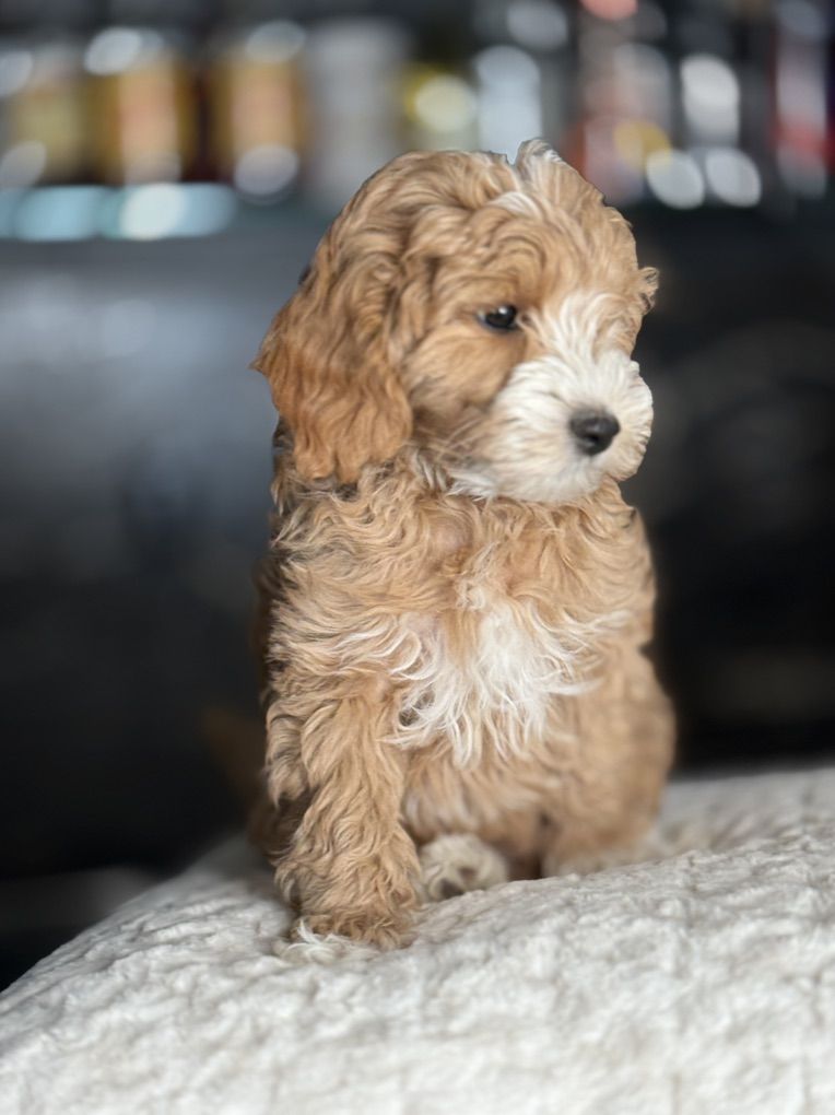 ApplePayThis beautiful mini goldendoodle boy has the perfect wavy hair! No shedding at all! He has gorgeous blocky faces and perfect conformation he is doggy door trained and loves the I be with his people!