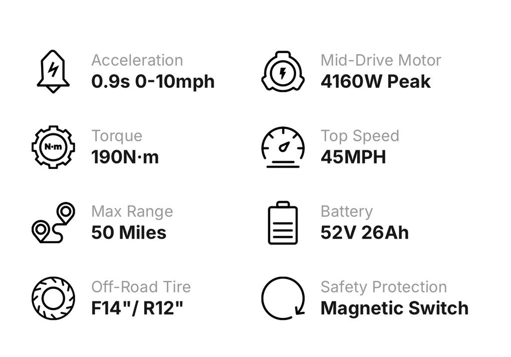 Safety Start System – Prevents accidental launch Magnetic Safety Switch – Instant power cut-off Reverse Assist – Back out when stuck Hydraulic Disc Brakes – Strong, controlled stopping 3 Speed Modes – Safe progression for riders Carbon Steel Frame – Tough, impact-ready build IPX6 Rated – Ride in rain and splashes