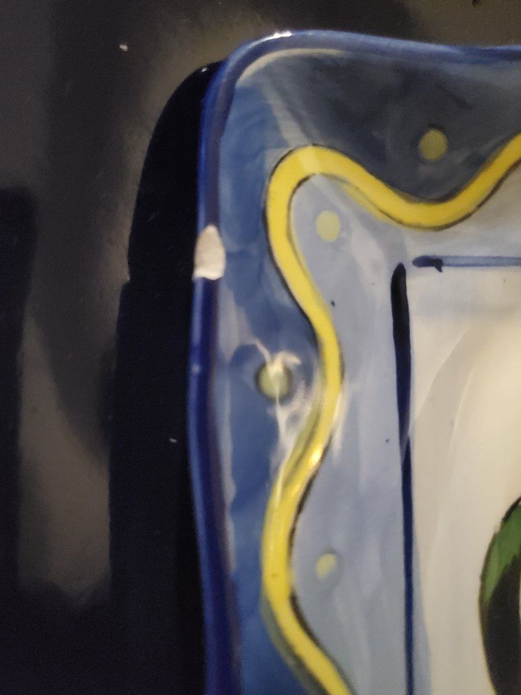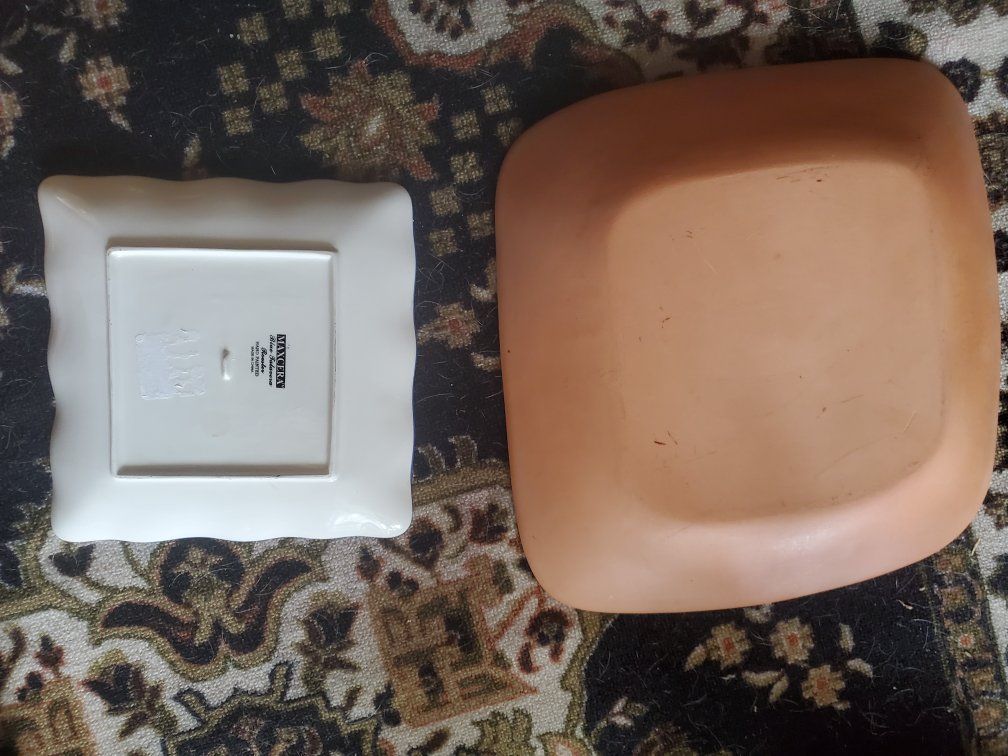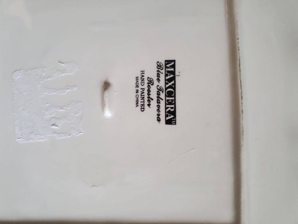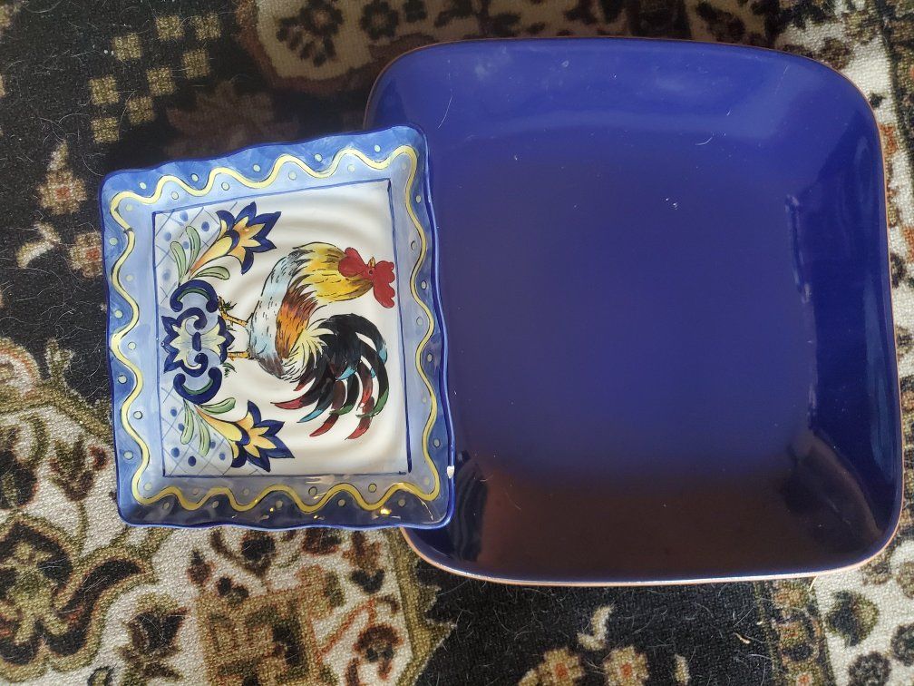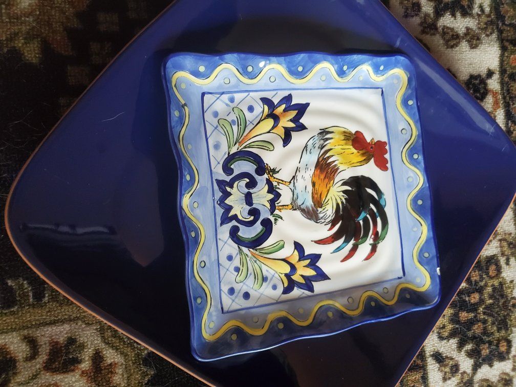 Venmo1 Very Lg (I believe it's 14"x14") You will find it in my Individually listed items too. Pure Terracotta Cobalt Blue Color. Excellent; No chips Condition! & 1 Maxcera Hand Painted China Discontinued Pattern Rooster Plate. 9"x9" It has a small chip on the top of it. Price reflects that. Plz text for fastest response. Cash or Venmo Pick up in So. Ogden