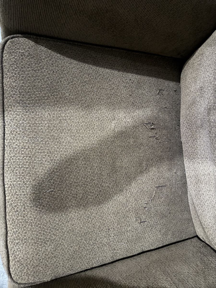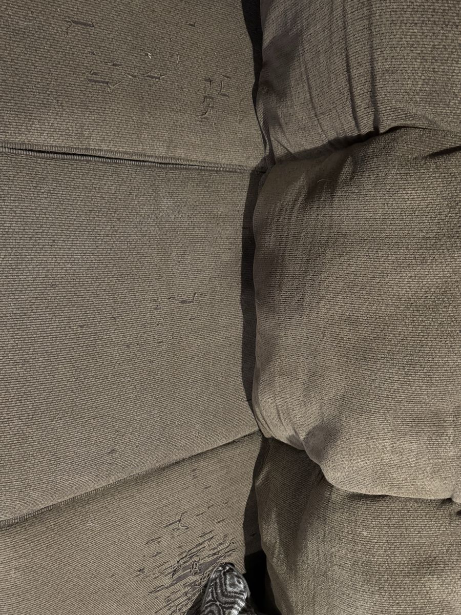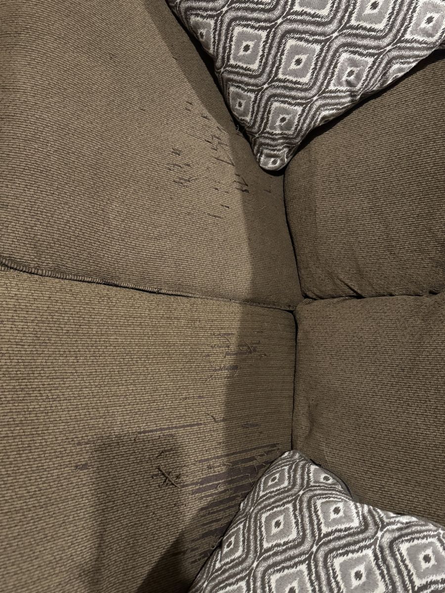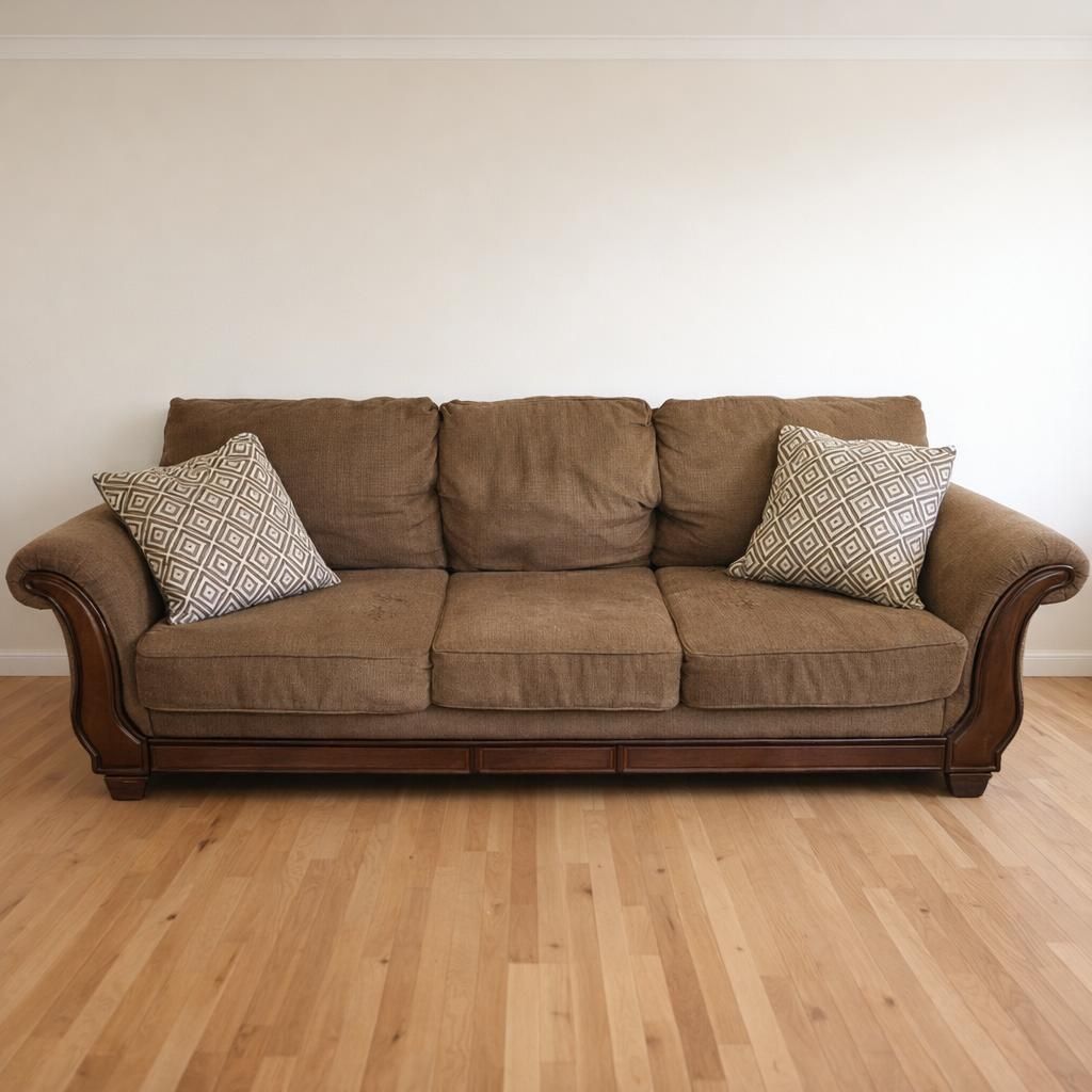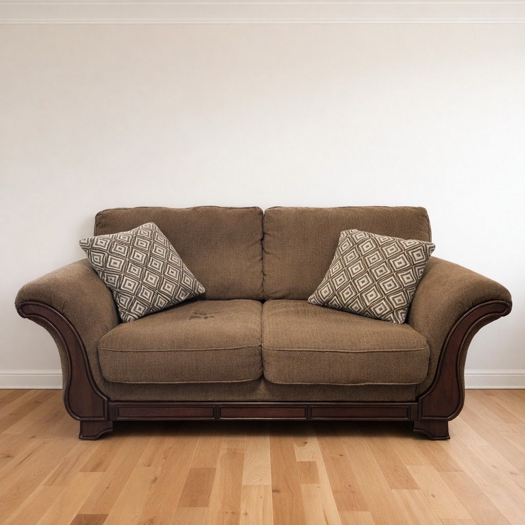 ZelleSelling a complete 3-piece living room set — includes a 3-cushion sofa, 2-cushion loveseat, and a matching armchair, plus 4 accent pillows with a diamond pattern. The frames are solid with a traditional style featuring dark wood detailing on the arms and base that gives them a more substantial, classic look than your average couch. The upholstery is a dark brown style fabric that’s held up structurally well — cushions are still supportive and the frames are sturdy. Honest condition note: The cushion fabric has some fraying and fiber pulls on the seating surfaces, as shown in the photos. The structure and support are fine — it’s purely a cosmetic issue. Great candidate for a slipcover, or perfect for a garage, game room, rental, or first apartment where looks aren’t the top priority. Priced at $50 for the whole set — that’s sofa, loveseat, chair, and pillows. Open to reasonable offers. Buyer is responsible for pickup and loading. Cash or Venmo preferred.