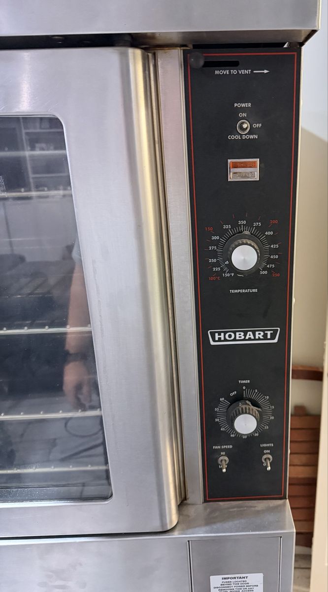 Commercial Hobart HCE‑17 double‑stack convection oven. Recently removed from service and was working great before disconnect. Both ovens have independent controls and include adjustable interior racks. Minor cosmetic scratches from normal use. Hard‑wired setup (no plug).