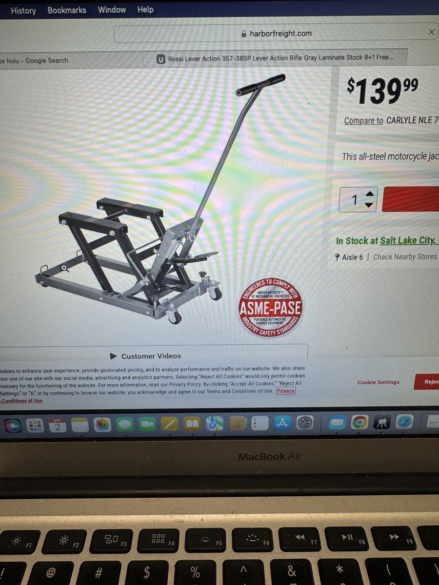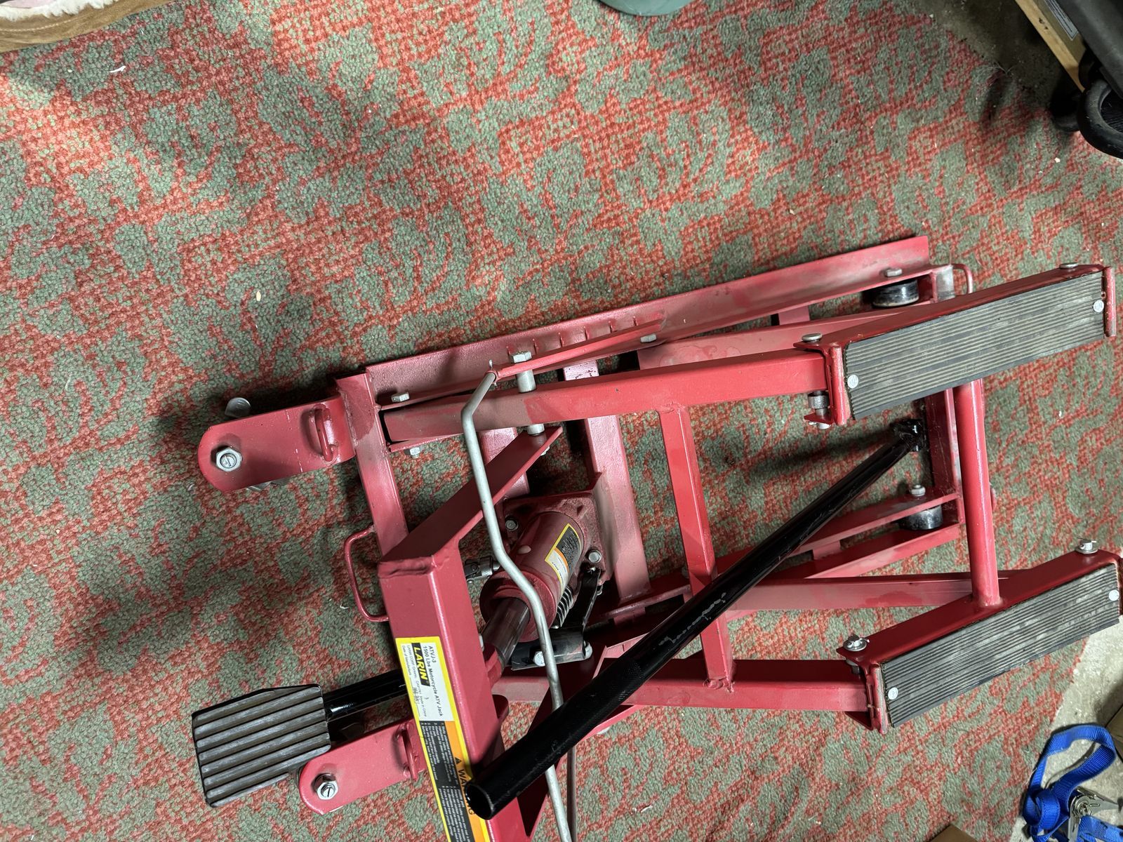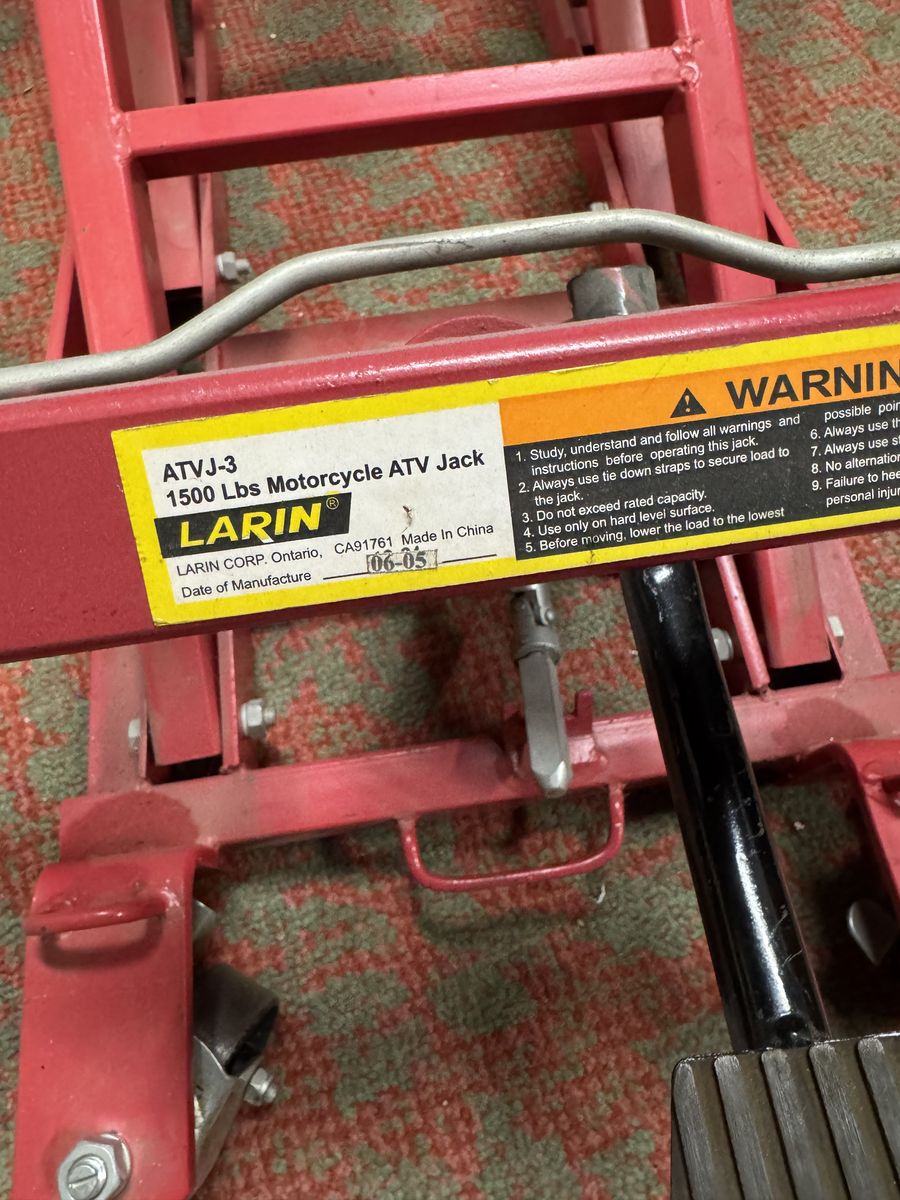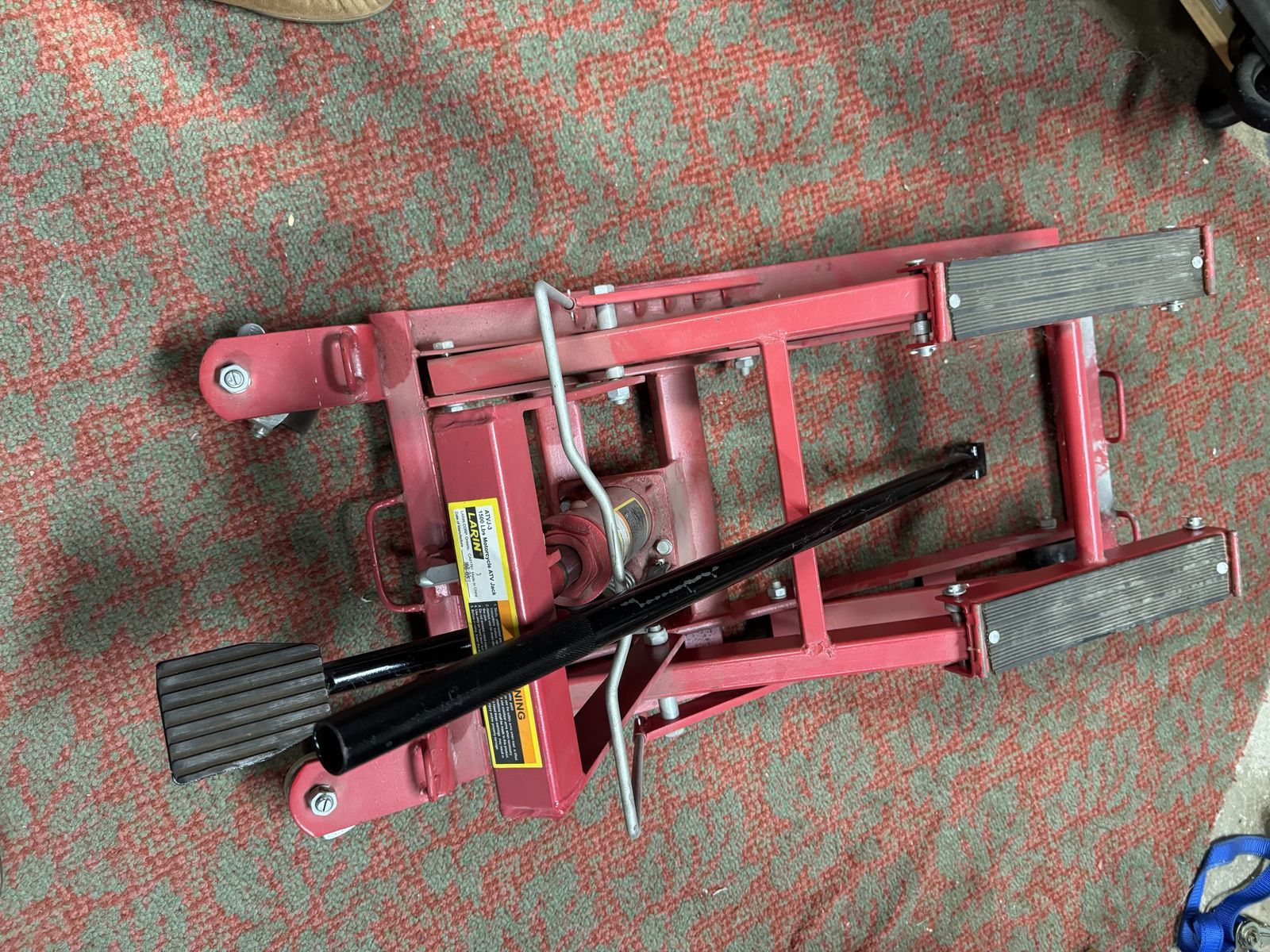 HARBOR FREIGHT MOTOR CYCLE JACK 1500 LBS BOUGHT 20 YEARS AGO USED IT THREE TIMES ALL RED PICTURES