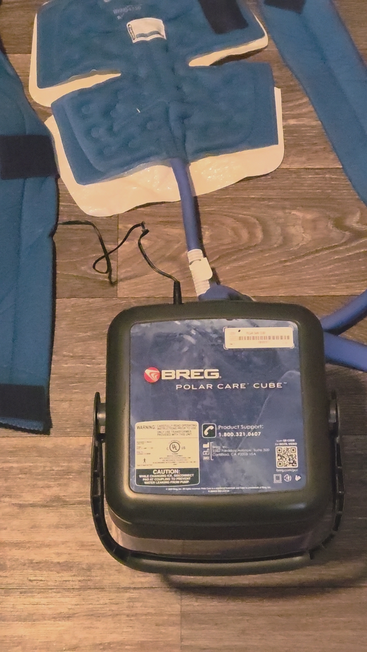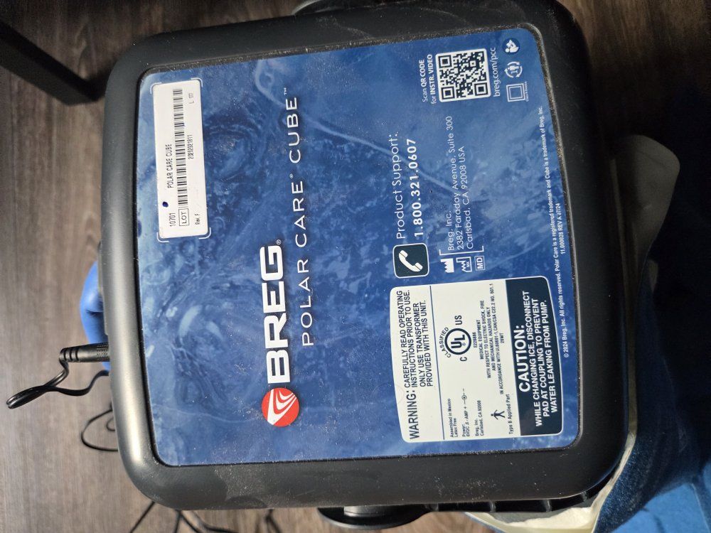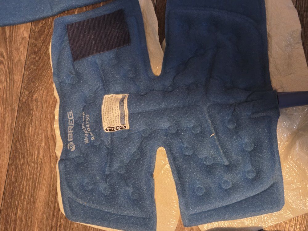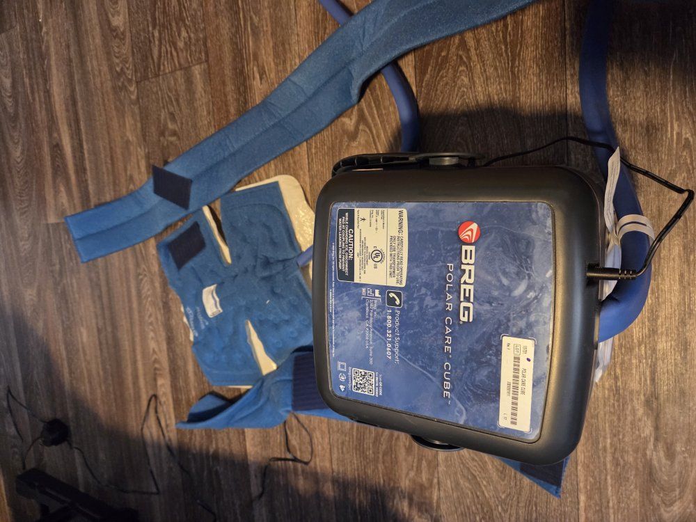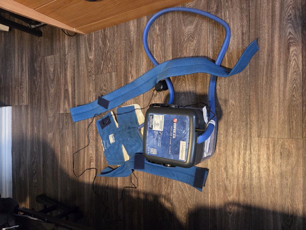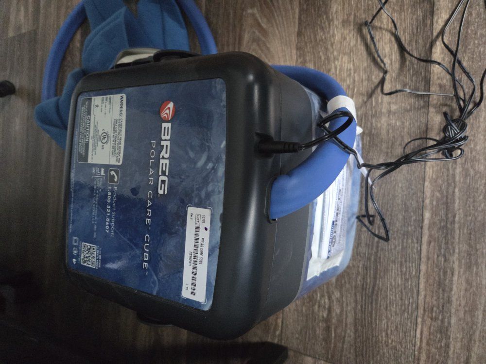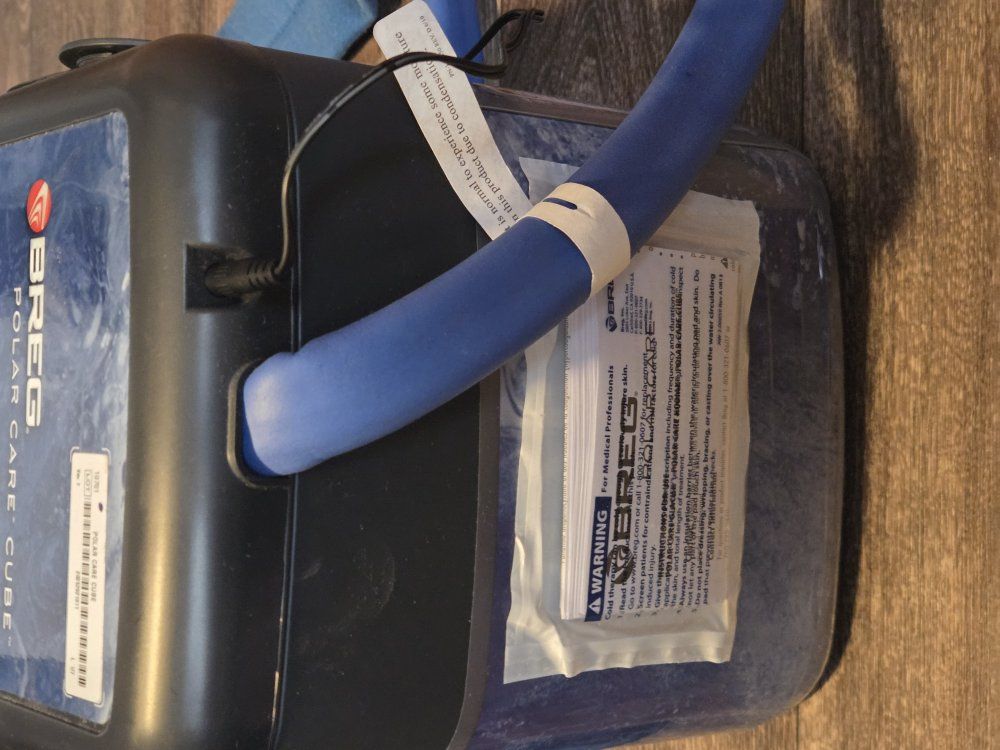 Reliable Breg cold therapy system includes the Polar Care Cube reservoir, power adapter, and a blue WrapOn hip pad. This unit is designed for post-operative recovery or injury management. The reservoir has a black lid and clear base to monitor ice levels. The hip pad is blue with adjustable straps for a secure fit.Used once in perfect condition!!!