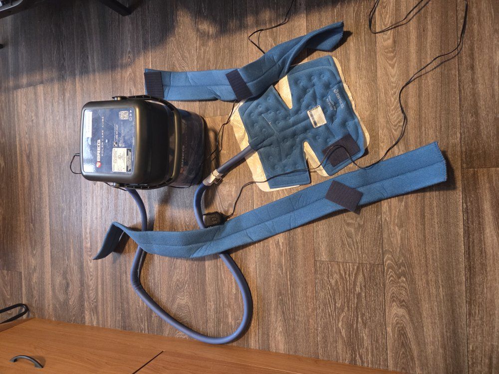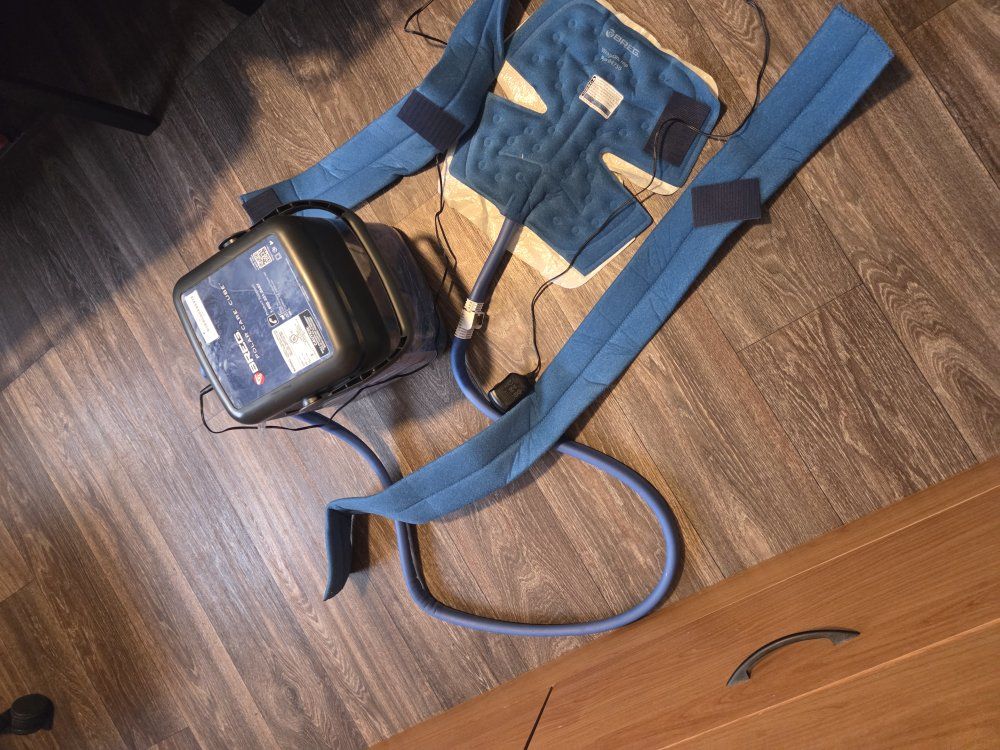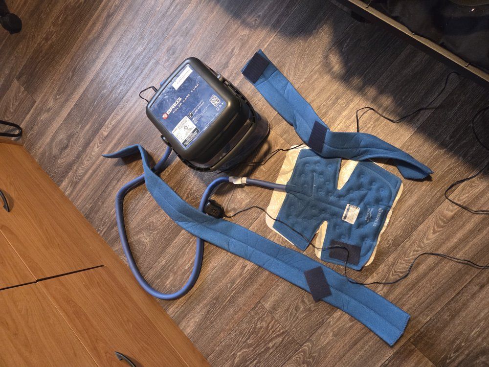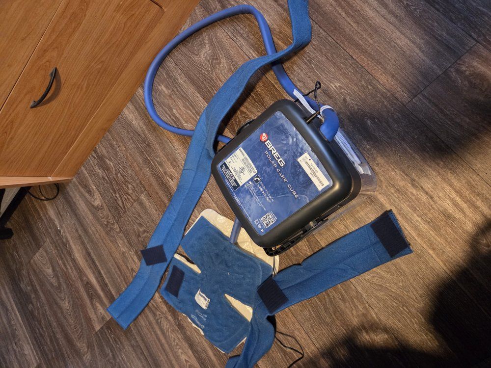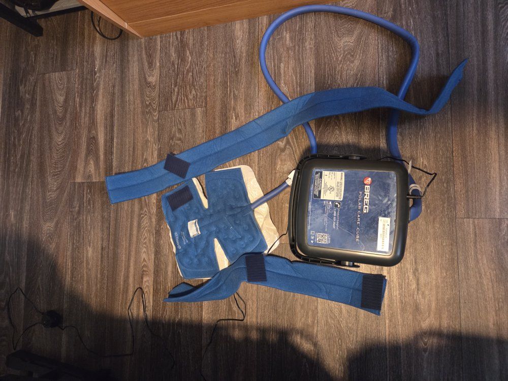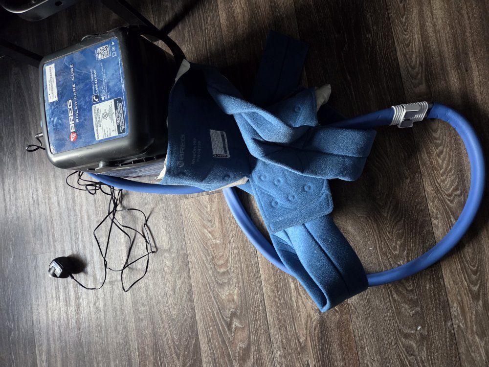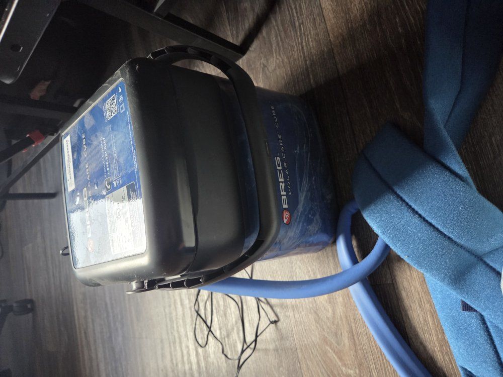 Reliable Breg cold therapy system includes the Polar Care Cube reservoir, power adapter, and a blue WrapOn hip pad. This unit is designed for post-operative recovery or injury management. The reservoir has a black lid and clear base to monitor ice levels. The hip pad is blue with adjustable straps for a secure fit.Used once in perfect condition!!!