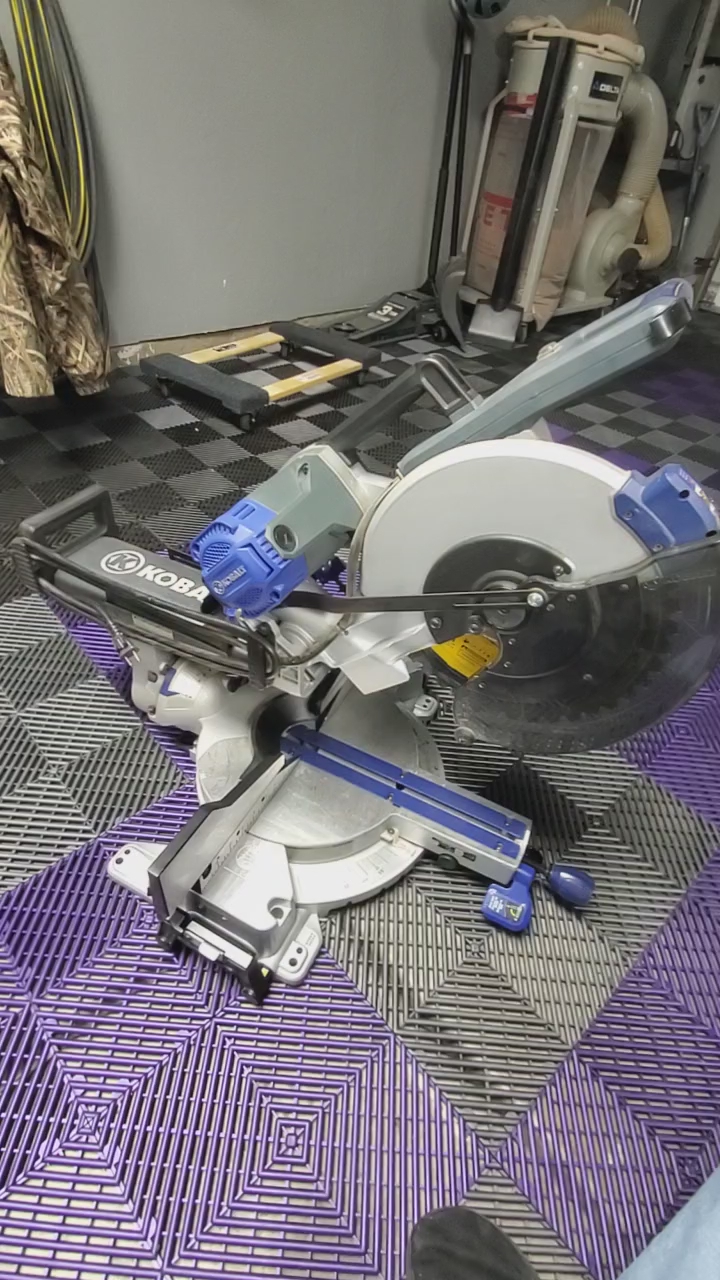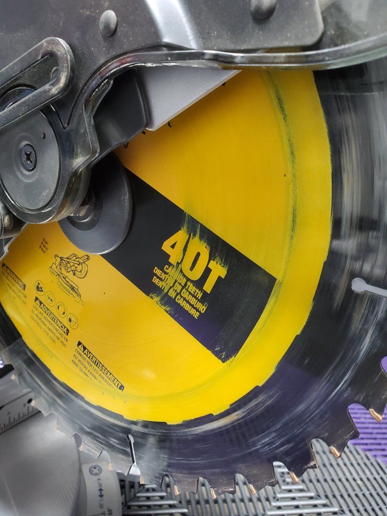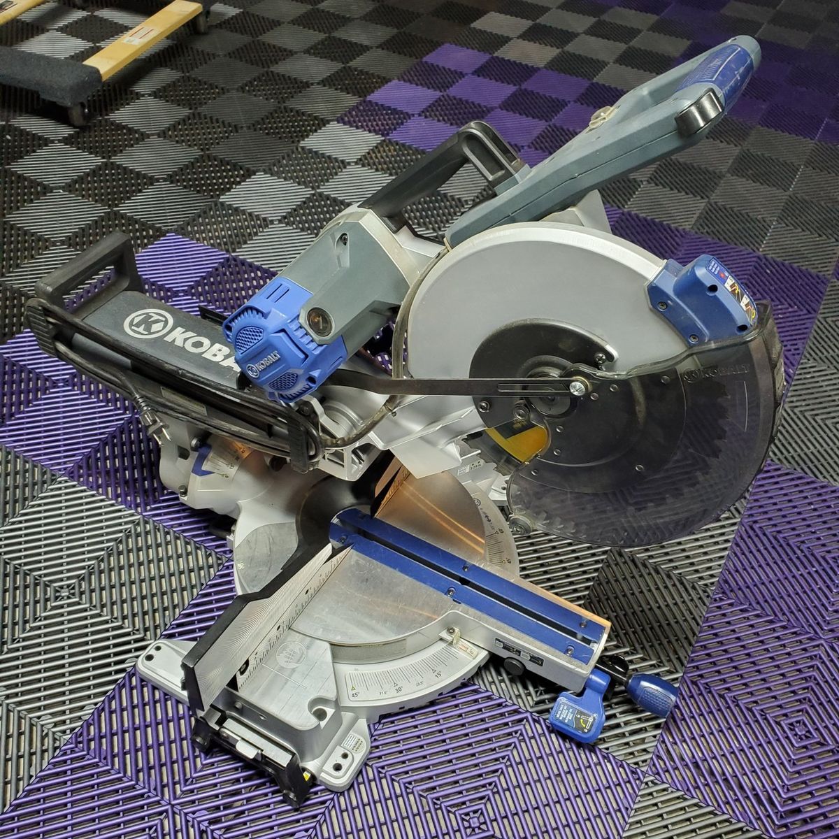 12 inch sliding Kobalt miter saw with a 40 tool DeWalt blade that is still sharp. Everything Works. Just upgraded because there was a new one on sale. Text only.