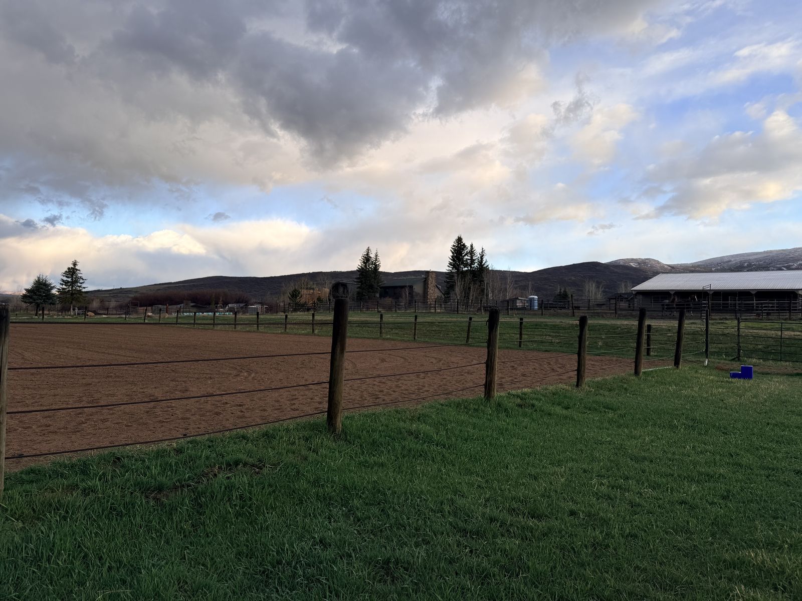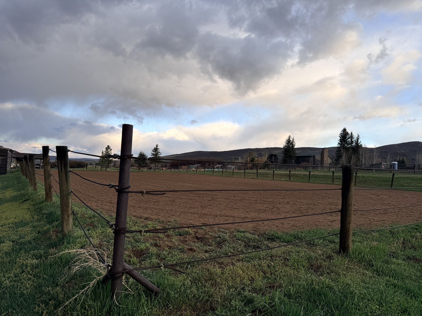 Metal corner posts, all wood posts & 4 strands of steel aircraft cable. Approximately 168' x 94', all in very good condition. Would be over $12k new.