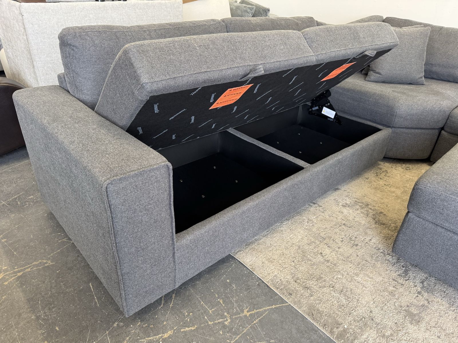 Features: • Modern Style with a Clean Look • Hidden Storage Seats on Both Sides • Storage Ottoman with Generous Storage Space • Zipper Attached Back Cushion Holds Cushions in Place • Wide Track Arms