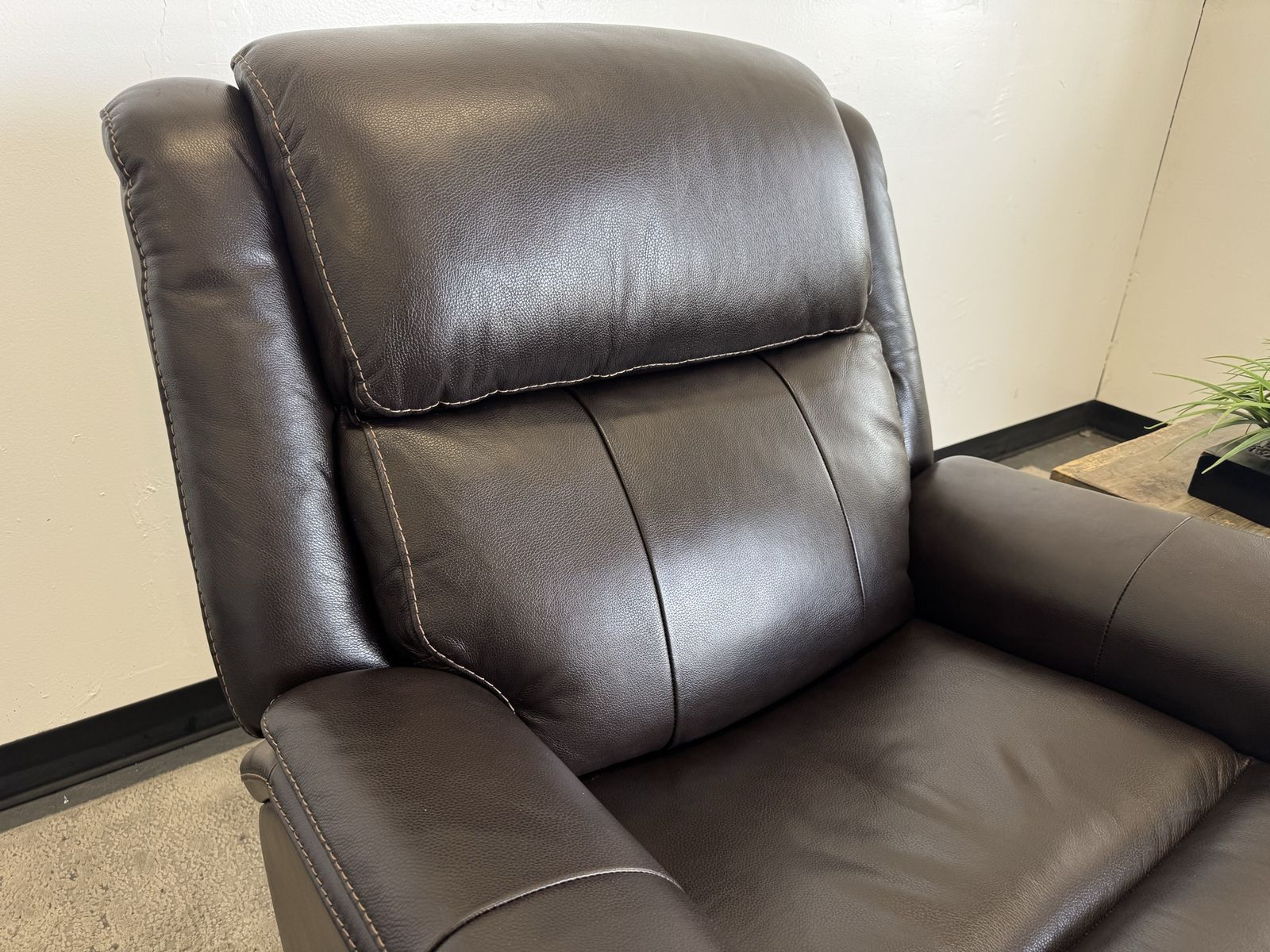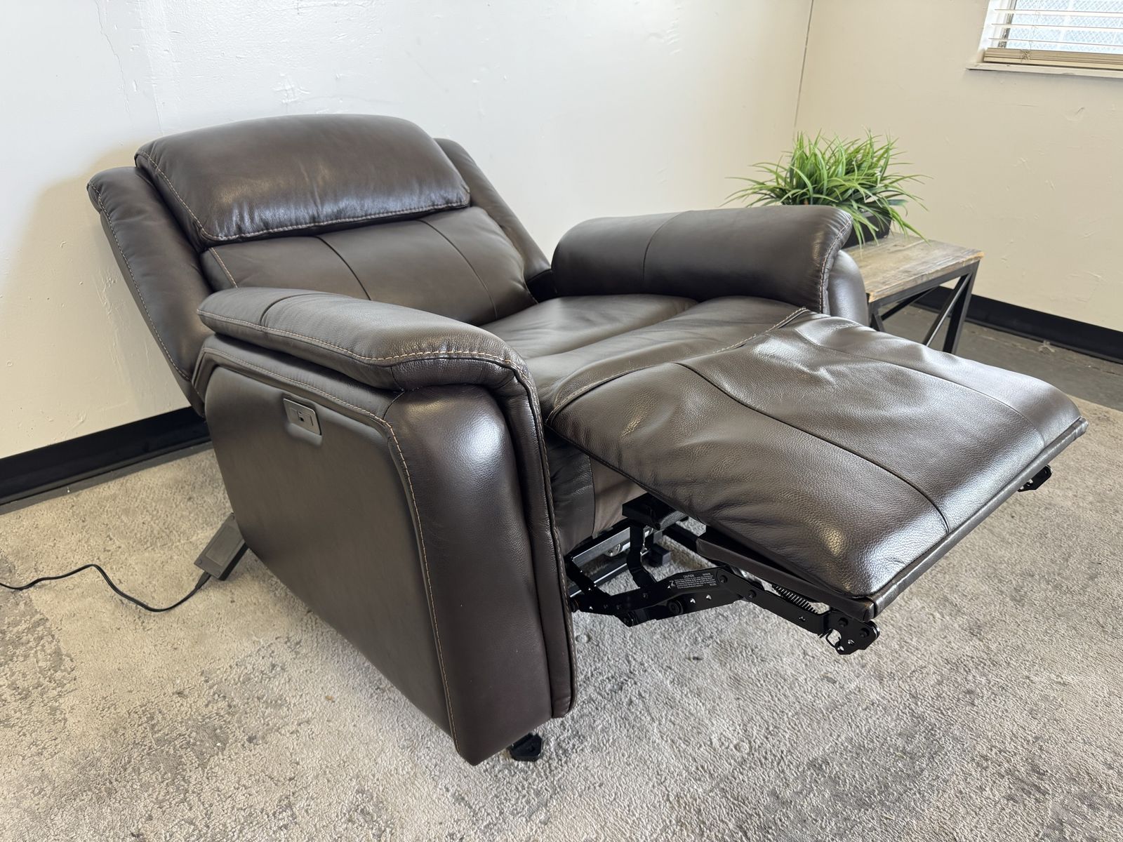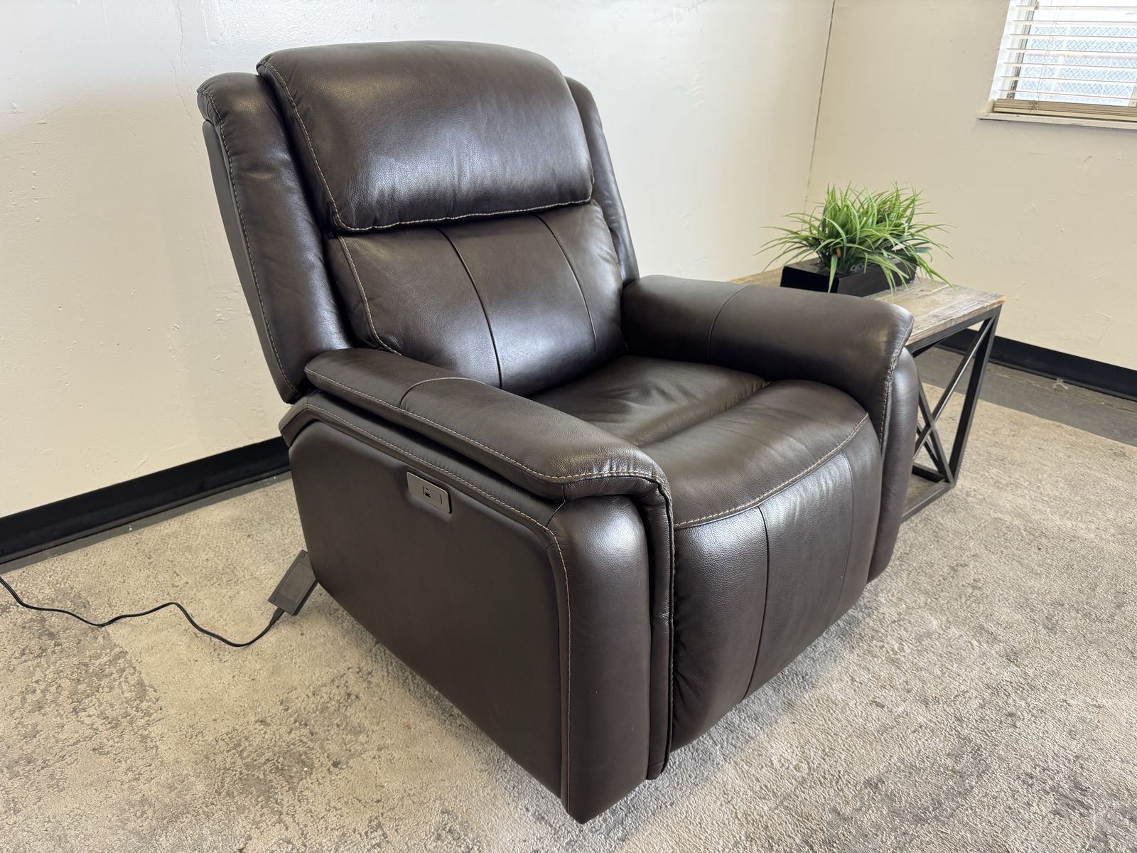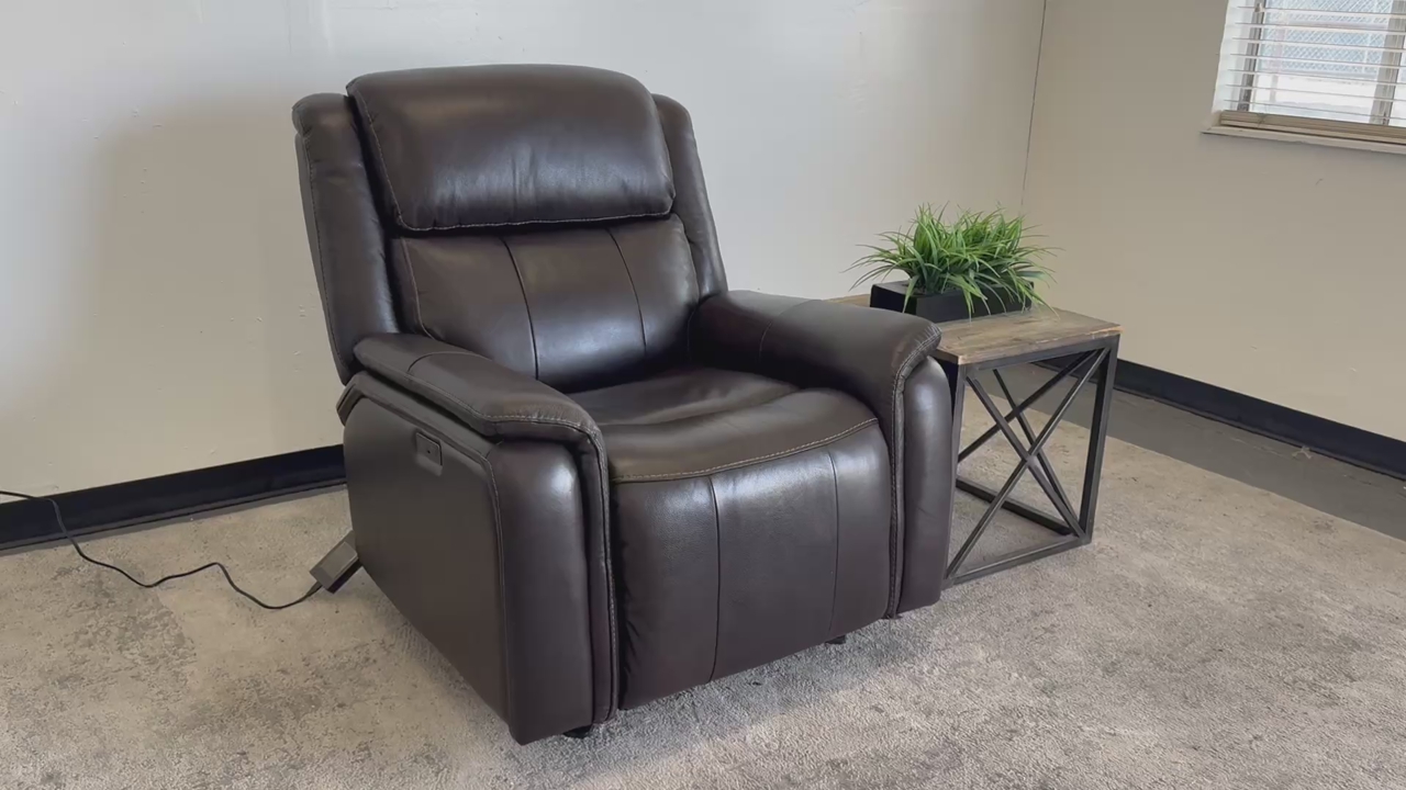 Features: Top Grain Leather with Polyurethane Match On Sides and Back Padded Arms Power Rocker Recliner with Power Headrest Bustle Back for Lumbar Support USB and USB-C Port