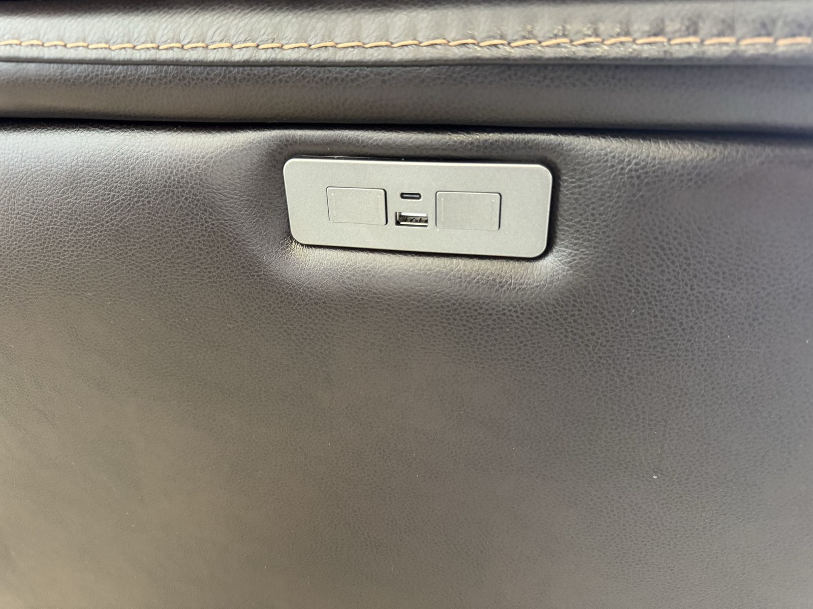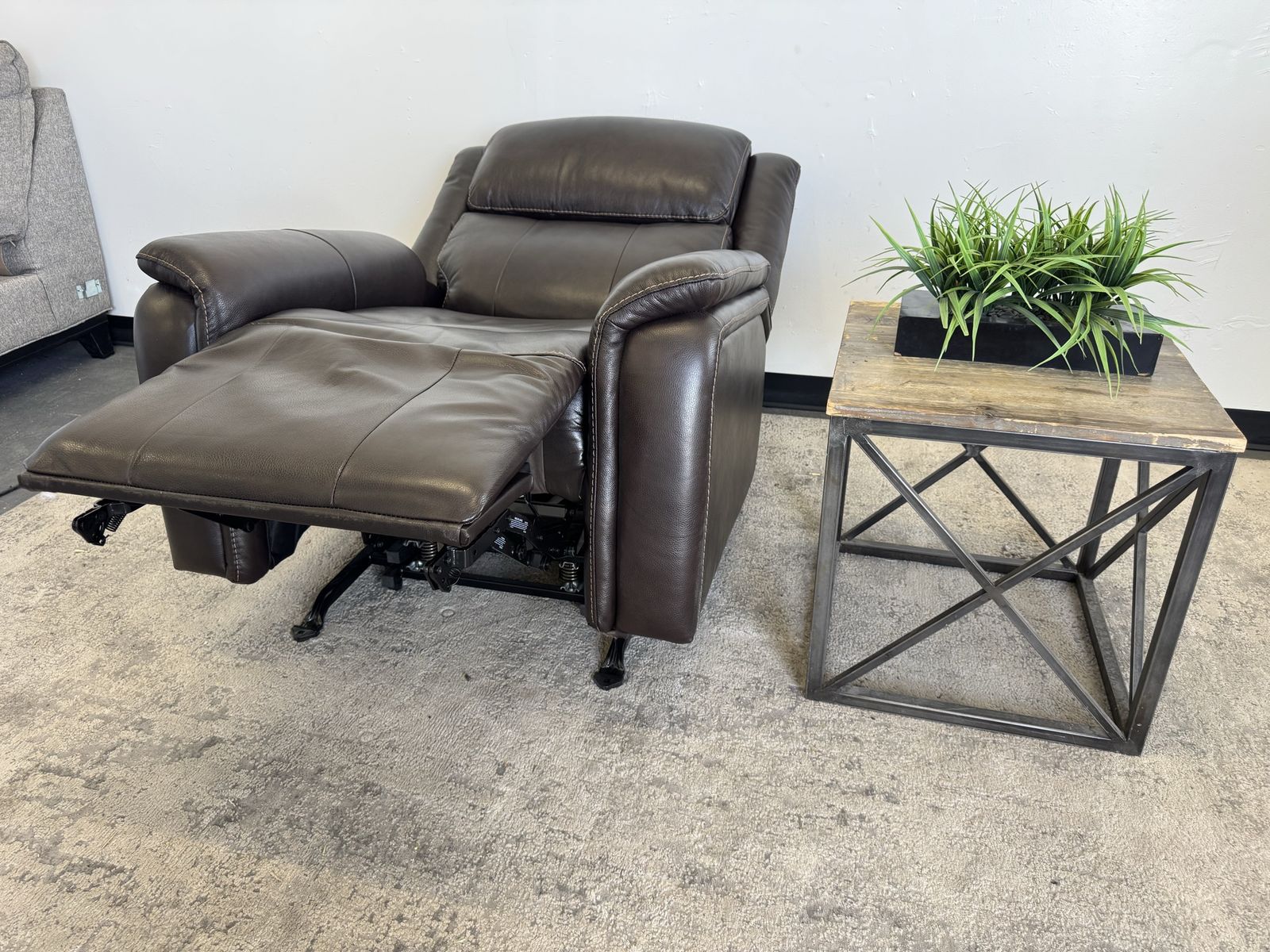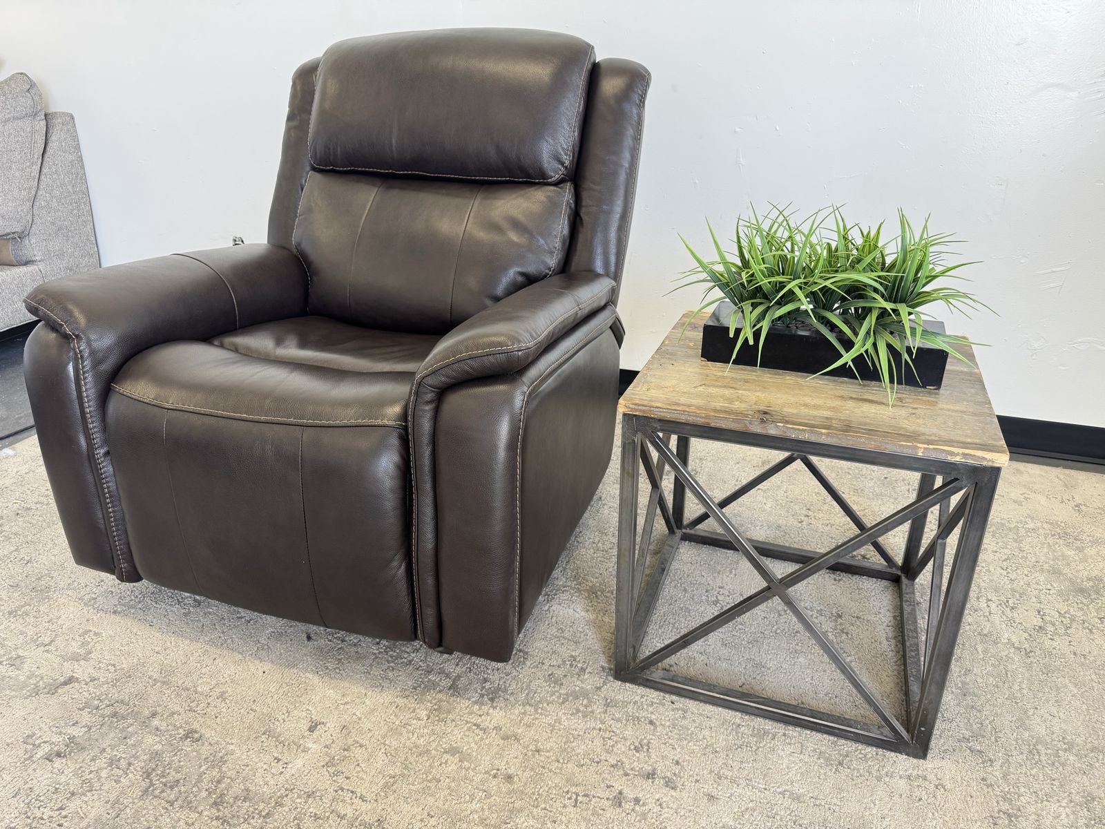 Features: Top Grain Leather with Polyurethane Match On Sides and Back Padded Arms Power Rocker Recliner with Power Headrest Bustle Back for Lumbar Support USB and USB-C Port