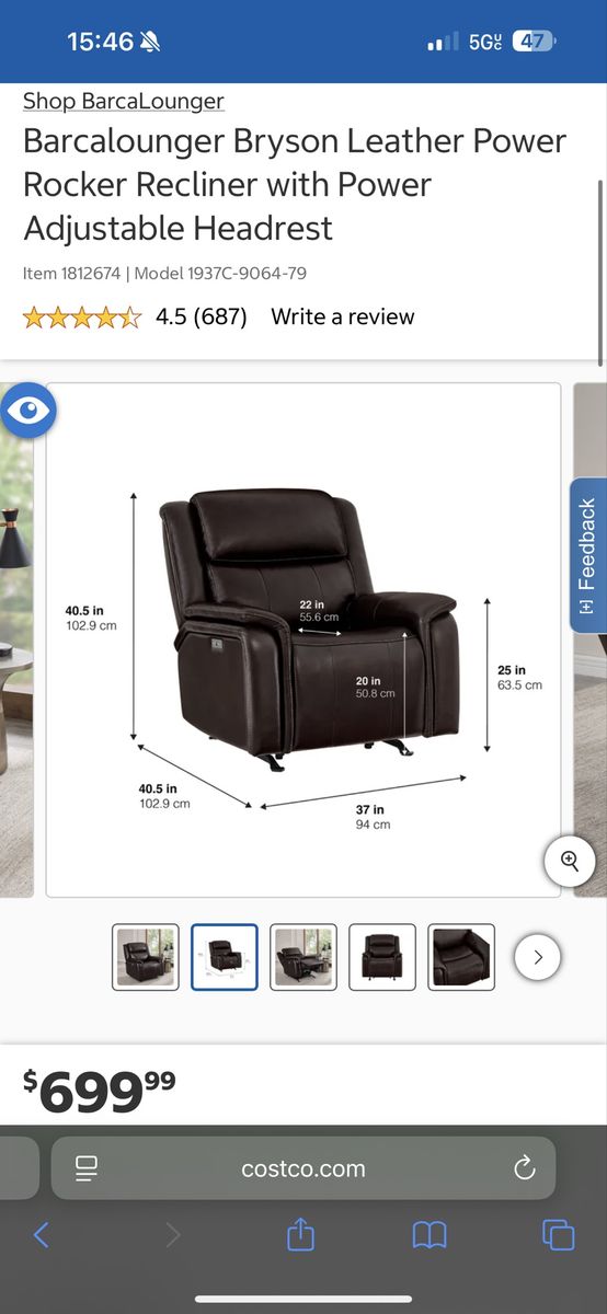 I am selling a Costco Barcalounger Bryson Leather Power Rocker Recliner Chair with Power Adjustable Headrest in like new condition!