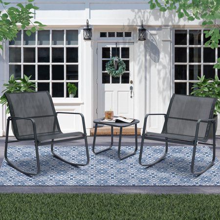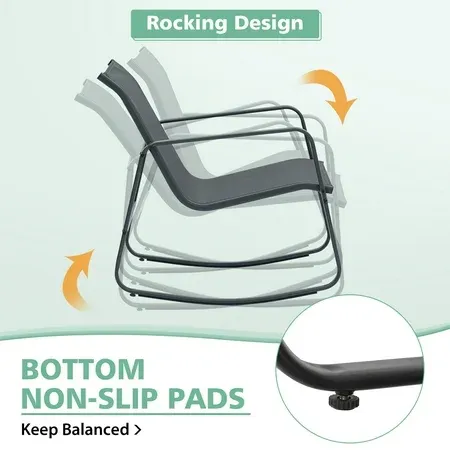 The set includes two modern rocking chairs. A sturdy coffee table completes the three-piece set. The furniture features a sleek black color. Chairs are constructed with breathable Textilene fabric, designed to remain cool even in summer. The Textilene material is tear and weather resistant. Textilene fabric is easy to clean. Chairs offer a wide and deep seating area for enhanced comfort. Ergonomically designed chair backs provide an elevated relaxation experience. The furniture is built with a powder-coated steel frame for durability. The frame includes a rust-resistant coating, offering protection against corrosion and ensuring longevity. The coffee table features a heat-resistant tempered glass top. The tempered glass tabletop facilitates easy cleaning. The rocking design provides an effortless gliding motion for tranquil relaxation. Chairs are equipped with a slip-resistant bottom, ensuring secure footing and a smooth rocking sensation. All necessary parts, tools, and instructions are included for straightforward assembly. Optimized installation steps allow for assembly in approximately 15-30 minutes.