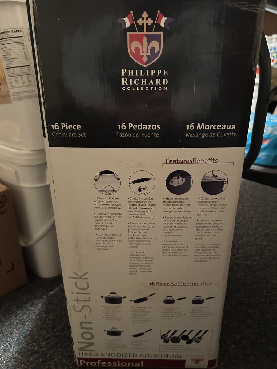 VenmoProfessional Philippe Richard 16 piece cookware set. Brand new in box. Has non-stick hard anodized aluminum pots, pans, and cooking utensils. Great for any kitchen.