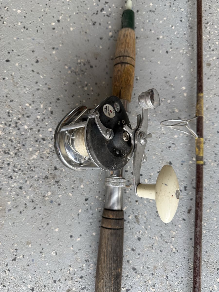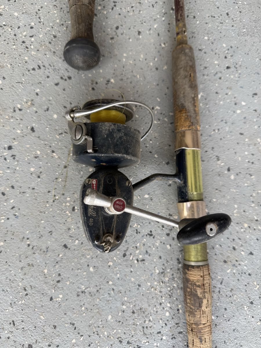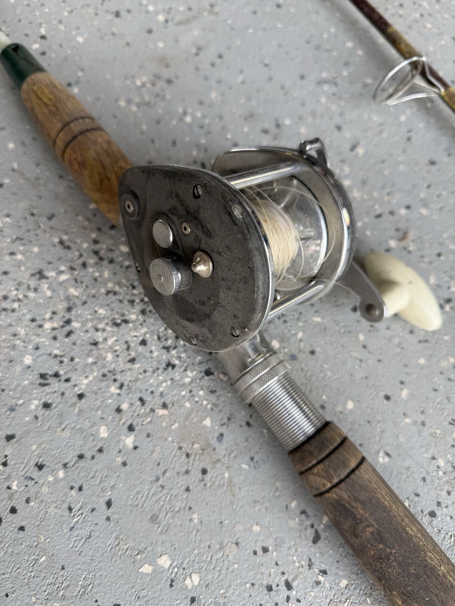 Selling two older fishing rod and reel setups. Both have a classic look with cork handles and metal reels—great for collectors, restoration projects, or decorating.