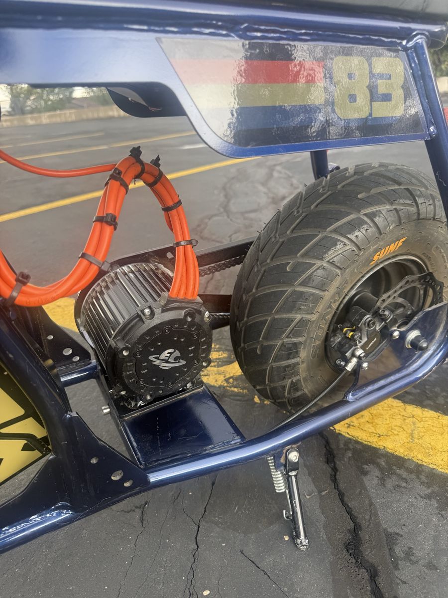 Venmothis bike has less then 100 miles. has an upgraded motor and controller from electro and co. goes around 50-55 on a full charge. comes with brand new spare tires. great bike.