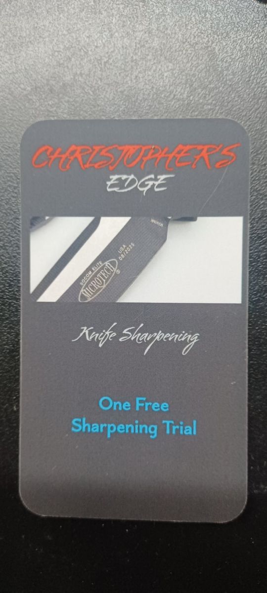 PayPalChristopher's Edge Knife sharpening for Pocket Knives and Fixed Blades and Kitchen Knives and Steak Knives. Serrated Knives, Pruners and Juniper and Wood Planes and wood flat chisels. and Scissors. One Sharpening Trial is free then after that its $20.00 a knife, if you bring me more than 8 I'll discuss a bundle deal with you. Please see my Facebook Page as in the picture for the item's I've sharpen via pictures and videos. Also for my Contact Information. I don't use a Sand Belt Grinder unlike others do, and make you wait a week to get it back. I use a precise system. sand belt grinders ruin your heat treatment on the cutting edge especially if someone doesn't know what they'll doing. depending on the knife take me half a day or a day or more depending how many you want me to sharpen. but I'm pretty good at getting back your knives and scissors and cutters back to you. please see my Facebook page for more details and videos and pictures to see the results. I have two Clients right now and they love my work. There's no hidden fee and my prices include Lubricanting and cleaning. depending on the condition of the knife cleaning may or may not be applied.