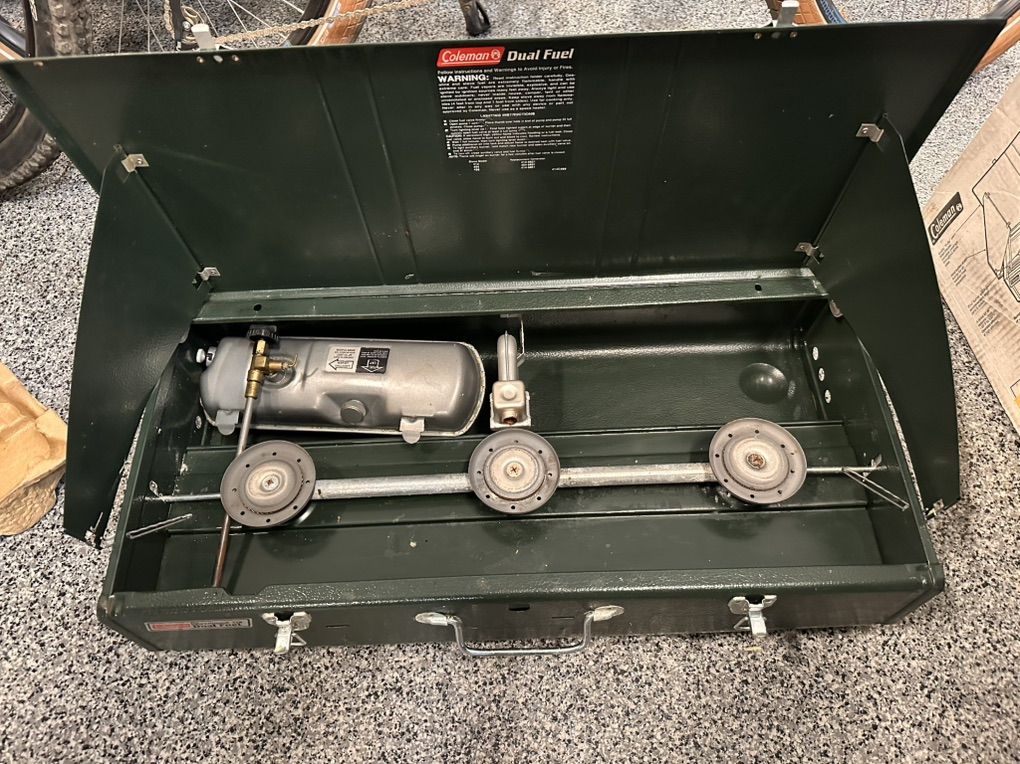 VenmoThis is a Coleman three burner dual fuel camping stove. Everything in excellent condition. This has been used one time. It is a Coleman three burner dual fuel camping stove. Complete with fuel tank, grates, and wind panels. They don't make it like this anymore. This is a good quality stove. Pickup in Midway or happy to meet you in Salt Lake or Provo area.