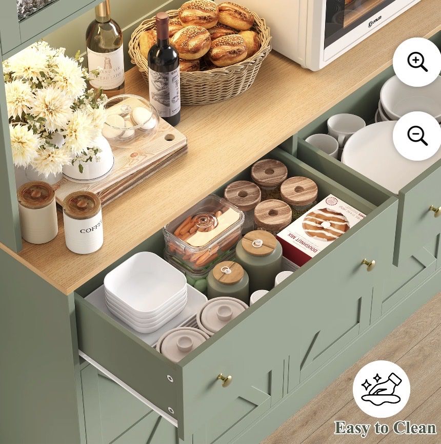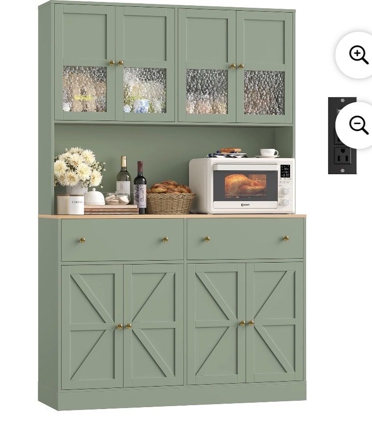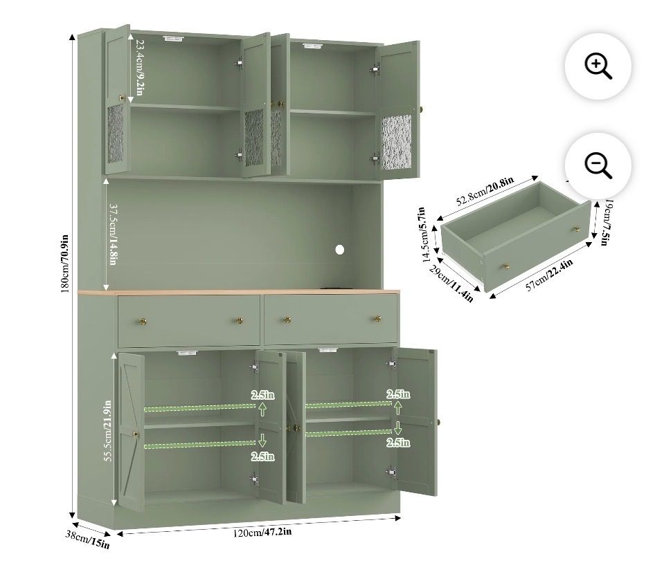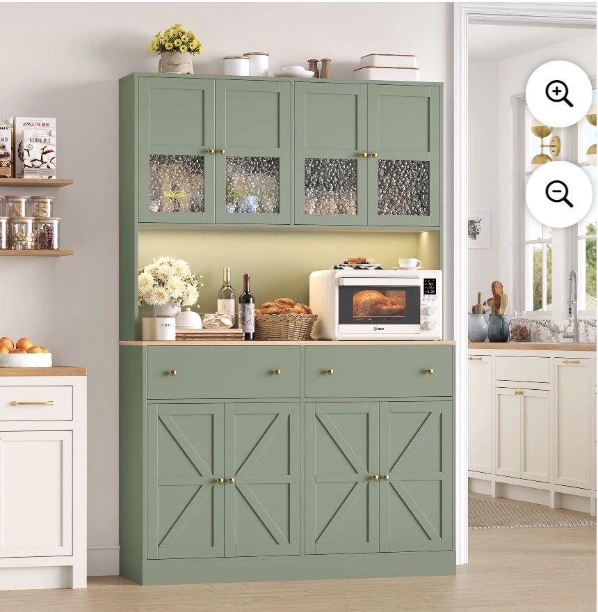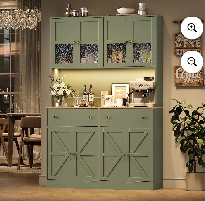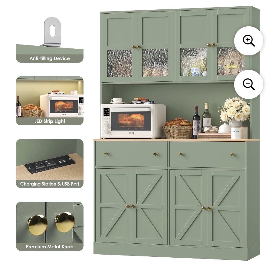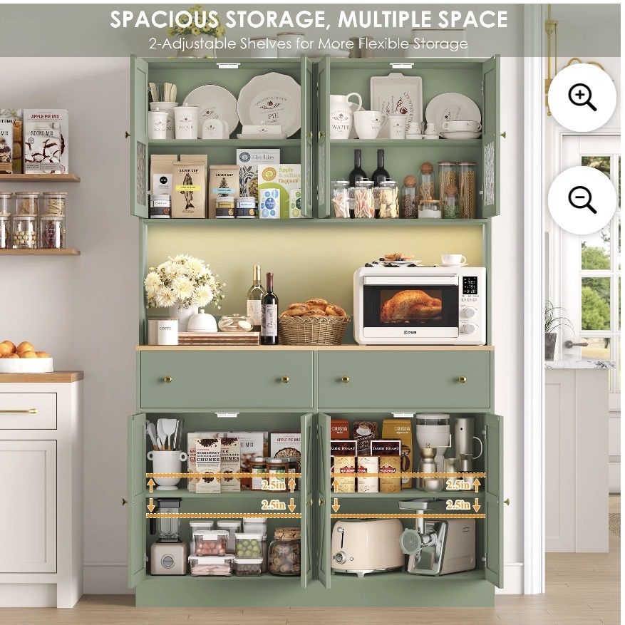 Tall Buffet with Ample Storage8 Doors + 2 Drawers,this kitchen storage cabinet provides plenty of space to store kitchen essentials, pantry items, and more. Built-In LED LightingThe hutch cabinet comes with integrated LED lights, offering illumination for your display items or workspace. Kitchen Pantry with Charging StationEquipped with a built-in charging station and USB port, making the homfa kitchen pantry convenient to charge your devices while cooking or working in the kitchen. with 2 Adjustable ShelvesThe farmhouse pantry cabinet customize the interior layout.You can adjust the shelf height 2.5in up to down. to accommodate items of different sizes. Stable & DurableThis modern pantry is made of eco-friendly premium MDF wood for superior stability and long-lasting durability. Featuring a sleek wood finish, the tall buffet sideboard is resistant to moisture, corrosion and wear. Easy AssemblyAll parts are numbered and detailed assembly instruction is provided, you can finish the large pantry's assembly within 1 hour.