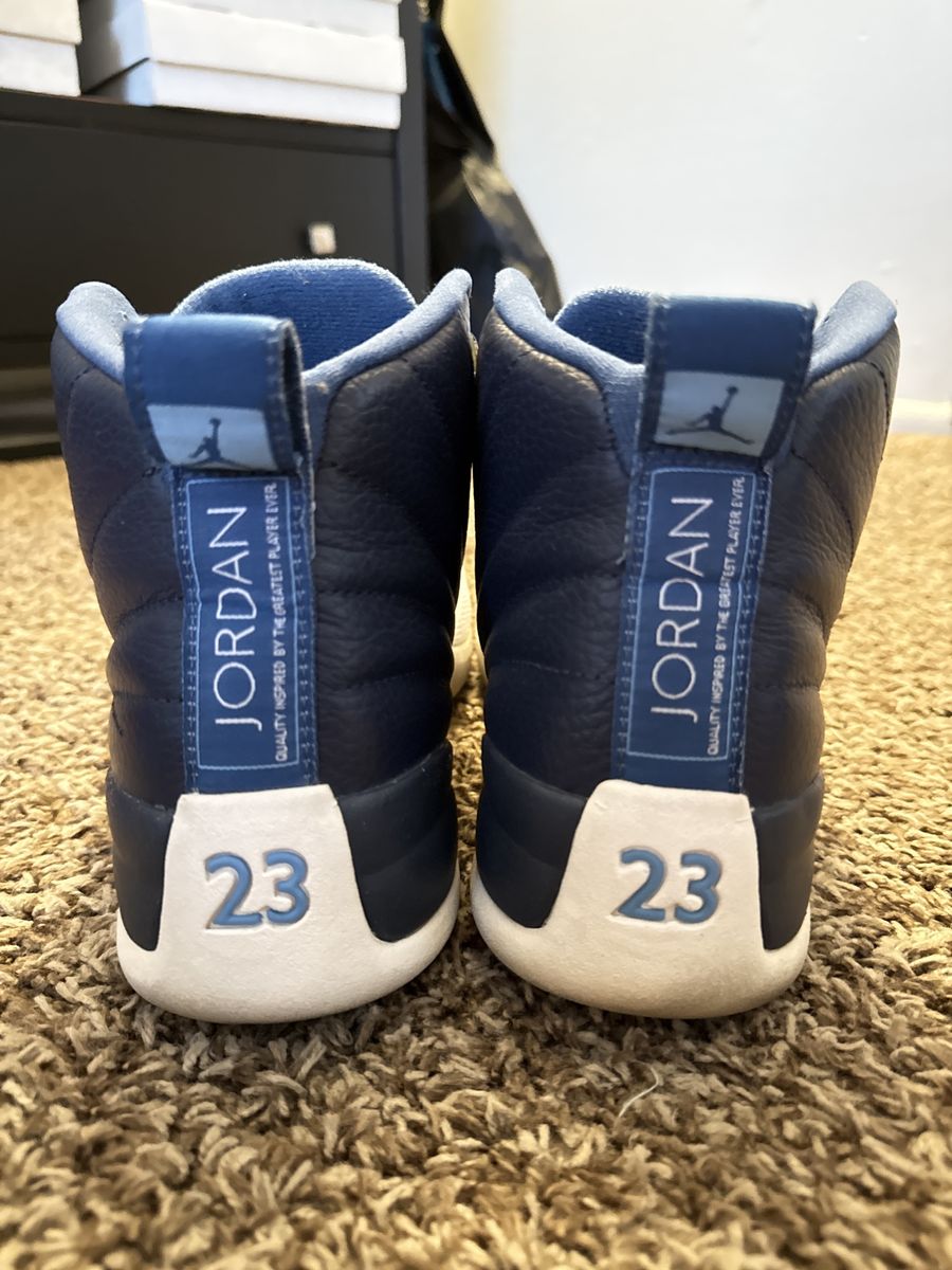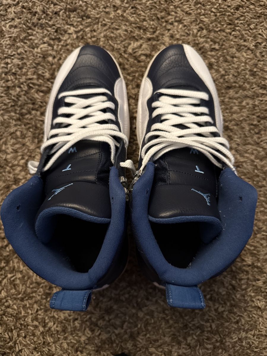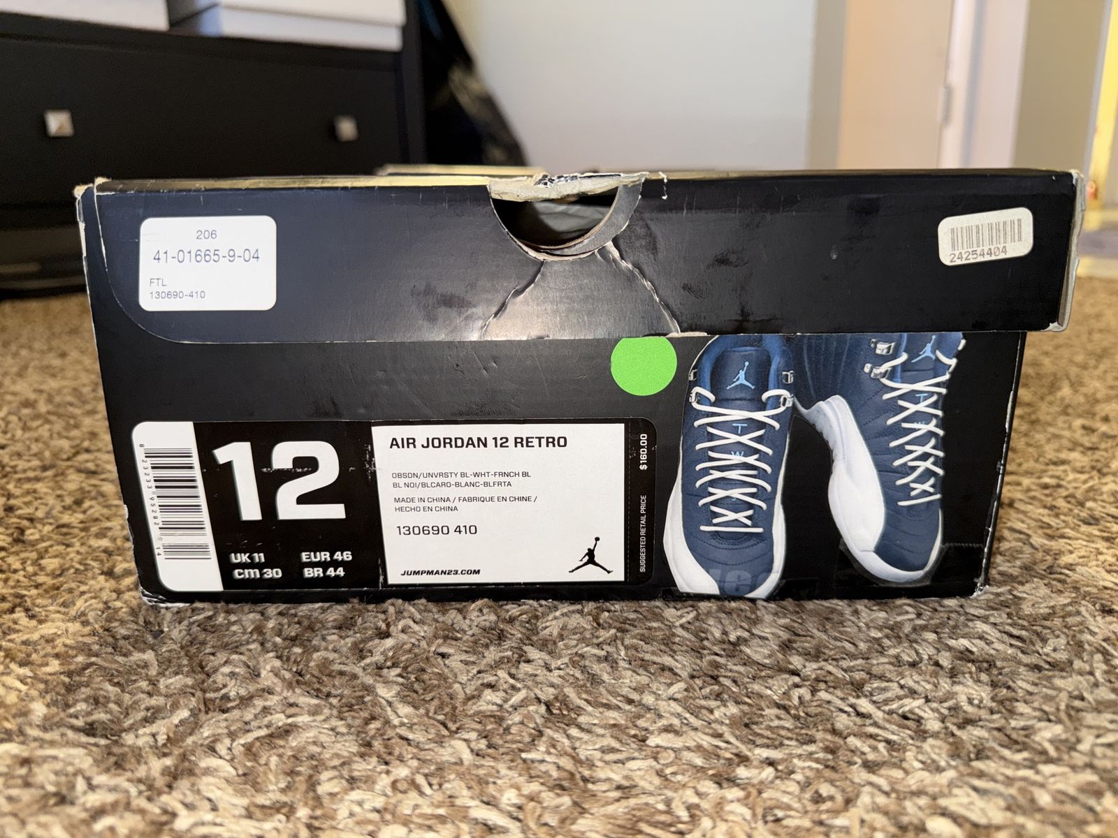 ApplePayNike Air Jordan 12 Retro sneakers in the Obsidian colorway. Dark navy blue leather upper with white and light blue accents. Released in 2012, originally $160 retail. Worn but well maintained, no creasing, aftermarket laces, uppers clean, light wear on the bottom. Original box included.