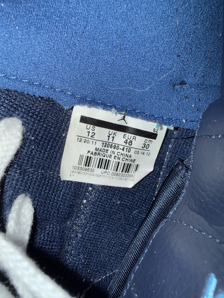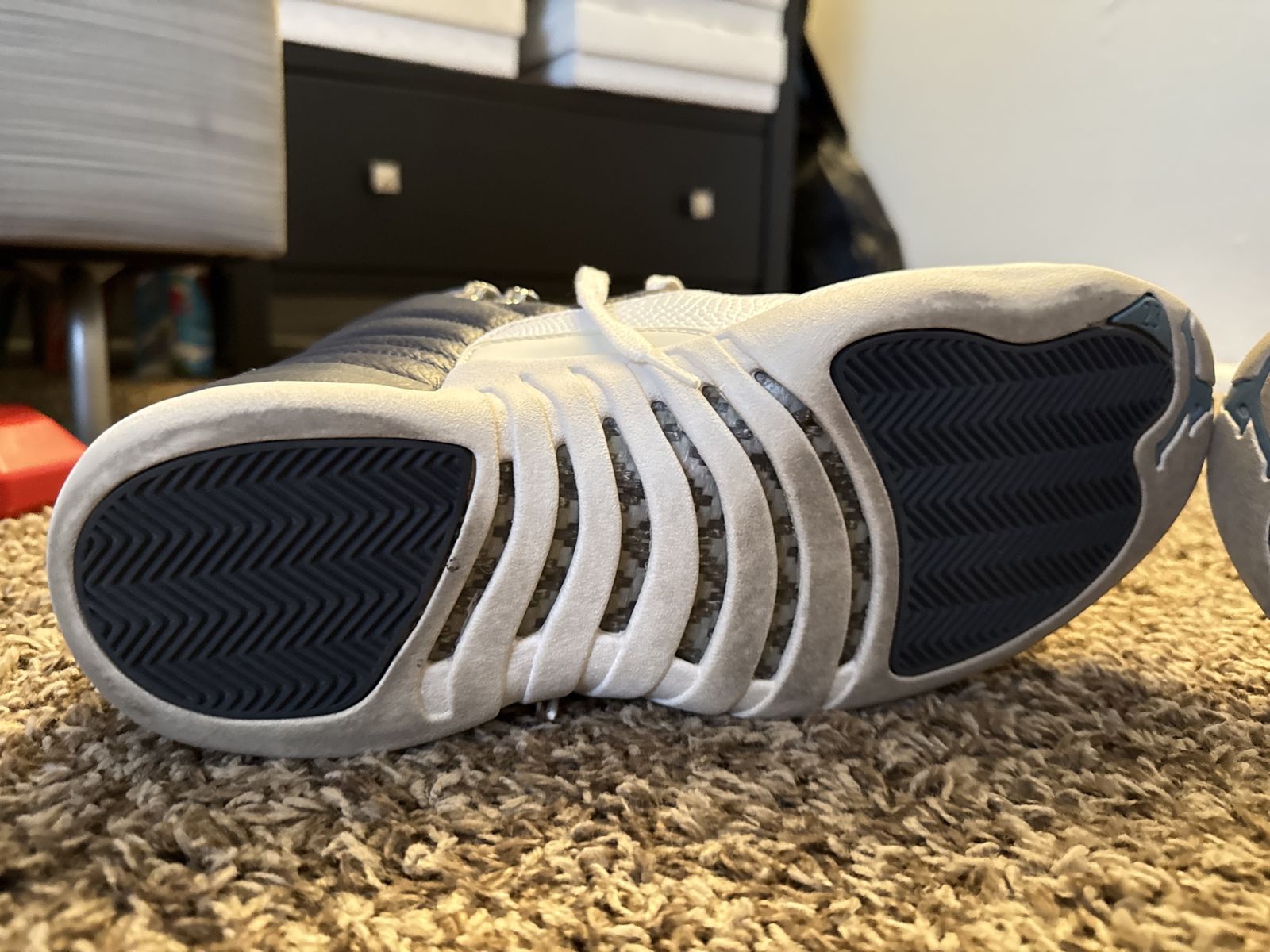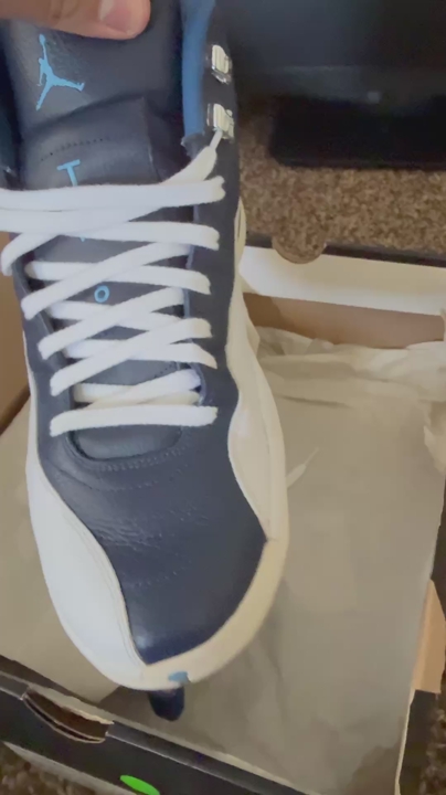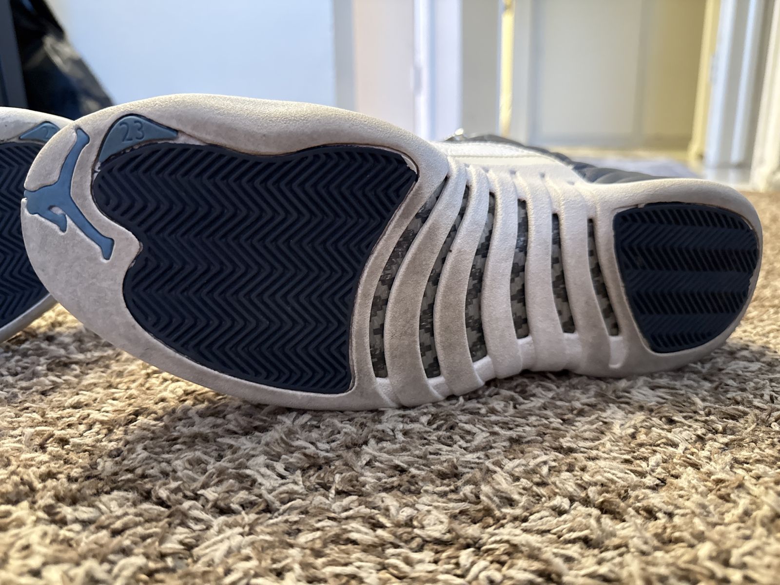 ApplePayNike Air Jordan 12 Retro sneakers in the Obsidian colorway. Dark navy blue leather upper with white and light blue accents. Released in 2012, originally $160 retail. Worn but well maintained, no creasing, aftermarket laces, uppers clean, light wear on the bottom. Original box included.