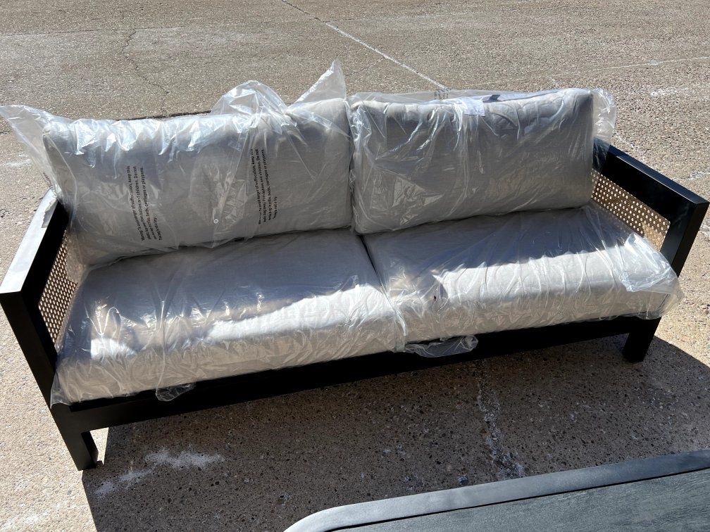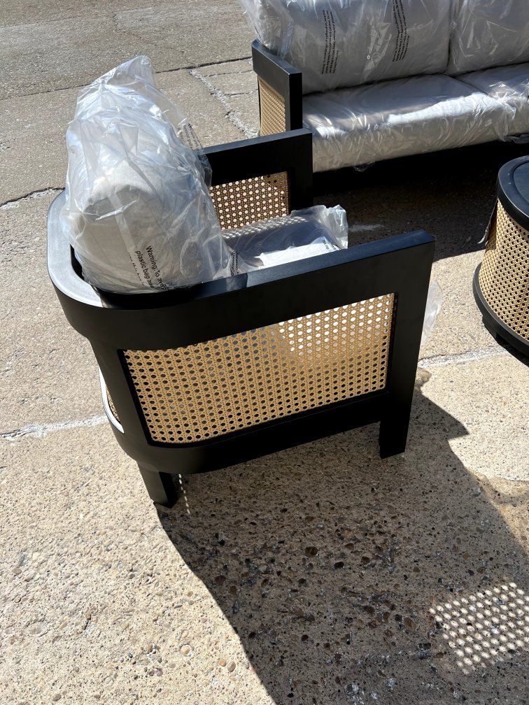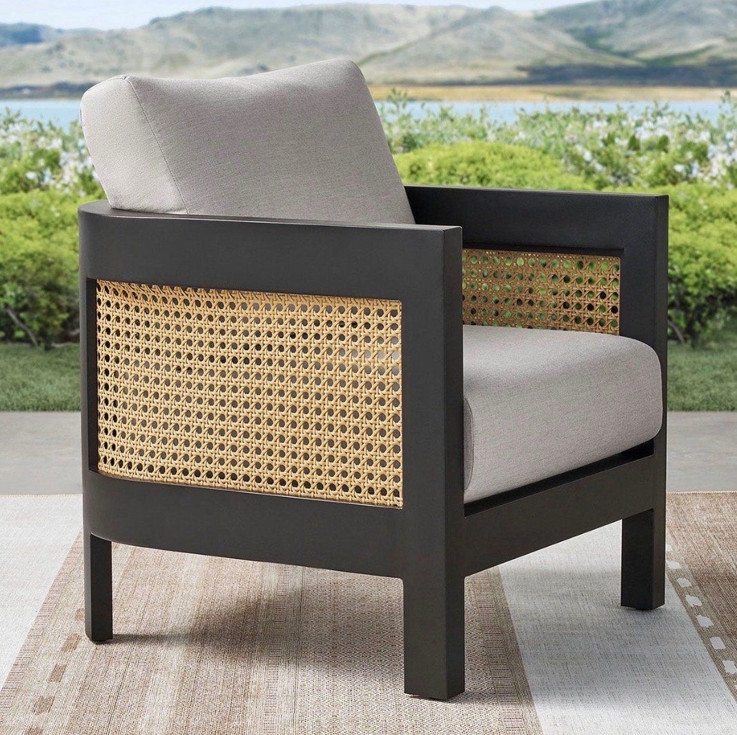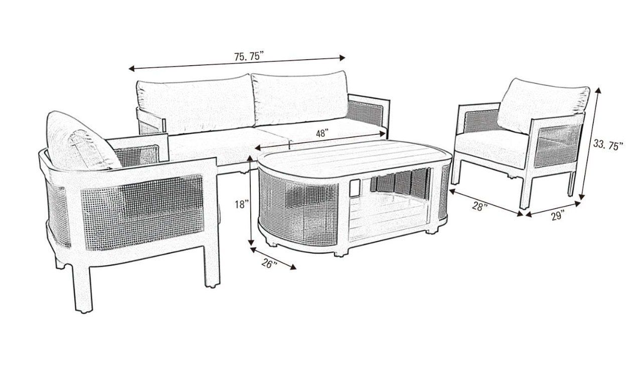Set includes a sofa, two chairs, a coffee table, seats up to 5 Constructed with black wood tile, rust-resistant aluminum frame, and cane wicker Offers exceptional outdoor performance with a rust-proof aluminum frame and Sunbrella® cushions resistant to fading, mold, and mildew Cushions featuring Sunbrella® fabric in Cast Silver