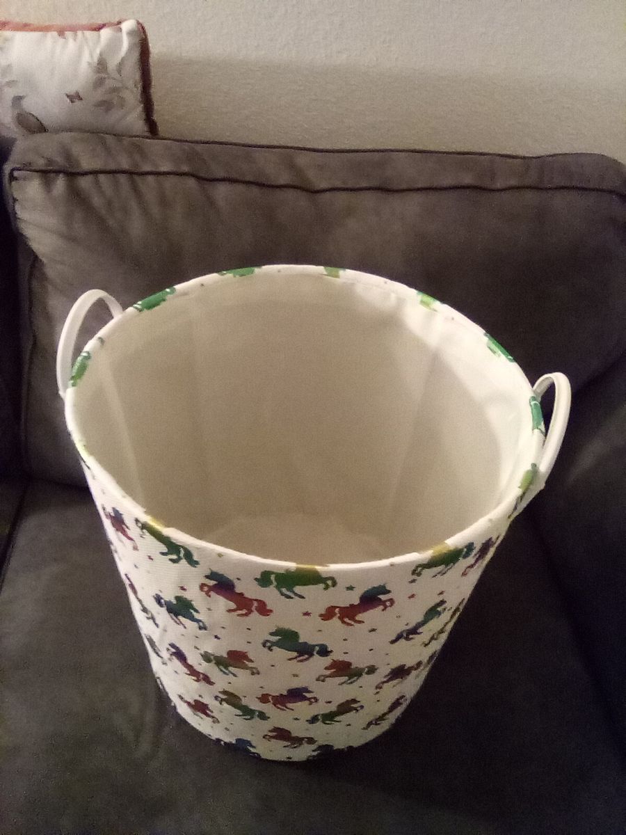 I have a unicorn hamper/ tote that is like new. It is round/ cylinder shaped, and has rainbow unicorns all around it. It has handles on the sides for carrying a variety of items. It is about a 1 foot and a half tall and about 1 foot and a half across the top. Asking $10.00. If you want this send me a text.