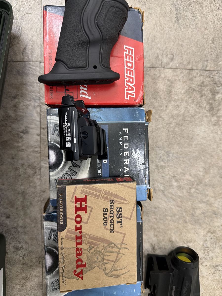 Glock holsters sig p365 holster Ruger scope a couple boxes of 20 gauge shells and hornady slugs a fixed blade knife 200 rounds of 9mm and a sig Romeo-m8r and an olight Valkyrie pl-mini 2 wanting to get 223 or 556 ammo for my ar or other stuff fir guns ar parts or trigger optics gun accessories