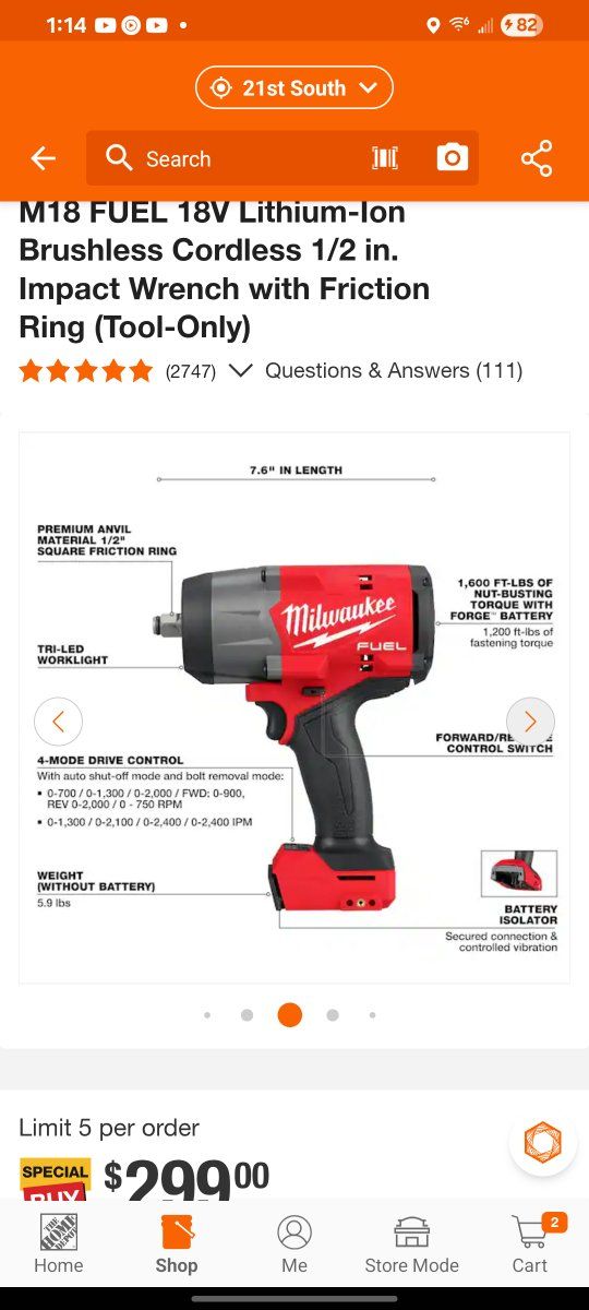 VenmoAbout This Product comes with 1x 5ah battery and charger The MILWAUKEE M18 FUEL ½" High Torque Impact Wrench w/ Friction Ring is the most power-dense impact wrench in its class, provides greater access in tight spaces, and maximizes productivity through faster removal speeds. The POWERSTATE Brushless Motor delivers up to 1,100 ft-lbs of Fastening Torque and 1,600 ft-lbs of Nut-Busting Torque when paired with the M18 REDLITHIUM FORGE Batteries, while the compact size at 7.6" in length gives users greater access in tight spaces. The M18 FUEL ½" High Torque Impact Wrench w/ Friction Ring maximizes productivity on the jobsite and in the shop by removing stubborn bolts and fasteners faster than cordless competitors. The patented battery isolation system provides a secure battery connection and controls vibration transmitted to the pack. Tri-LEDs surround the anvil to deliver brighter light with fewer shadows. 4-Mode DRIVE CONTROL offers greater precision with a range of pre-set RPM and IPM levels, selectable from a single button on the tool. By selecting Mode 4, AUTO SHUT-OFF control applies no more than 50 ft-lbs of torque for hand-tight fastening applications to prevent overtightening. Mode 4 also features Bolt Removal Control that delivers users full torque output, then decreases RPMs once the bolt is loosened to prevent fastener drops. The ½" Friction Ring design allows for quick & tool-free socket changes.