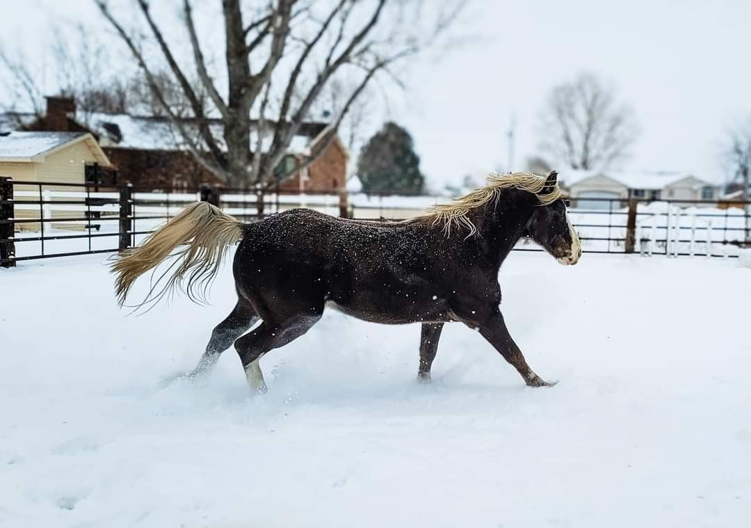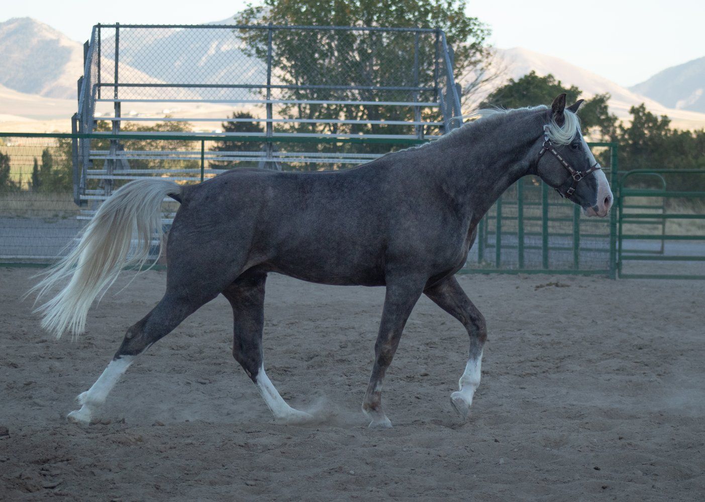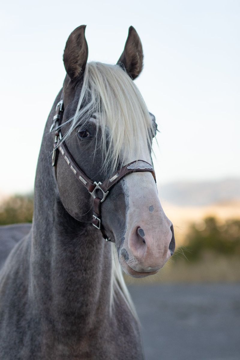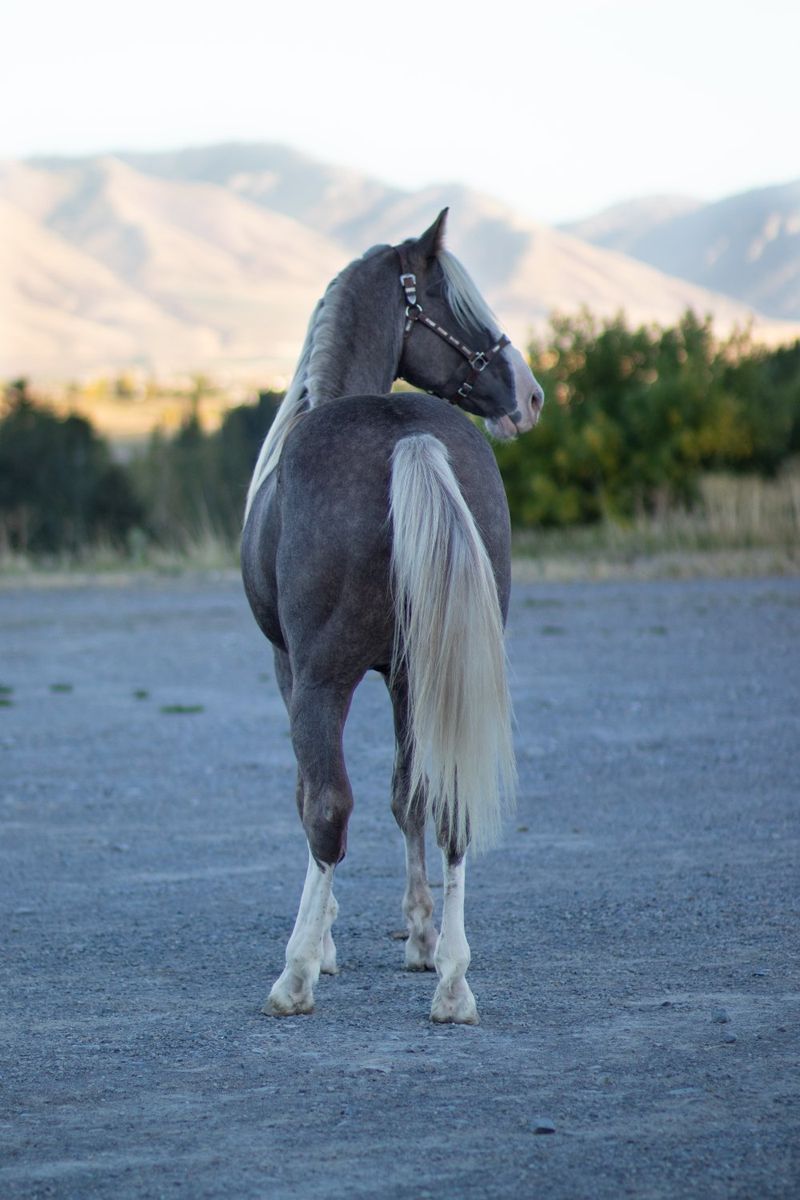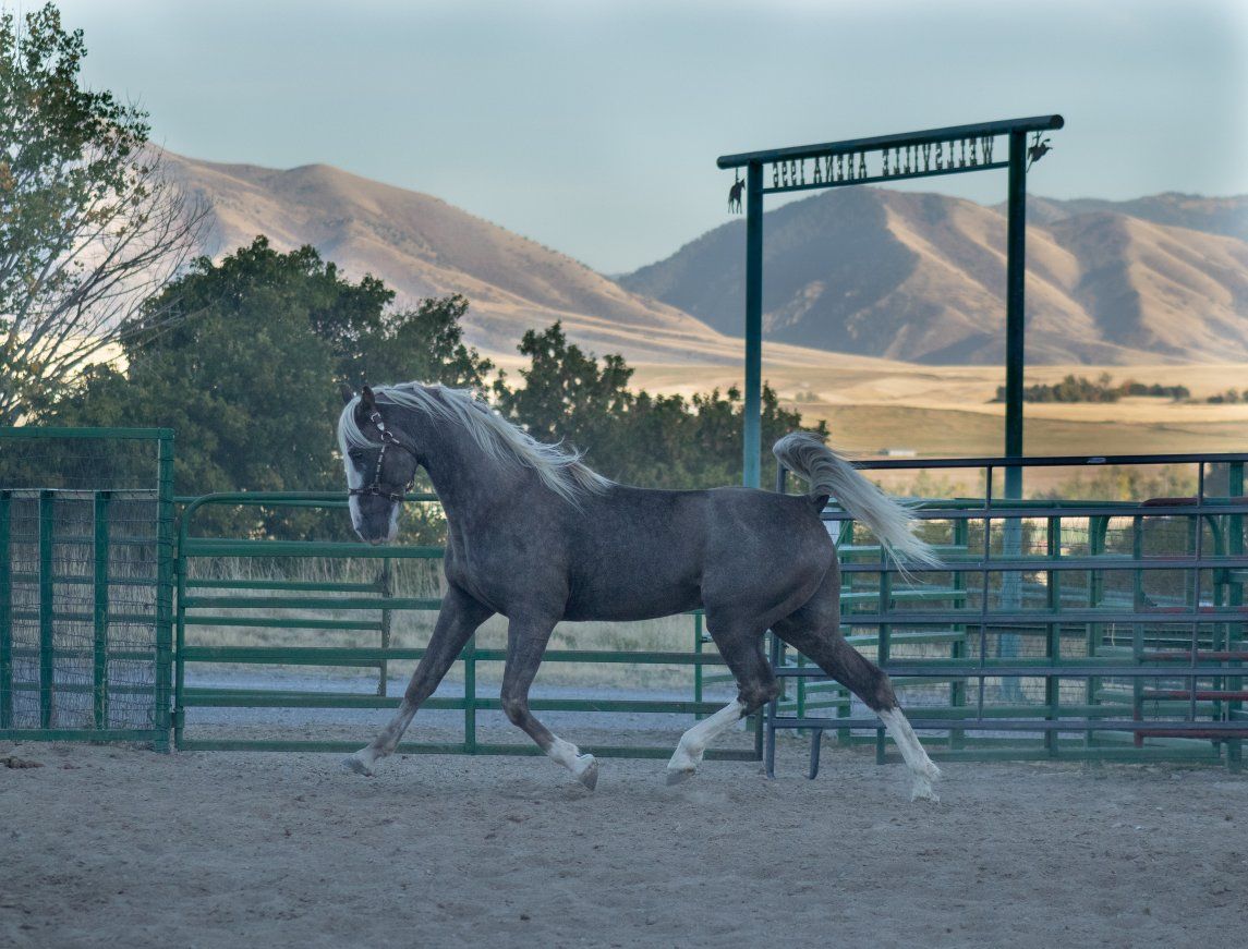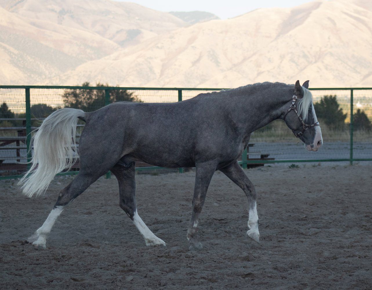 Patronus is a registered silver dapple sabino Tennessee Walking Horse stallion by a son of Jon Allred’s, Blue Diamond Dealer and out of a daughter by the world grand champion Santana’s El Nino. He’s big boned and tall standing at 16.1hh. He has the demeanor of a big dog and is so nice to handle. He is a working stallion who has spent many hours on the trail, riding alongside mares most rides. He has excellent manners and exceptional stamina. He can flat out walk a hole in the ground and can cover a lot of miles any given day. He’s one of the best papered stallions in the west with several WGC’s and HOF’s in his pedigree.